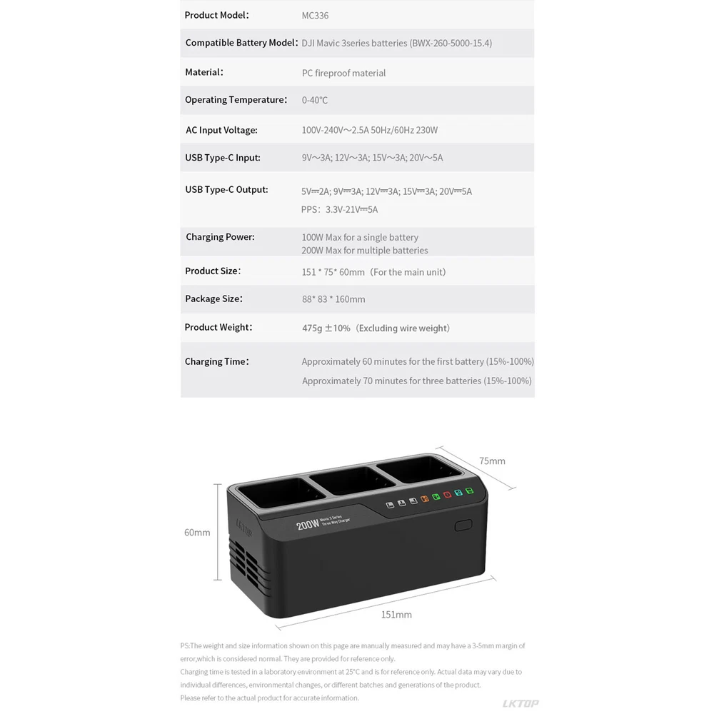 GFY09010E12SPA/GA91S2H Fan Graphics Card for ZOTAC GTX1070 MINI/GTX1060 AMP Kit 10.23 CAD 11.63 CAD 2.99 CAD 12% off USB Charging Cable Data Cable Line for Logitech G Pro Wireless Mouse Parts 10.64 CAD 12.09 CAD 0.99 CAD 12% off DIY Model Nuts And Bolts 0.6-2.0MM 1/72 1/48 1/35 1/16 Scale Model Accessories 12.91 CAD 14.67 CAD Free shipping 12% off SMA Antenna for YAESU FT-60R FT-50R VX-3R VX-5R VX-6R VX-7R VX-8DR Walkie-talkie 8.98 CAD 10.2 CAD Free shipping 12% off For NH35/NH36 Movement 41mm Watch Case Parts Sapphire Glass Steel Case Insert 26.41 CAD 30.01 CAD 3.99 CAD 12% off For Xbox 360 Gamepad Controller Full Shell Cover Buttons Mod Conductive Glue Kit 9.24 CAD 10.5 CAD Free shipping 12% off IMSI TMSI OTA SIMHUB SIM Card Update for iPhone 11 Pro Max/11Pro/11/Xs Max 10.12 CAD 11.5 CAD Free shipping 12% off GPS Locator Tracker Alarm Key Finder Pet Locator Smart Tag Bluetooth Anti Lost 9.09 CAD 10.33 CAD Free shipping 12% off For Leica 384-643 M691 Microscope Lamp WILD-50 12V50W HLX4643 Halogen Lamp Bulb 31.14 CAD 35.39 CAD 5.0 CAD 12% off Silicone Ball For PS3 Move VR Motion Controller Game Handle Ball 8.44 CAD 9.59 CAD Free shipping 12% off 1Pair GA82S2H Cooler Fans For GALAX P106-100 3GB/6GB Graphics Card Cooling Fan 16.24 CAD 18.45 CAD Free shipping 12% off 2PC Volume Knob And Channel Knob FM Power Switch Cap For P200 HT600 MT1000 Radio 9.03 CAD 10.26 CAD Free shipping 12% off DIY Model Sand Paper Holder Glue-free Sanding Board Model Kit Repair Accessories 13.64 CAD 15.5 CAD Free shipping 12% off For Tamiya RS-1603 Model Paint Spray Gun Spray Paint Tool Spray Tool Holder Part 9.18 CAD 10.43 CAD Free shipping 12% off For DJI Mini 3 PRO/MAVIC3/Air 2S/DJI RC Pro Screen Controller Lanyard Neck Strap 10.47 CAD 11.9 CAD Free shipping 12% off For Xbox Series S/X Controller Faceplate Cover Shell Upper Lower Housing Casing 12.31 CAD 13.99 CAD Free shipping 12% off Silicone Sealing Seal Ring Gaskets For Nutri Bullet Flat Cross Blade 600W/900W 6.57 CAD 7.47 CAD Free shipping 12% off Multiful Shock Absorber Wrench Adjustment Tool for TRAXXAS E-REVO/ Summit RC Car 11.66 CAD 13.25 CAD Free shipping 12% off Product Description 3-Ways Fast Charging Battery Charger For DJI Mavic 3/3 Classic Drone Accessories Drone Charger 200W Fast Charging Three Way Charger Charging Accessories for DJI Mavic 3 Series Batteries Feature s: l Meet all day flight requirements. Only three batteries are needed l Six-fold Protection , ensuring safe charging. Strict and high standards for your peace of mind l Versatile and Convenient. One is enough when you go out . Charge three batteries simultaneously, with the first battery reaching full charge in about 1 hour l Charges a single battery at 100W, while the Type-C port supports up to 100W PD output charging . Fast charging, so you don't have to worry about forgetting to charge l Not just for charging, also functions as a power bank Specification: l Material: PC Fireproof Material l Color : Black l Types: European Standard, Chinese Standard, American Standard l Size: 151x75x60mm l Applicable M odel : for DJI Mavic 3 Series Batteries Package: l 1x Charger Payment Shipping Returns Contact Us About Us We mainly accept payment through PayPal. Payment should be done within 7 days after the end of the Auction. Otherwise Unpaid Item Dispute will be filed with eBay. Please list your special requests (color, packages, etc.) in the PAYPAL NOTES SECTION when you make payment. We offer Standard International Flat Rate Registered Shipping service to all buyers in the world. We can also offer FedEx, DHL, EMS, TNT or UPS faster service if buyer is willing to pay extra cost. Product will be shipped within Handling time after full payment is received and verified. It normally takes 7-12 business days to United States. Delivery Time is about 15-25 business days to most of the other countries. We ship the package to your confirmed shipping address in PayPal. Please tell us your shipping address in time if it is different from the one in PayPal. The tracking number will be given for the customer to check the shipping status online (registered or faster service only). We are not responsible for any wrong or undeliverable addresses. Please verify and update your shipping address on PayPal during checkout. We offer 60-day refund, and 1 year manufactured warranty on all products. Warranty period starts from the date of purchase. After 60 days from the date of purchase, all return can only be replaced by same item, unless this item is out of stock at that moment. Buyer need pay the shipping fee. * Warranty will be voided if the product is mishandled or physical damaged by customer. We will refuse back all the returns which are out of warranty. * We are not responsible for any kind of compatible issues, or problems related to any specific software or games. In order to return an item, buyer must contact us to request a RMA # (Return Merchandise Authorization Number). RMA number should be written on the outside shipping box or on the return label. The RMA number must not be written on the manufacturer's product box. We greatly appreciate your 5-Star POSITIVE Feedback. We have a program which automatically replies as soon as you leave your feedback. We aim to offer each of our valued customers the 100% Satisfaction Product and Service. So if you have any problems, please e-mail us immediately before leaving neutral/negative feedback. Please give us the opportunity to resolve a problem. If no response within 1 work day, please check the spam in your mail box or contact us again via eBay. All communications are handled through Email. We strive to answer all emails as quickly as possible, but due to high email volume it may take time for us to reply. Thanks in advance for your patience. We are an experienced company which specialize in sales of all types of battery packs include laptop battery, camcorder battery, camera battery. Laptop Accessories include laptop AC adapter, portable laptop table, lapt