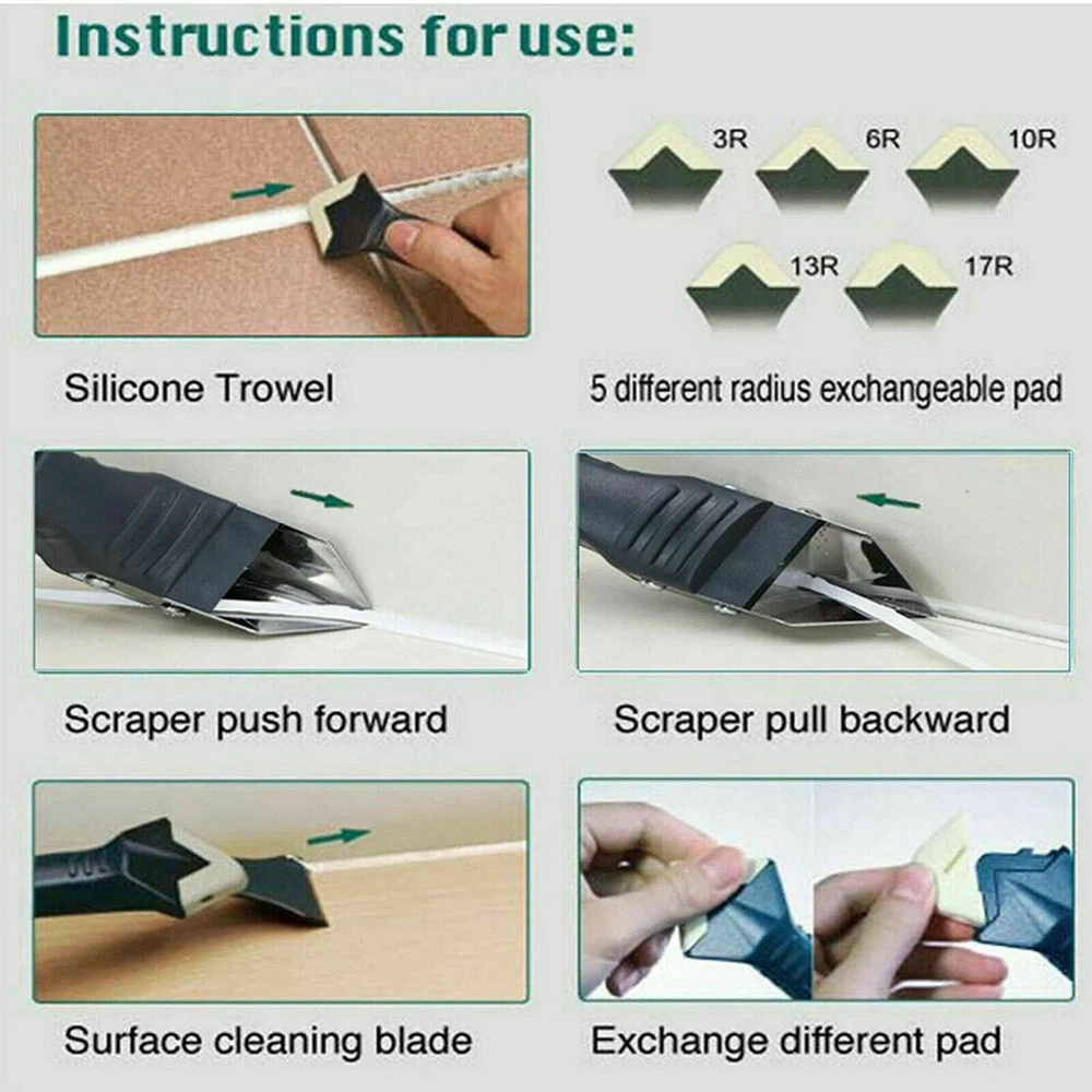 3-In-1 Silicone Remover Caulk Finisher Sealant Smooth Scraper Grout Kit Tools Features: Material: Plastic + Silicone. Exchangeable Silicone Pad Radius: 3R/6R/10R/13R/17R. Color: Black Length: 7.2in-8in 【 3 in 1 Silicone Caulking Tools 】-- Multifunction design, it can be used as an angled scraper, glass glue blade, adhesive residue scraper, and seam repair tool. 【 Caulking Tools Kit 】-- The glass glue angle scraper was designed with a non-slip push-pull button, 5 silicone pads ( including 3R,6R,10R,13R,17R radius), and sealant finishing tool was made of durable plastic, easy to clean without wasting caulk; And they are reusable with a long lifetime. 【 Easy to Use 】-- Multi-edge-spreading design makes hard-to-reach caulking locations easy to seal. Lightly press the silicone gasket along the line you want to seal when the putty is still fresh, or you can apply a little fresh putty in a dirty area for easier cleaning when the putty is dry. Made caulking job a lot easier, save time. You no longer need to use your finger and it gives a perfect edge, actually better than using my finger. 【 Wide Application 】-- The caulking tools can use for home, kitchen, bathroom, window, sink joint, and so on. Easy to clean with a damp cloth and reuse, reduce the waste of sealant, saves money and time. Package Included: 1 x 3 in 1 Caulk Scraper 5 X Shaving Heads Payment Shipping Return Feedback Question Payment We accept payment via Paypal ONLY. Immediate payment is required & Shipping will be arranged only your payment is cleared. Shipping Same business day dispatch if paid by 4 pm EST(1 pm PDT). No shipping on weekend or Public Holidays & No responsibility for any customs duty. Return We stand behind our products. Items can be returned for exchange or full refund within 60 days from the date you receive your item. Return shipping is the responsibility of buyer unless the return is a result of our mistake (i.e., your receive the wrong item or damaged item). We will pay for shipping replacement back to you if an exchange is requested. If you want to initiate a return, simply clicks "Return this item" next to the transaction in My eBay, chooses a reason, and prints a return shipping label and packing slip. We’re automatically notified. Feedback Please leave us a FIVE star and POSITIVE feedback if you are satisfied with our product and service. Neutral or negative feedback will not solve problems happily. We believe communication will fix problems and hope every customer can have a good purchasing experience. Question All ebay message will be responded within 1 business day or less, except weekends and holiday!