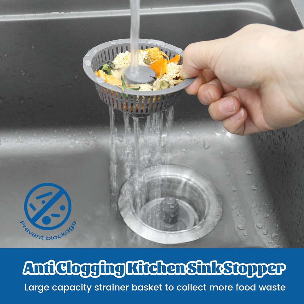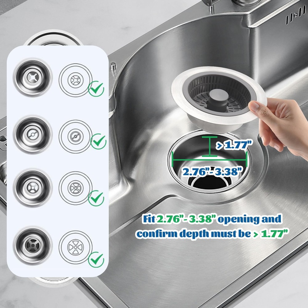 【Upgraded 3 in 1 Kitchen Sink Strainer and Stopper】The Kitchen sink drain strainer is designed with a pop-up device that combines 3 functions: water storage, clogging and odor features. Compared to other single-function kitchen sink strainers, it simplifies your kitchen work while ensuring high performance. 【Suitable for US Standard Kitchen Sink】kitchen sink drain strainer fits for most US standard sink sizes with a width of 2.76 "-3.38 ", depth >1.77 " opening sink hole. Please measure the diameter and depth of the sink drain before purchasing. 【Durable Quality Material】Our kitchen sink stopper is made of high quality 304 stainless steel and ABS material, which can withstand high temperature and highly resistant to deformation, rust, and scratches. Ensures long life and reliable performance. 【Anti Clogging & Prevent Odors】The kitchen sink drain stopper has 2mm diameter multi-filter allows small impurities to be passed, and effectively catch food waste and prevent clogging. Our sink drain strainer has sealing washer at the bottom to effectively isolate odors and foreign matter. 【Fast Drainage & Easy to Clean】The stainless steel body of our sink stopper kitchen drain is designed with three large drain holes for fast and efficient drainage, preventing slow draining and clogging. The ABS strainer basket is very easy to clean and won't cling to light food waste like traditional metal sink strainers.