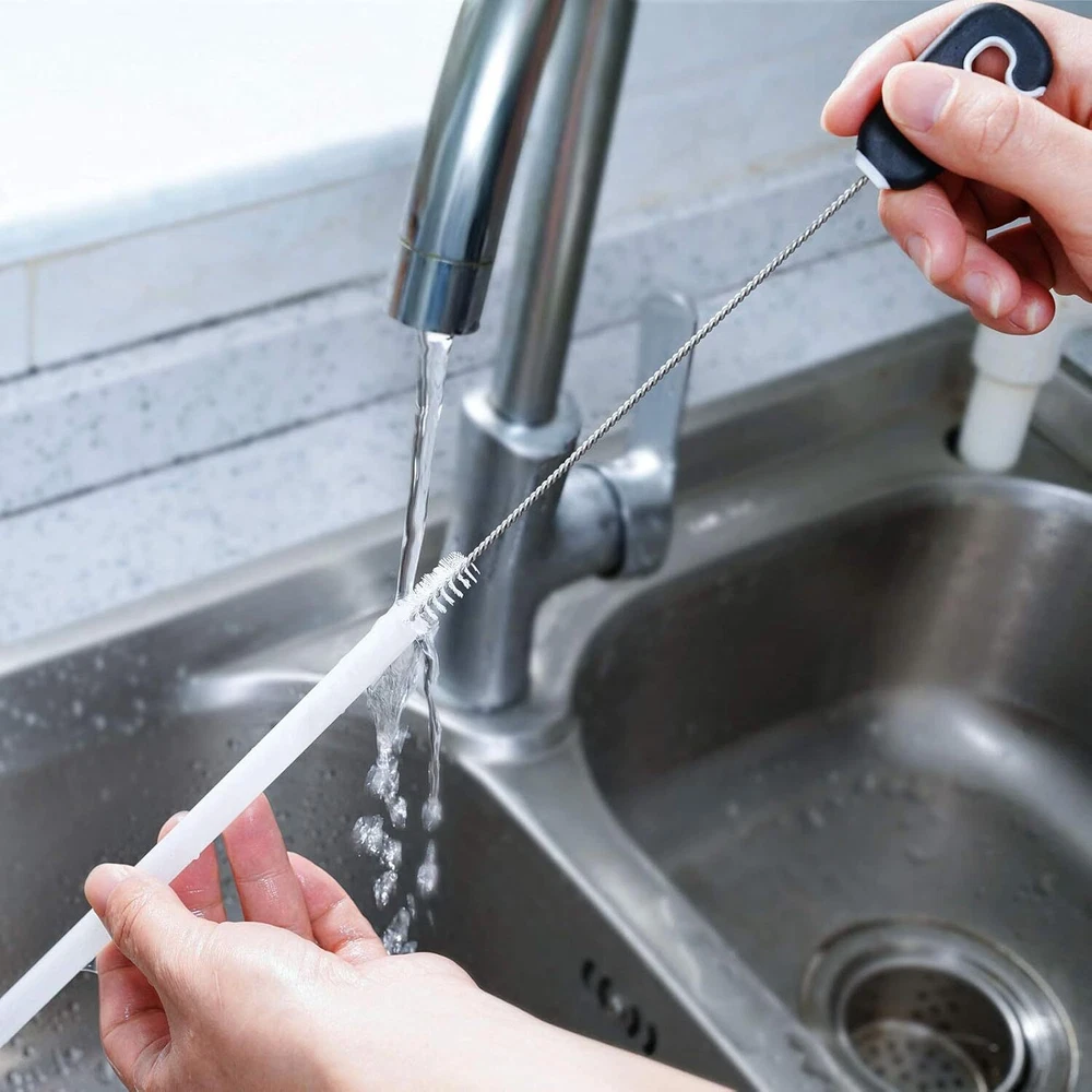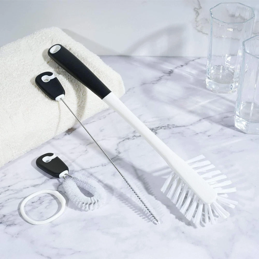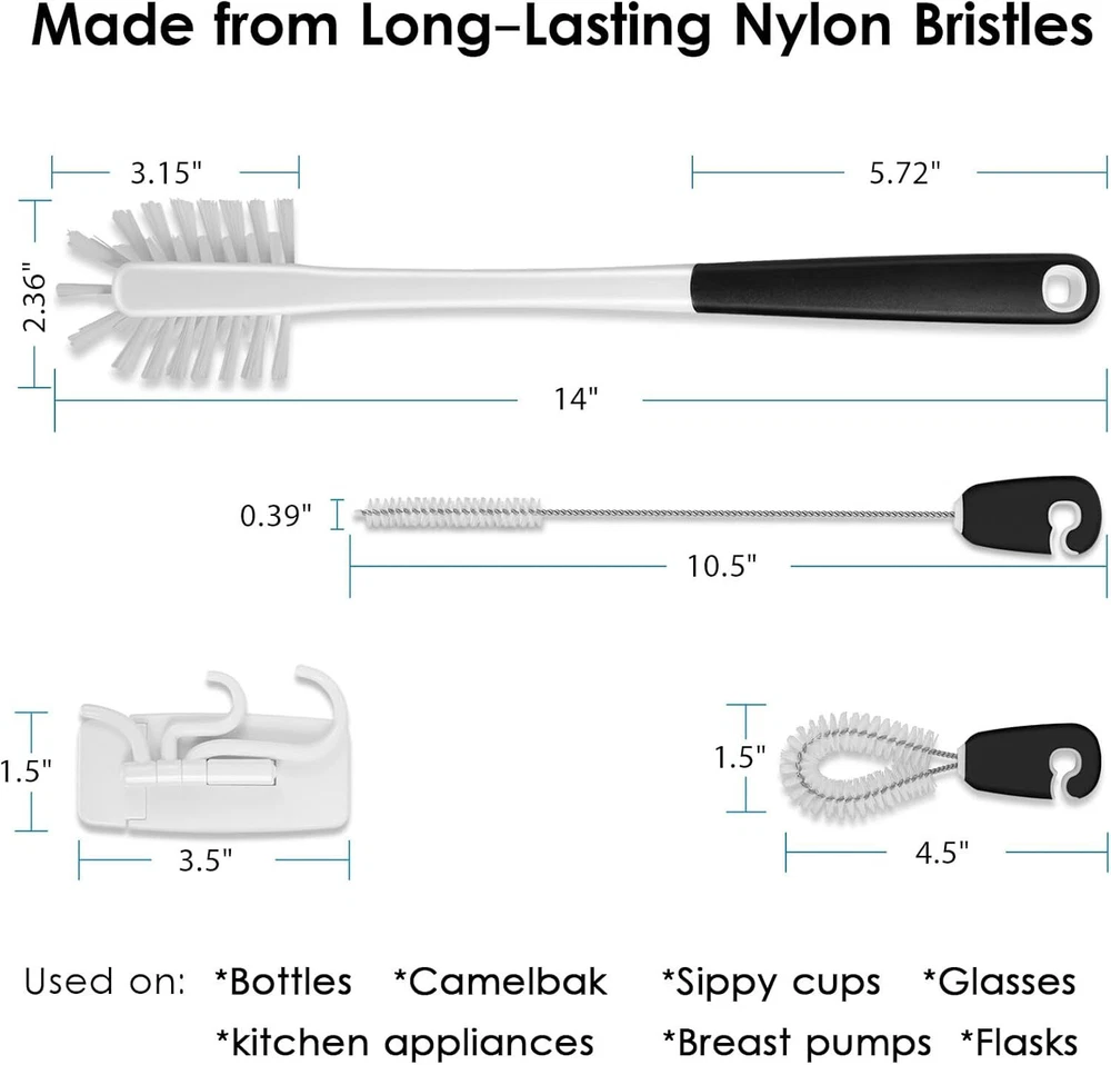 3-in-1 Water Bottle Cleaning Brush Set, Long Handle Black, White Product Details Is Discontinued By Manufacturer : No Product Dimensions : 14.2 x 2.5 x 1.9 inches; 4 ounces Item model number : JB004 Manufacturer : MOSOLAN Brand: MOSOLAN Color: Black, White Handle Material: Rubber Specific Uses For Product: Water Bottle, Bottle, Dish Product Dimensions: 14"L x 2.36"W x 2.36"H Three Tools In One: Water bottle cleaning set includes a long bottle brush, straw brush and detail cleaner with detachable organizer ring and storage hook, to provide a thorough clean for any of your drinking buddies Perfect For Narrow Neck Bottles: The long bottle brush with comfortable grip has soft side bristles that slide easily into narrow neck bottles without scratching bottle walls; while the stiff bristles on the brush tip scrub the bottle bottom for a clean drinking bottle Keep Your Reusable Straws Clean: The straw brush cleans a variety of straws made from silicone or stainless steel thoroughly; make them last by keeping them clean with our straw cleaning brush featuring premium nylon bristles and a rubber handle No More Worry About Hard-To-Reach Places: The detail cleaner gets into the crevices of caps and lids, cleaning screw threads and locations where a large brush can not reach Convenient Storage: All three brushes have long-lasting nylon bristles that won't lose their shape and soft, comfortable, non-slip handles, store together on a handy ring and easily snap off for use; triple swivel hook is self-sticking and keeps your water bottle brush set handy and your home organized