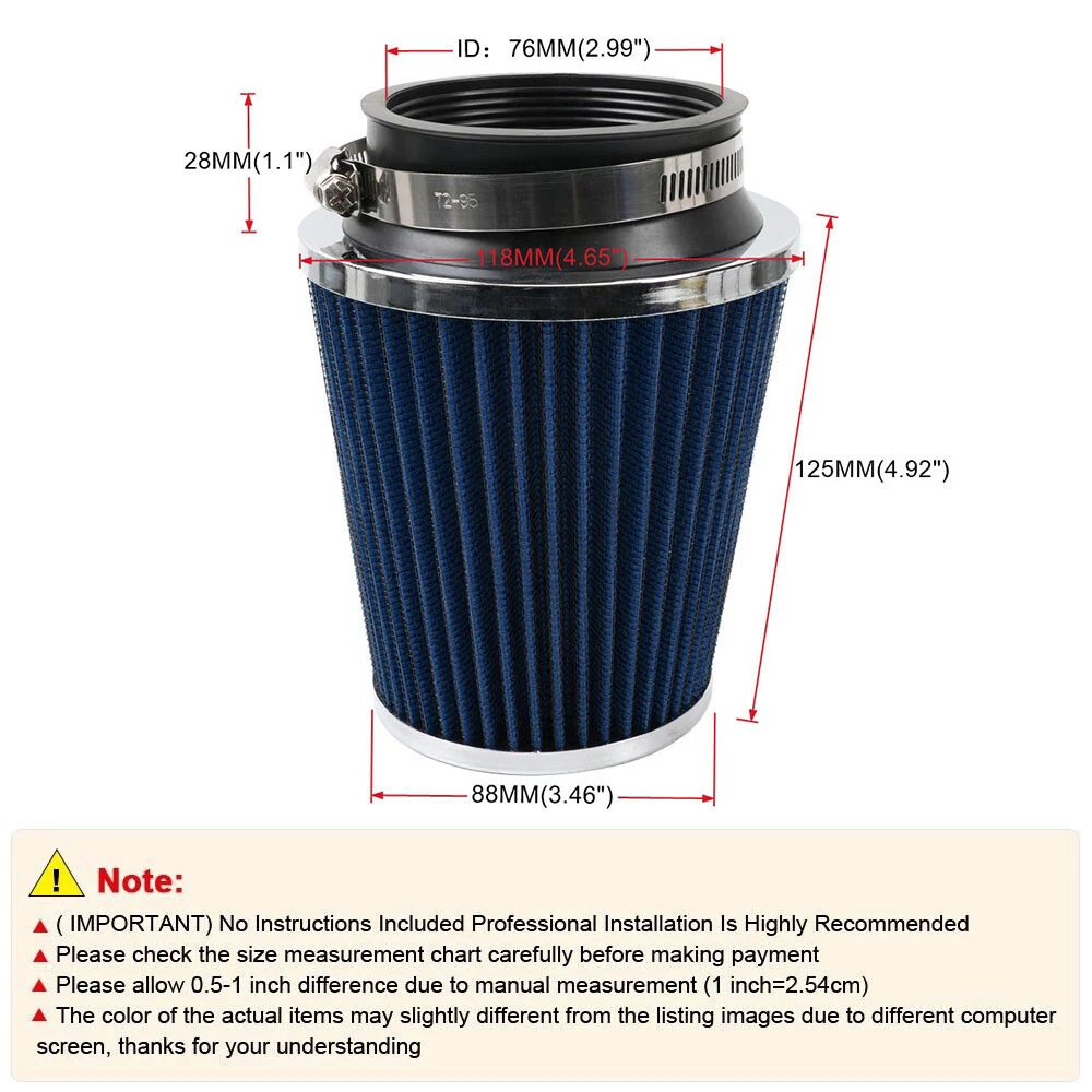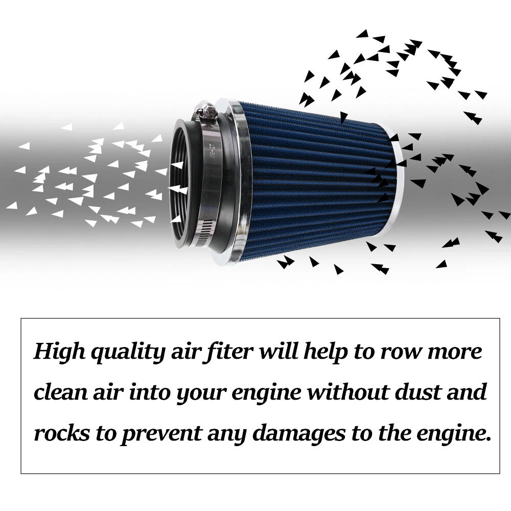 3inch 76mm Blue High Flow Inlet Dry Air Filter Cold Air Intake Cone Replacement Function: Air filters help the system by filtering dirt and other particles from the air. in doing so, the filters prevent contaminants from clogging up the air intake system and potentially damaging your car's engine. How often should air intake filter be replaced? It should be inspected once a year or every 15,000 to 30,000 miles, but this can vary based on the car and driving environment. if you often drive through dusty terrain or on unpaved roads, you may need to change it more frequently. Features: --- Increase horsepower, torque and improve the gas mileage. --- It universally fit for any 76mm / 3inch air intake hose. --- The high flow air filter help engine to draw more cooler air resulting in better throttle response & higher explosive horsepower output. --- It comes with a washable and reusable cone air filter and a clamp. --- Filter consisted of 2 layers to double the filtration efficiency. Package included: 1 x Air filter 1 x Clamp All items are brand new unless stated otherwise on the listing. we sell diy (do it yourself) items with a few exceptions. we take no responsibility in teaching you how to install. professional installation is strongly recommended. Payment policy Shipping policy Return Policy Product & Price description Contact us Payment policy We only accept PayPal and Payoneer payment, Please be sure your shipping address is correct. Please make sure your account balance is adequate Shipping policy 100% of orders shipped within 24-48 hours. Tracking number will be added to ebay after the shipment, u can track the item status on 17 track net. It's usually delivered within 1-5 business days, If it takes longer than this time, please contact us and we will explain the reason and deal with it. Thank you for your understanding Above time are for reference ONLY. Shipping might be delay by holidays, events and other uncertainties. Note: If there are any customs duties, local taxes or any other import charges, the buyer will bear these charges. Every country has different policies, so you need to know your country's tax policy. Return Policy Please contact us before leaving neutral or negative feedback and we will try our best to resolve any issue. Feedback will be left to every buyer who completed the transaction and left positive feedback to us. We accept 30 days return only if item is original. Refund will be issued once we receive your returned items. Buyer is responsible for all return shipping charges. Product & Price description About the product --- The product has been adjusted, you can rest assured to use. If you are not sure whether the model is suitable, please contact me by email, thank you About Price ---The price of the product is reasonable. If you want a lower price , please send a message to my email address. I will discuss with you the appropriate price Contact us For any reason you want to contact us,We aim at satisfying every visitor, no matter what kind of situation you meet with, we will be right here to serve you. Please contact our team.If you are happy with the transaction with us, leaving us an ALL-5-STAR positive feedback would be greatly appreciated. Have a good shopping.
