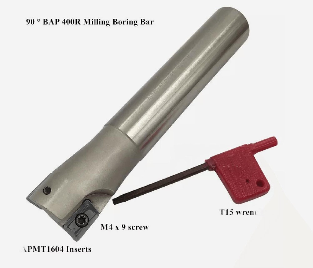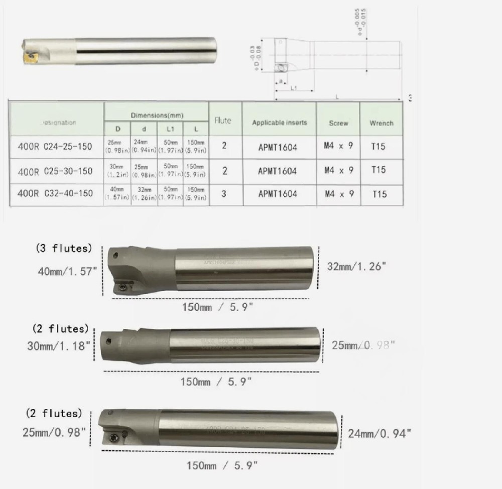 Specification: Package: 3x400R Indexable End Mill with wrench + 10pcs APMT1604 inserts About the APMT1604 inserts: 1.Material: carbide with PVD coating 2.Machining Stainless steel ,steel parts, iron and aluminum alloys.PMKSH 3.Item weight: 81g 4.Made of material with high hardness and good durability to ensure long service life 5.High vibration-absorbing performance, improve the surface finish of the workpiece 6.Great for shoulder milling, face milling and slotting 7. Package:10pcs (Boxed) About the 400R Milling Cutter Shank Holder: 1. Product Name: Indexable Milling Cutter Shank Holder 2.Inserts Material:40Cr MnTi , through heated and quenched,solid hard with good cushioning effect,supports high cutting 3. Machinable hardness: Hrc 35°-- 60° 4. Main Color: Silver Tone 5. Right angle end design, of great anti-vibration performance. 6. 90° Cutting angle ,Screw down insert , indexable milling cutter, matching with standard APMT1604 insert 7.Wrench Size: T15 8. Screw Size: M4/0.16" 9. Battery Included: No 10. Dimension information as the Size chart shows 11.Include: 400R C24-25-150 -- 0.94”shank , 0.98”cutting dia , 5.9”OAL 400R C25-25-150 -- 0.98”shank , 0.98”cutting dia , 5.9”OAL 400R C32-40-150 -- 1.26”shank ,1.57”cutting dia , 5.9”OAL Characteristic End mill holders: Right angle end design, of great anti-vibration performance ,90° Cutting angle ,Screw down insert , indexable milling cutter, matching with standard APMT1604 insert High vibration-absorbing performance, improve the surface finish of the workpiece,Great for shoulder milling, face milling and slotting Inserts Material:40Cr MnTi , through heated and quenched,solid hard with good cushioning effect,supports high cutting Inserts Machinable hardness: Hrc 35°-- 60°,Machining Stainless steel ,steel parts, iron and aluminum alloys Notice Buy a number of products are discounted. these are Suitable for machining Steel parts/stainless steel /cast iron. If you need a better product please enter the store search or write to tell me. We have more products in the upload, please pay attention to my shop. If you need to contact me to send a link, if you need to buy in bulk can also send me a letter, I will give you recommend the best products, at the lowest price contact us for bulk purchase. Welcome your inquiry. Thank you for your support!