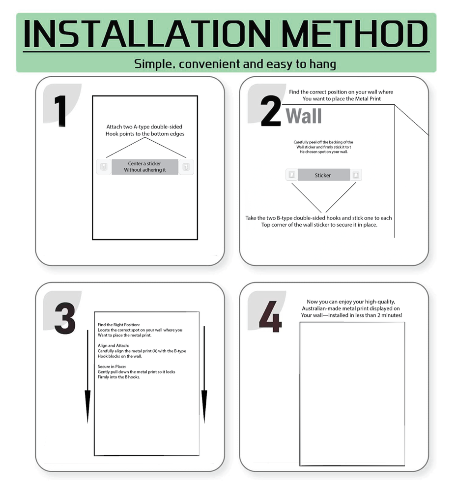 Made in Australia Ready to Hang comes with wall hooks ( Easy to Hang ) Size 40x60cm x 3 Pcs & 30x40cm x 3 Pcs Printing on Metal attracts the eyes thanks to the effect of depth and it looks beautiful in representative premises. Thanks to the use of modern printing technology and high quality dyes, it is characterized by a beautiful gloss. Metal pictures are light, easy to clean and resistant to moisture, so they work great in the living room, bedroom, bathroom and even on the terrace. Metal with graphics thanks to its high level of light transmission gains an amazing 3D effect. Metal printing is a great proposition for those who like practical solutions. High resistance Metal Print is more resistant to damage and does not deform. High light transmission High transparency of acrylic guarantees a glossy surface and higher color intensity. Safe for children Made of non-shattering material. Additional UV protection Used ink is resistant to sunlight. Smooth surface Surface of the Metal remains smooth and is scratch-resistant. Picture hanging It is incredibly simple and takes only a few minutes thanks to our Hanging elements which are part of the set. On the back of the Metal you find a Wooden frame with hooks for easy hanging. *Metal Printing Wall Art is shipped in specially protected packaging, although they are extremely resistant to breakage due to their tempered structure. * Each one is handmade. Manufactured with top quality material. The Print: Direct UV-LED DIAMOND BRILLIANCE AND STRENGTH Printed at very high resolution using direct UV-LED printing, our UV Direct aluminum prints deliver crystalline clarity and bold, bright colors. The UV curing process secures our high-quality inks to the surface of your aluminum panel, illuminating your images like never before. Plus, these panels are built to stand up to almost anything? resistant to fading, warping, light moisture, and cracking, UV Direct aluminum prints can thrive indoors and outdoors for years. For protection and brighter colors READY-TO-HANG DESIGN Every UV direct aluminum print comes with a built-in cleat-style fixture that makes it easy to attach to your artwork to your wall. We design our hanging and printing hardware to withstand dimensional variances that happen over time. We will send you a video with all instructions after you purchase. HB