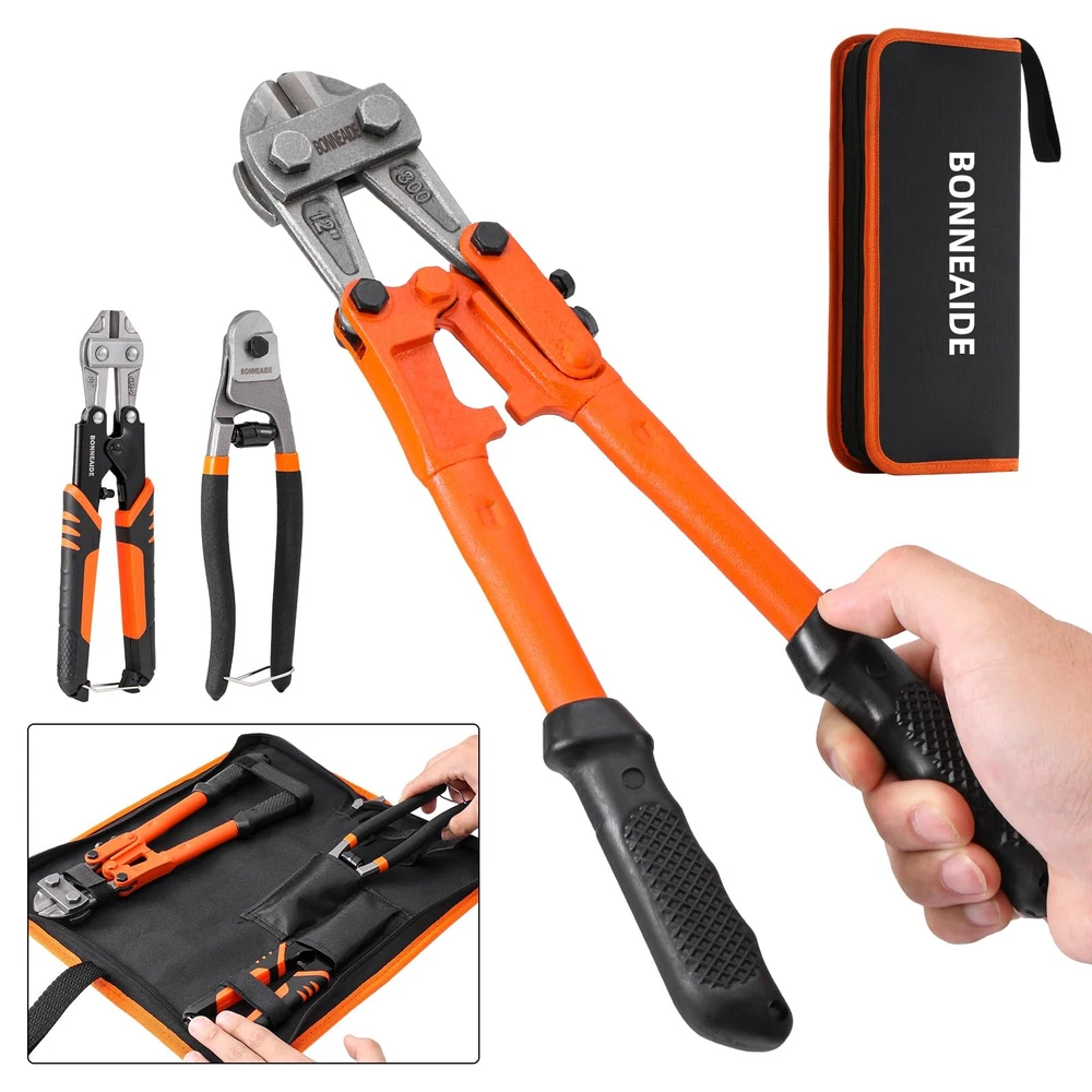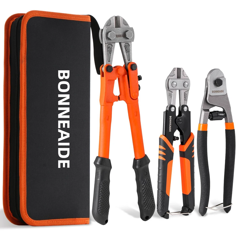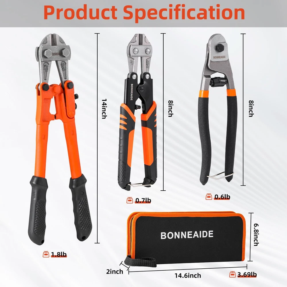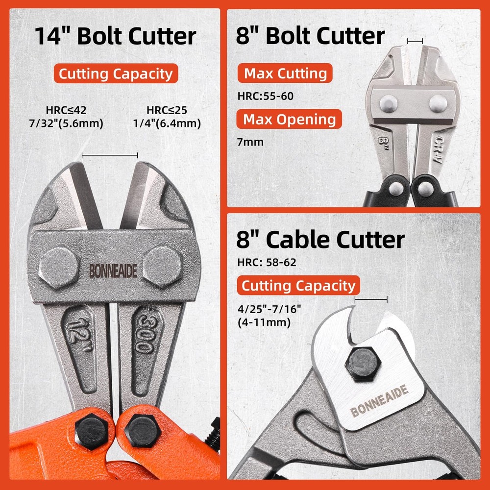 3pcs Bolt Cutters Pliers Set, 14" Heavy Duty Bolt Cutters, 8" Small Bolt Cutter, 8" Mini Wire Cutter, Cr-V Blade, for Cutting Locks, Thick Iron, Steel, Barbed Wire, Rods, Chain, Rivets What Included:14" Heavy Duty Bolt Cutter, max jaw opening is 19/32 in (15mm); 8" Wire Cable Cutter, max jaw opening is 7/16 in (11mm) ; 8" Mini Cable Cutter, max jaw opening is 1/4 in (7mm). Wide Applications:The bolt cutter pliers set is widely used for cutting cables, steel wires, barbed wire, rivets, chains, etc, can widely used in industrial job sites or home improvement projects, repair and disassembly work, etc. User-Friendly Design: Classic leverage design and precisely aligned blades deliver stronger cutting strength. Built-in handle lock for easy storage when not in use , featured with tightening adjustment screw for adjusting minimum opening in order to prevent excessive force while cutting. Ergonomic handle, anti-slip & offer better hand feel, provide greater control and comfort while cutting. Cutting Capacity: The 14" bolt cutter cutting capacity: HRC≤42, 7/32"(5.6mm), HRC≤25, 1/4"(6.4mm), very suitable for cutting bolts, chains and other metal materials. The 8" cable cutter cutting capacity: HRC: 55-60, Max Opening 7mm, very suitable for cutting copper wire, aluminum wire, medium hard/flexible wire. The 8" mini cable cutter cutting capacity: HRC: 58-62, 4/25"-7/16"(4-11mm), very suitable for cutting steel wire, chains, cables, etc. Not recommended for cutting locks. Carrying Bag: The 3-pcs bolt cutters set with a zipper carrying bag for easy to access at any time.Made of black double-deck 500D fabric, Wear-resistant and sturdy, featured with lanyard, easy to hang.