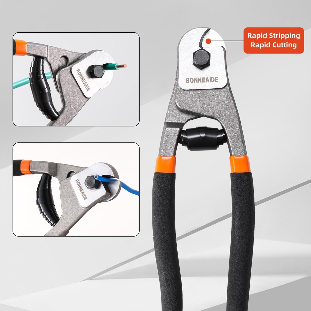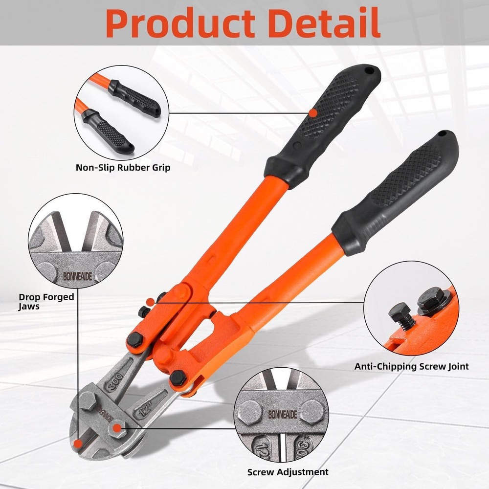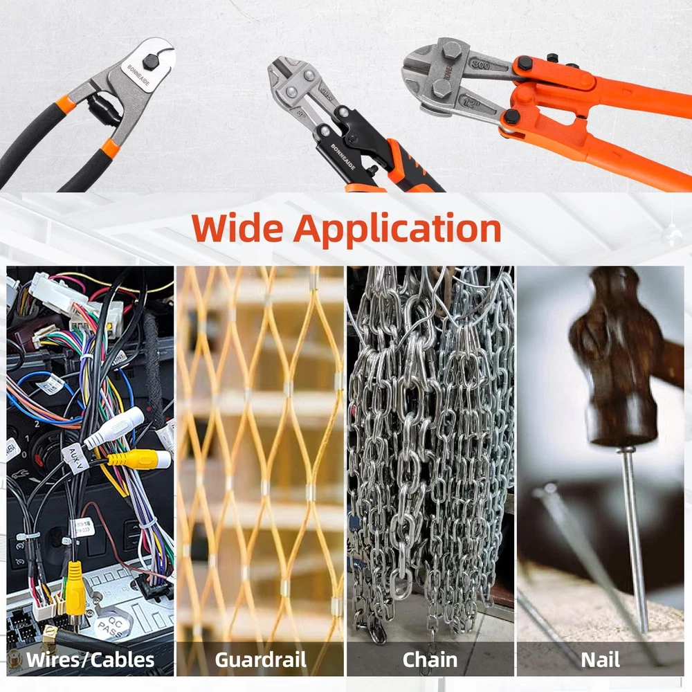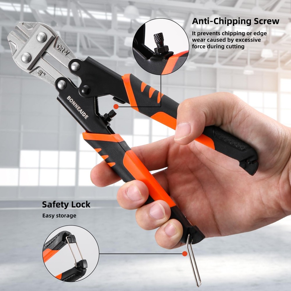 3pcs Bolt Cutters Pliers Set, 14" Heavy Duty Bolt Cutters, 8" Small Bolt Cutter, 8" Mini Wire Cutter, Cr-V Blade, for Cutting Locks, Thick Iron, Steel, Barbed Wire, Rods, Chain, Rivets What Included:14" Heavy Duty Bolt Cutter, max jaw opening is 19/32 in (15mm); 8" Wire Cable Cutter, max jaw opening is 7/16 in (11mm) ; 8" Mini Cable Cutter, max jaw opening is 1/4 in (7mm). Wide Applications:The bolt cutter pliers set is widely used for cutting cables, steel wires, barbed wire, rivets, chains, etc, can widely used in industrial job sites or home improvement projects, repair and disassembly work, etc. User-Friendly Design: Classic leverage design and precisely aligned blades deliver stronger cutting strength. Built-in handle lock for easy storage when not in use , featured with tightening adjustment screw for adjusting minimum opening in order to prevent excessive force while cutting. Ergonomic handle, anti-slip & offer better hand feel, provide greater control and comfort while cutting. Cutting Capacity: The 14" bolt cutter cutting capacity: HRC≤42, 7/32"(5.6mm), HRC≤25, 1/4"(6.4mm), very suitable for cutting bolts, chains and other metal materials. The 8" cable cutter cutting capacity: HRC: 55-60, Max Opening 7mm, very suitable for cutting copper wire, aluminum wire, medium hard/flexible wire. The 8" mini cable cutter cutting capacity: HRC: 58-62, 4/25"-7/16"(4-11mm), very suitable for cutting steel wire, chains, cables, etc. Not recommended for cutting locks. Carrying Bag: The 3-pcs bolt cutters set with a zipper carrying bag for easy to access at any time.Made of black double-deck 500D fabric, Wear-resistant and sturdy, featured with lanyard, easy to hang.