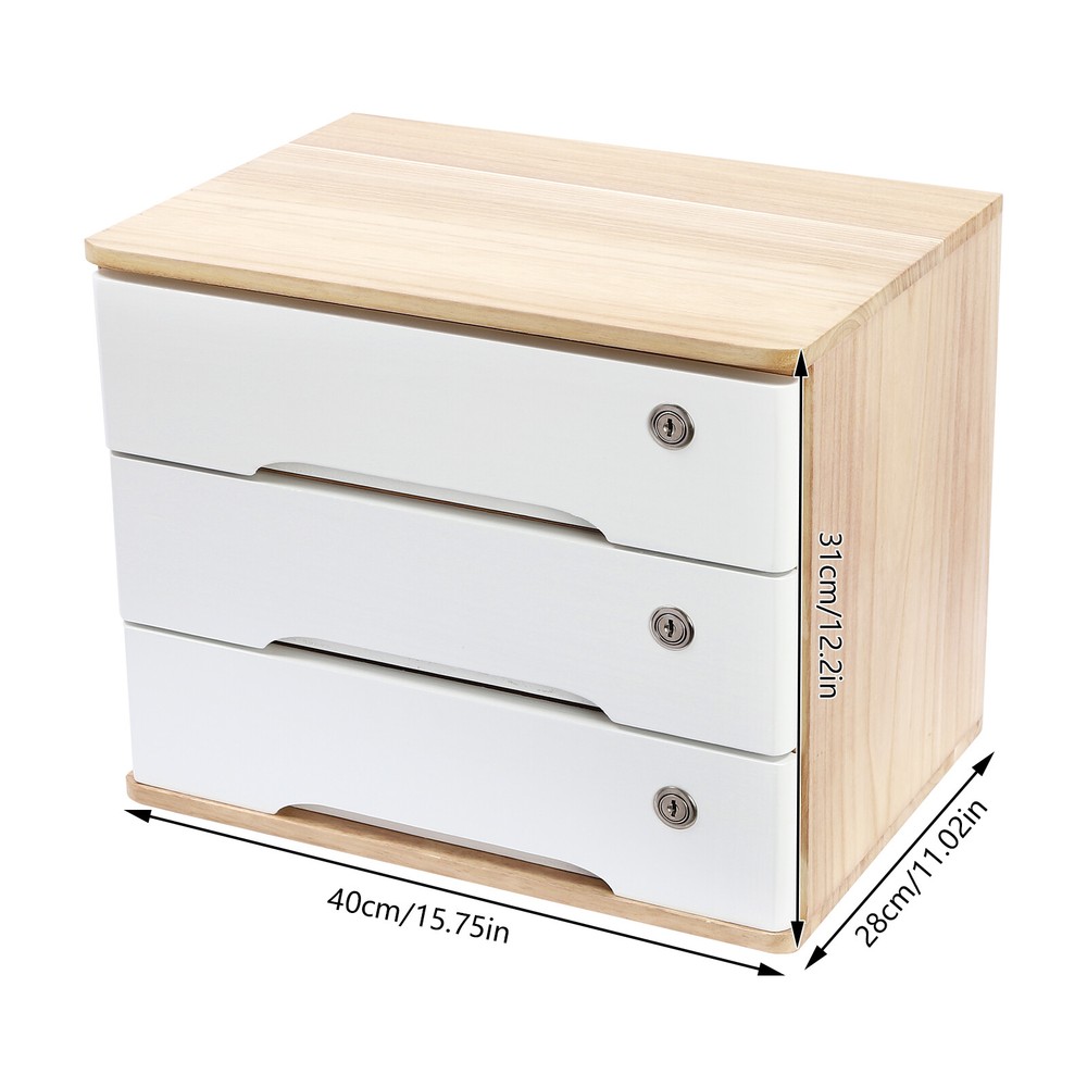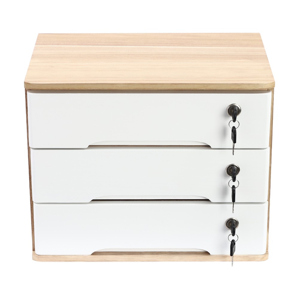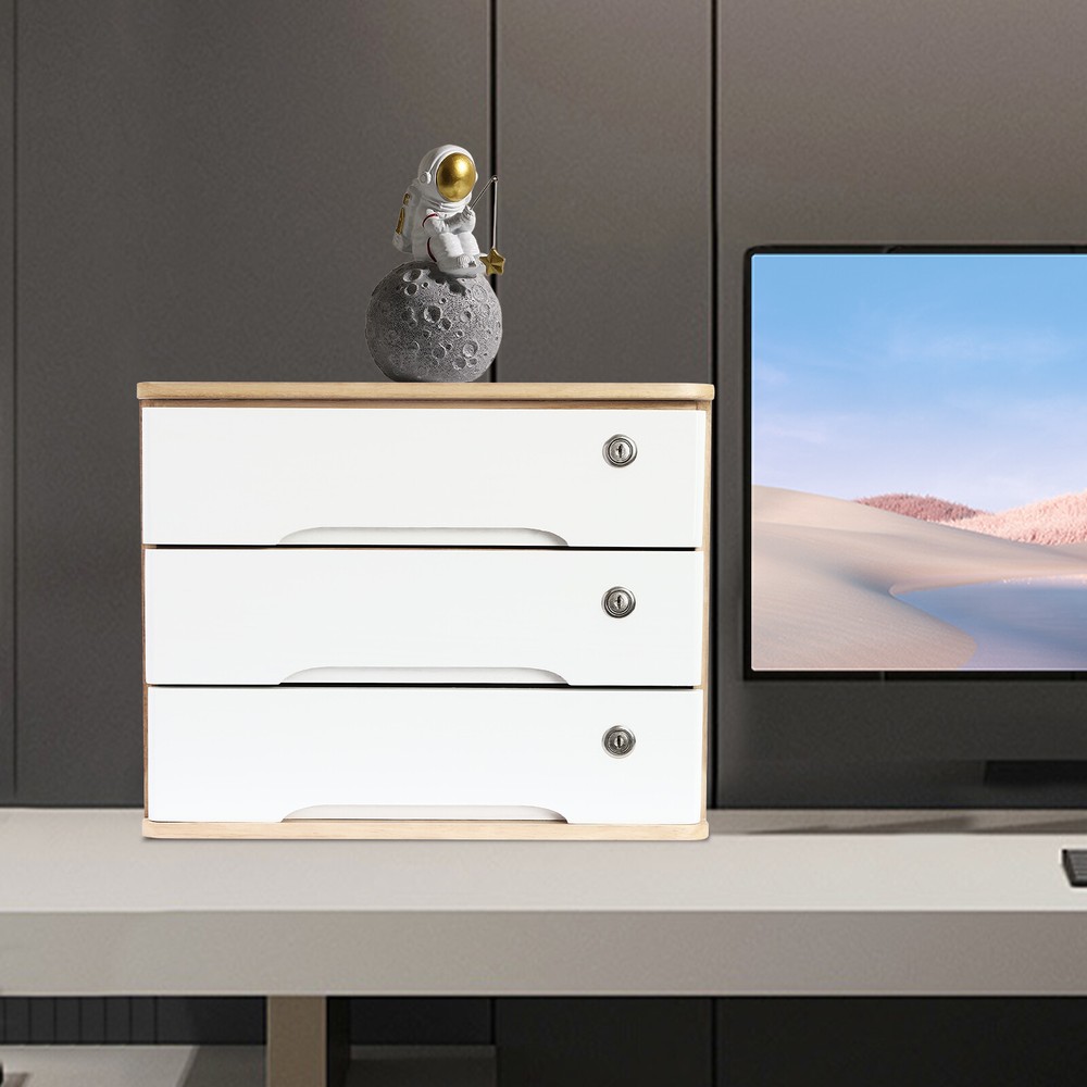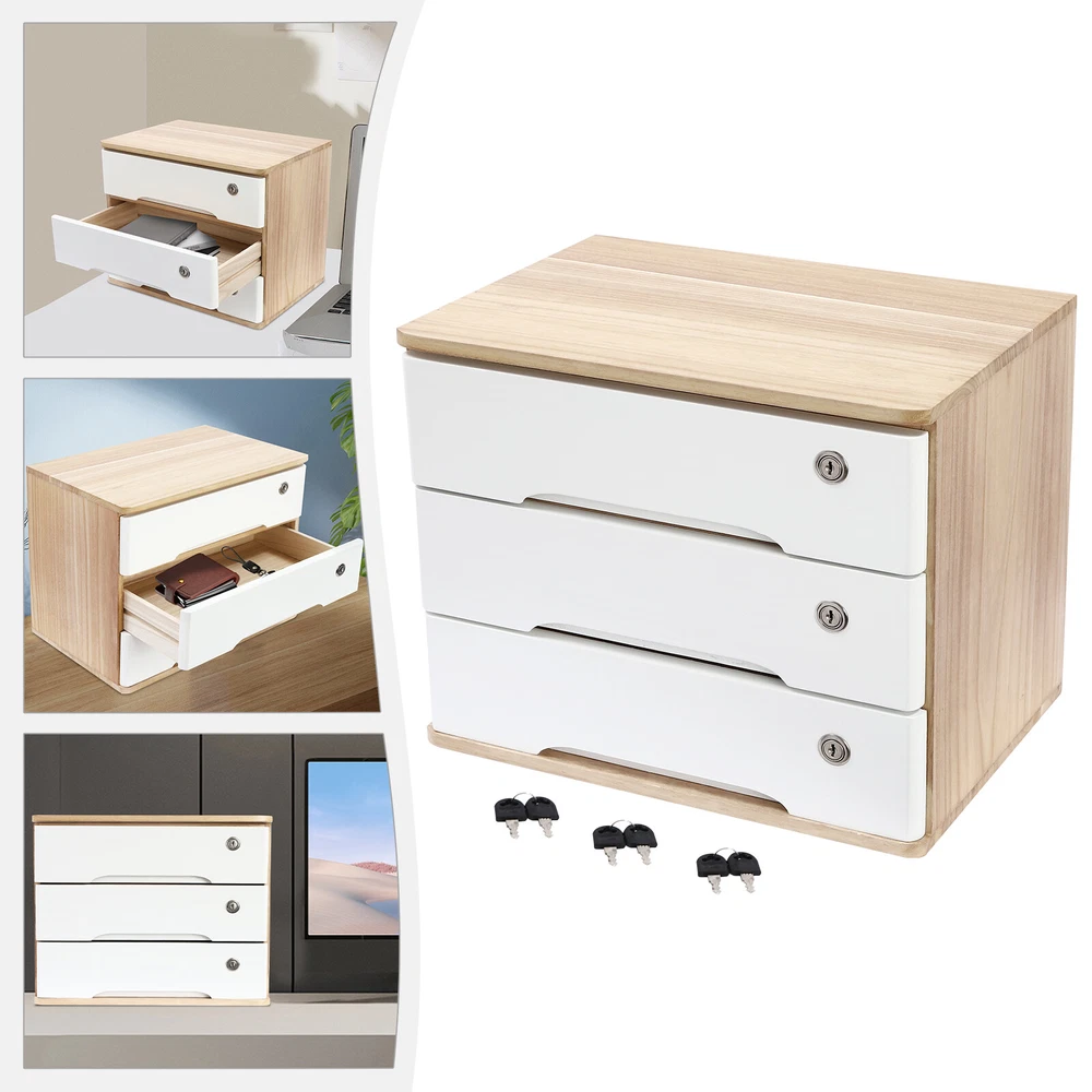 3-tier Wooden Desktop Storage Cabinet w/ Lockable Drawers+6*keys For Home Office
