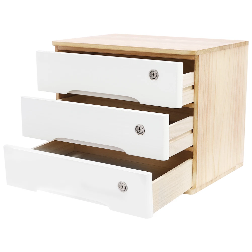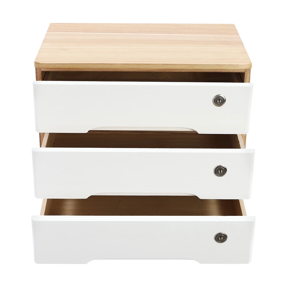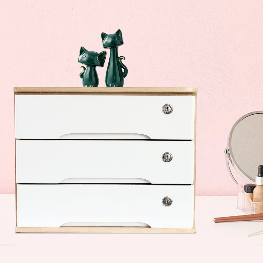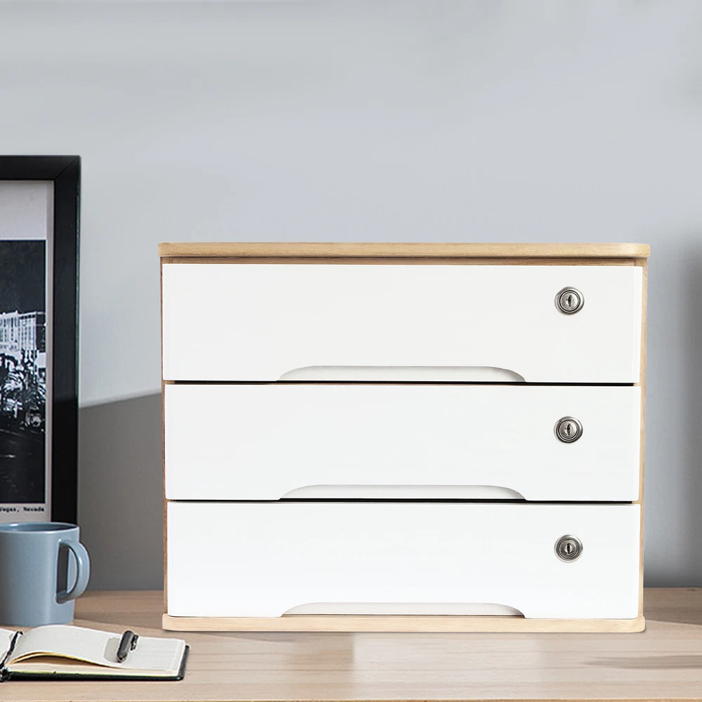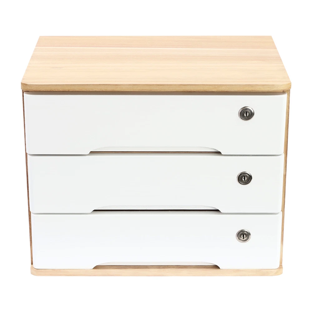 3-tier Wooden Desktop Storage Cabinet w/ Lockable Drawers+6*keys For Home Office