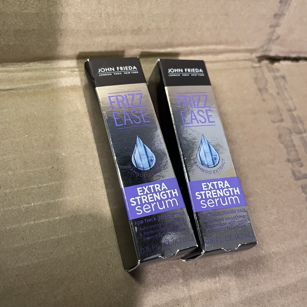 John Frieda Frizz Ease Extra Strength Serum - 2 Pack This listing includes two (2) travel-sized boxes of John Frieda Frizz Ease Extra Strength Serum. Specifically formulated for thick and coarse hair types, this serum utilizes bamboo extract to provide advanced smoothing and exceptional humidity resistance. The compact 4.7ml size is perfect for travel, gym bags, or trying out the product before committing to a full size. Brand: John Frieda Product: Frizz Ease Extra Strength Serum Size: 0.16 FL OZ (4.7 mL) per box Quantity: Set of 2 Benefits: Frizz control, humidity protection, and smoothing for thick hair