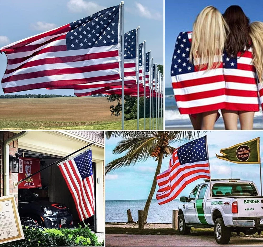 American Flag 3x5 2pk HIGH QUALITY MATERIALS: Our American flag 3x5 is made of high quality polyester, ensuring durability and long-term use. BRIGHT & FADE-RESISTANT COLORS: The colors of our 3x5 USA flags are bright and fade-resistant to maintain their vibrant appearance even when exposed to sunlight. Our US flags are suitable for all weather. FITTINGS & STITCHING TECHNOLOGY: The American flags are equipped with durable brass grommets that can be easily installed on the flagpole and ensure they stay securely in place, and the edges are double stitched for added strength and durability, ensuring they will hold up even in harsh weather can remain perfect condition. SIZE & USES: Our American flags measure 3x5 feet Made in China and can be hung on front porches, houses, indoor and outdoor walls, gates, classrooms and more to show your patriotism. Additionally, it can be used as an outdoor garden flag, a memorial US flag for family and friends, and it also can be used for many events such as Independence Day, Christmas and New Year. The lightweight design allows the USA flag to fly in the breeze. SPECIAL PATRIOTIC GIFT: Our 3x5 American flags make great gifts for your loved ones, friends, co-workers, veterans, patriotic families and more. We make sure to provide you with our sturdy flags, so you can easily express your love for this great country.