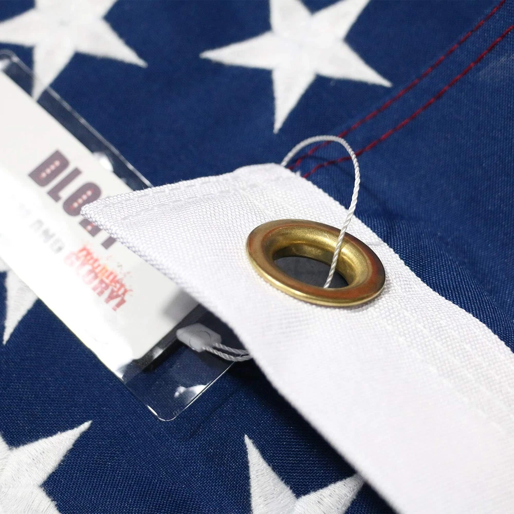 3x5 FT American Made USA Flag Long-lasting Heavy Duty United States Flag Embroidered Stars Sewn Stripes UV Protected Outdoor US Flag Product Details Size: 3 by 5 foot Brand: DLORY UPC: 655160601262 EAN: 0655160601262 MPN: Does not apply Theme: Patriotic Color: Red,White Brand: DLORY Recommended Uses For Product: Outdoor Occasion: Flag Day,Independence Day,Veterans Day Material: Polyester Special Feature: Heavy Duty Cartoon Character: American Flag,Stars Specific Uses For Product: Outdoor Product Dimensions: 60"L x 36"W Item Weight: 14 ounces Manufacturer: American Flags by DLORY Flag YOUR PATRIOTISM-This beautiful American Flag Size is 3x5 foot (36x60 inches) with 2 brass grommets.The Old Glory is strong constructed to hang proudly in all weather.Put your patriotism out there for all to see! WEATHER RESISTANT- Heavy Duty waterproof 300D 100% Woven Polyester specially treated to dry quickly and UV protection to resist fading.Well made high quality fabric makes flag easy to fly outdoor and withstand windy and rainy weather much longer. QUALITY CRAFTSMANSHIP-50 Embroidered stars and 13 sewn vibrant white&red stripes.Quadruple rows stitching on the flying end hem.Added reinforced patches on the two corners of flying end and Back Tack reinforcement for long lasting.You will be fully satisfied with the workmanship of this flag. STURDINESS-Tough waterproof heavyweight header with two big solid rolled rim brass grommets for more durability to stand up to harsh weather.Easy to install on any type flag pole with two or three hanging support.Great gift decoration indoor or outdoor for your Patriotic Family Home, Porch, Garden and Business. RISK FREE-365 Days Guarantee of flag.You will receive sturdy satisfying 3'x5' United States of America Flags without any logo printed on flag.Any issues,you can get our assistance within 24 hours through buyer/seller communication tool (you can find it in your order details).