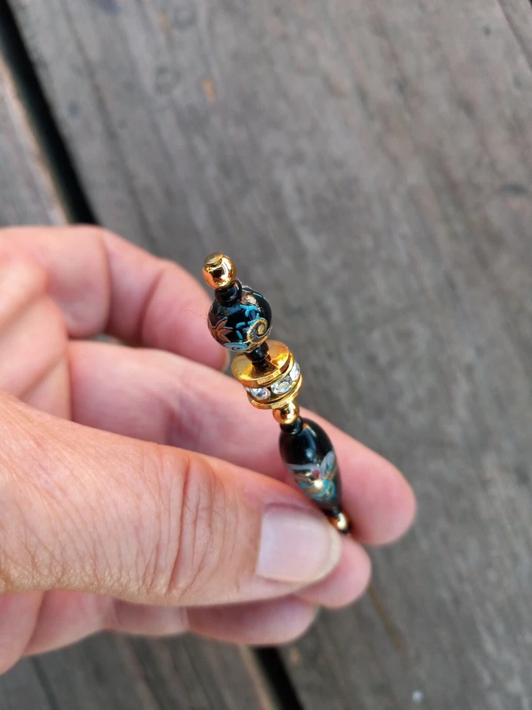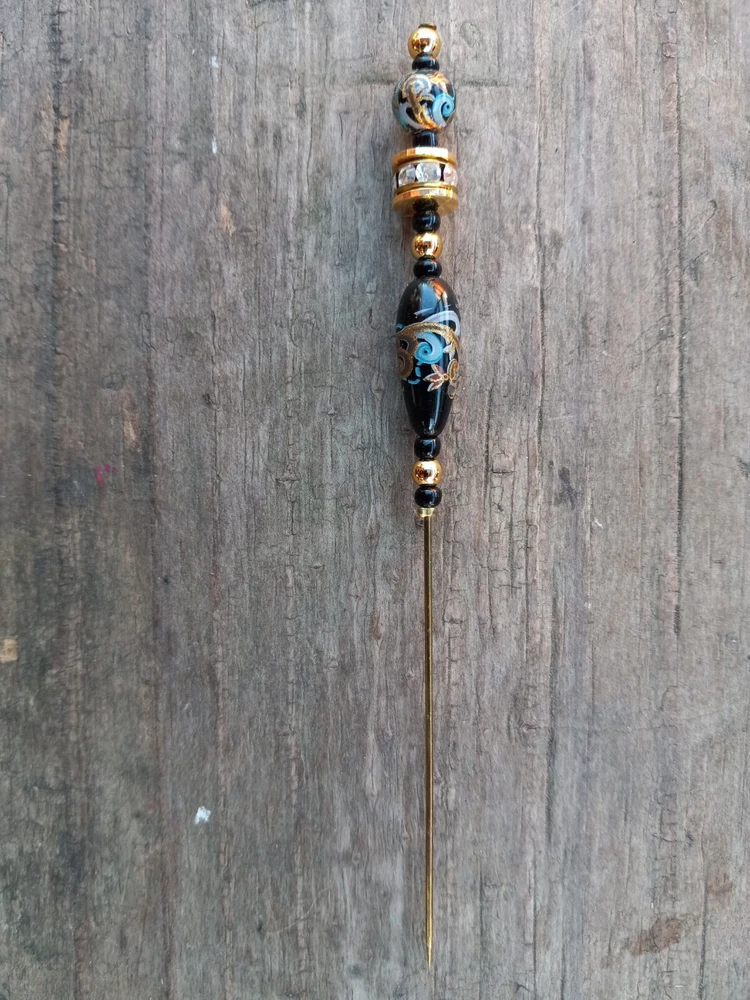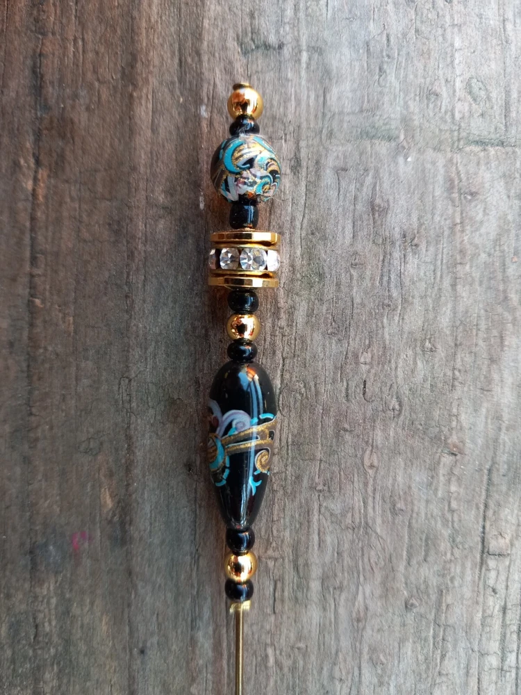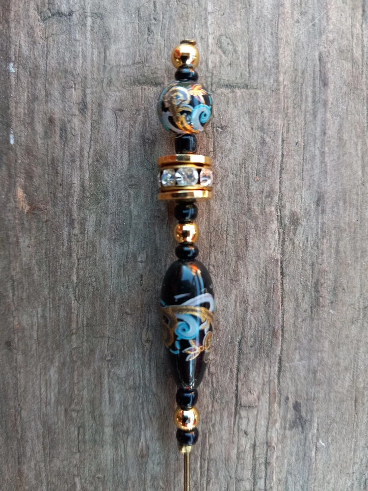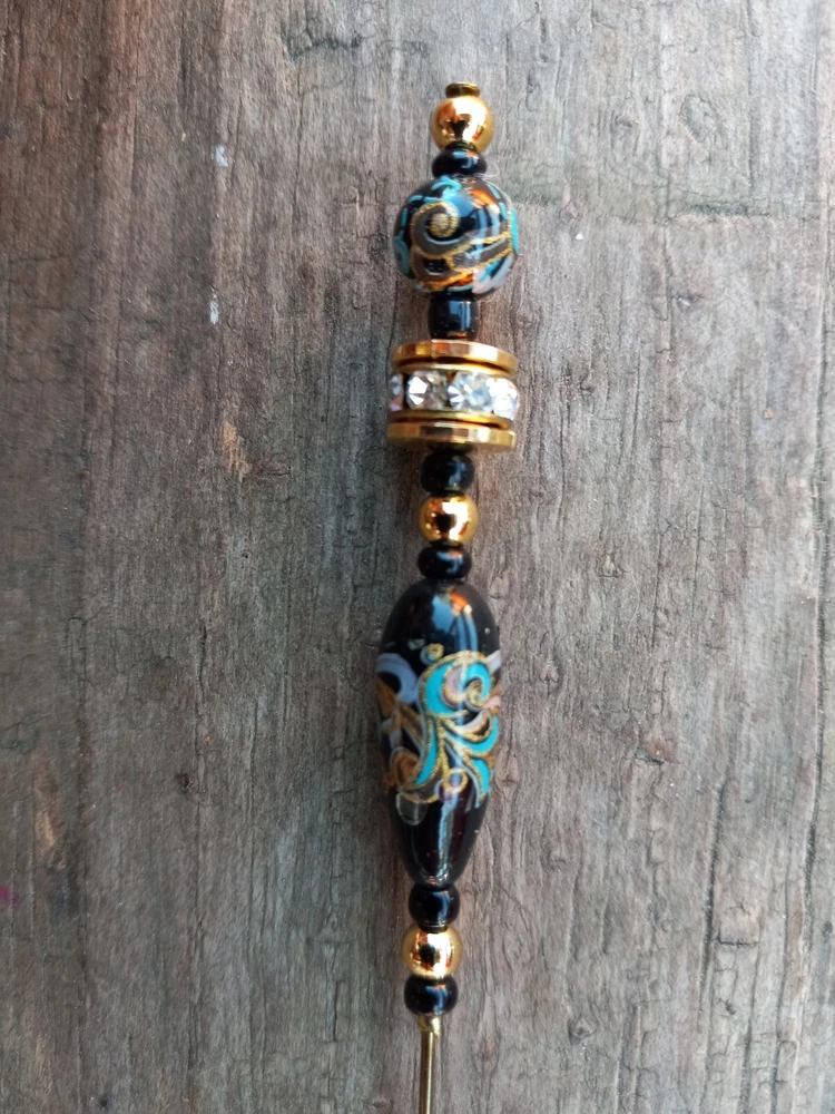 Gold & black rhinestone hat pin. Has turquise, gold & light purple design. Measures 4 3/4" long. **Item will be shipped USPS Ground in a padded envelope. NO INTERNATIONAL SHIPPING. **NO RETURNS. You are fully responsible for reading ad & asking any questions prior to purchase.**