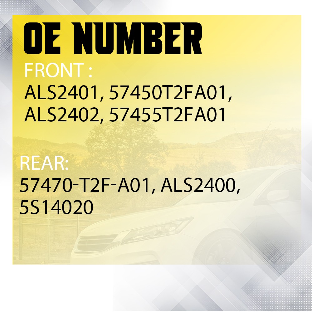 4X ABS Wheel Speed Sensor Fitment: For Honda | 2013-2017 Honda Accord Specifications: OE: Front: ALS2401, 57450T2FA01, ALS2402, 57455T2FA01 Rear: 57470-T2F-A01, ALS2400, 5S14020 Placement on vehicle: Front, Rear, left, right Features: All tested before shipment Each product is tested to perform as well as the original units and in many cases to exceed the manufactures specification. Perfect fit Manufactured according to originals for a perfect match with your car. Direct replacement Direct replacement from stock application. Drillings and cuttings are not requried. Warm notice 4 ABS Wheel Sensor Speed Front Rear Left & Right Fit: HONDA ACCORD 2013-2017 4X ABS Wheel Speed Sensor Fitment: For Honda | 2013-2017 Honda Accord Specifications: OE: Front: ALS2401, 57450T2FA01, ALS2402, 57455T2FA01 Rear: 57470-T2F-A01, ALS2400, 5S14020 Placement on vehicle: Front, Rear, left, right Features: All tested before shipment Each product is tested to perform as well as the original units and in many cases to exceed the manufactures specification. Perfect fit Manufactured according to originals for a perfect match with your car. Direct replacement Direct replacement from stock application. Drillings and cuttings are not requried. Warm notice Please double-check the part number and models in the description to guarantee it fits your vehicle before ordering. Packaging include: 4X ABS Wheel Speed Sensor What makes you choose our products? Rapid logistics and response: We will dispatch your order within one work day since your payment to guarantee that you can receive your order immediately. High quality: The raw materials are strictly inspected high-quality ones. In addition, our inspectors will inspect all the products again before they are dispatched to guarantee all customers receive good products. Guaranteed after sales service: We provide quality guarantee services 2 year. Any customer can contact us for any problem during the period. We provide after sales services within one work day. High cost performance: Providing products with high cost performance is our lasting objective. Our products may not be the cheapest or expensive ones, but they must be the ones with the optimal cost performance. In general,you can enjoy reliable quality, speedy service along with competitive price. Your satisfaction is my goal.My customer service is not only the guarantee of money,but also the guarantee for your time and expectation. Item Specifics Anticipated Ship Out Time Same day - 1 business day Brand AUXITO Bundle Listing Yes Year 2019 2018 2017 2016 2015 2014 2013 Connector Type Female Connector Features Male Terminal 60-Day Return Policy Fitment Type Direct Replacement Interchange Part Number ALS2401, 57450T2FA01, ALS2402, 57455T2FA01 Manufacturer Part Number 15633196 Manufacturer Warranty 1-year Replacement unlimited-mileage warranty Mounting Location Wheel Mounting Location Notes Includes wiring harness Number of Pieces (2) ABS Speed Sensor Number of Sensors Set of 2 OE Number ALS2401, 57450T2FA01, ALS2402, 57455T2FA01 OE/OEM Part Number ALS2401, 57450T2FA01, ALS2402, 57455T2FA01 Other Part Number 57470-T2F-A01, ALS2400, 5S14020 Part Name ABS Speed Sensor Performance Part No Placement on Vehicle Left and Right, Front Rear Superseded Part Number 57470-T2F-A01, ALS2400, 5S14020 Terminal Quantity 2-Prong Terminal Terminal Type Pin Type UPC 641517873093 Fits for : 2013-2017 Honda Accord FAQ ♥ If you have a decoding problem or any other problems, please contact us first, we will help you with it. We will reply you within 24 hours in working days. I'm a new seller, thanks a lot for your trust and convince! I will serve you with all my heart. ♥ Q1: Will this bulb fit my vehicle? A: We can match almost any vehicle to one of our bulb sizes. eBay only lets us include some vehicle fitments per listing, but if your vehicle does not show up on the compatibility table at the top of our listings, welcome you to contact us for free consulation before purchasing a product. Q2: My item has not arrived, what's taking so long? A: Sometimes items take longer than expected, especially if it’s going far or to rural area. Check with your post office to see if your item has been held up. Sometimes Royal Mail will not update a tracking number until it has arrived at its destination. If your item still don't arrive after a few days, let us know so we can double check for you and help solve it asap. Q3: My bulbs won't fit, help! A: Special bulb holder may be required. See if you can take the holder from the stock bulb. If not, let us know. The bulb size may be wrong, double check the item you received with the item you ordered. Do you have an aftermarket lighting housing? These may not be perfectly fitted for aftermarket bulbs and will require some manual modifications. Q4: Neither side lighting up? Both sides flicker, hyper flash, or work inconsistantly. A:Check the light fuses, and then check the ballast plugs to insure correct installation. If this doesn't work, there may be a voltage problem with the vehicle. You probably just need a relay or capacitor. Even though some bulbs are builtin resistors, they may still need a decoder. Pay & Ship (1). We gladly accepts payment via PayPal, We will ship your item(s) within 24 hours. (2). Before payment, please keep the consistency of Paypal address and ebay address. (3). Quantity orders are welcome! Returns (1). We offer 60 days free return policy. Please contact us within 60 days from the date you receive your order if you have any issues with the product or want return. Refund will be send after we got your resend package. (2). All returned items should be in the original packaging , return tracking information should be provided . Contact Us (1).Negative feedback will not help resolve any problems you have, please contact us via eBay messages before leaving negative feedback , our customer service will make best effort to help you with the issues. (2).We maintain high standards of exc