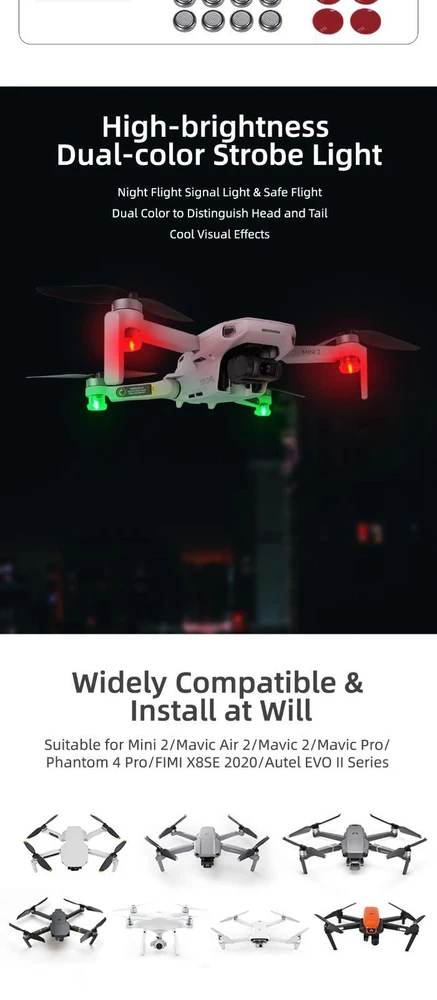 You may also like 8Pcs Foldable Blades Propeller Replacement for DJI Mavic Air 2 Drone Repair 18.69 USD Original Front Left Arm Landing Gear Leg Cover Antenna For DJI Mavic 2 Pro Zoom 14.99 USD MB-D12 Vertical Battery Handle Grip For Nikon D810 D800 D800E DSLR Camera 52.99 USD Remote Control Screen Protective Cover Sun Shade Hood For DJI Mini 3 Pro RC 14.59 USD For DJI Air 3 Drone Accessories Action Camera Holder Mount Connection Bracket 10.99 USD 3.69 USD For Gundam Hobby DIY Masking Tape Cutter For Model Making Tool Assembly Retrofit 5.99 USD 3.69 USD Product Description Features: High-brightness Dual-color Strobe Light, night flight signal light & safe flight, dual color to distinguish head and tail, cool visual effects. Widely compatible & install at will, suitable for Mini 2/ Mavic 2/ Mavic Pro/ Phantom 4 Pro/ Fimi X8se 2020/ Autel EVO II Series. 3 kinds of lighting modes, 2 high-brightness colors, quick flash, slow flash, constant bright. 120 mins long-time standby, about 120mins when flashing, 30 mins when constant bright. Quick-installation& 3M strong Adhesive, can be pasted on the arm, body or at any position of the drone Light weight: only 3g per light, no burden on the drone and do not affect flight. Specifications: Name: Sunnylife Strobe Light For Drone Product Size: 17*17*13mm Lighting Mode: Quick Flash/ Slow Flash/ Constant Bright Brightness: 30-40lm Battery Model: CR972 Power: 0.5W Battery Capacity: (3V/30mAh)*2 Use Time: Flash: about 120mins; Constant Bright: about 30 mins Net Weight: 3g/pcs What's included: 4 * Lights (Built-in batteries and pads) 8 * Batteries 4 * Pads Shipping Returns Contact Us Payment 1. Items sent from US warehouse. 2. Receiving time = Processing time + Shipping time. 3. Processing Time: Around 1-2 business Days. 4. Shipping Time: 3-5 business day. It may have a little delay during some holiday (such as Christmas), any problem, please feel free to contact. Always believe we can figure things out with communication, if it comes to return, the pacakge must be intact and the same as you receive. If you have any questions, please feel free to email our service specialists 24 Hours a Day, 7 Days a Week. We will reply you ASAP. Return/refund is accepted within 30 days after the buyer receives the item. NO exchange will be accepted after 30 days from the date when the item is received. Please contact us first before returning your product!!! If you have any questions, our Customer Service staffs welcome you to email us. We strive to answer all questions and resolve any problems as quickly as possible. We care about our valued customers, and will always try to help you. So if you have any problems, You can contact us 7*24, we will reply at the first time. We accept all verified payments from ebay. Orders will be shipped after receiving cleared payment. Shipping 1. Items sent from US warehouse. 2. Receiving time = Processing time + Shipping time. 3. Processing Time: Around 1-2 business Days. 4. Shipping Time: 3-5 business day. It may have a little delay during some holiday (such as Christmas), any problem, please feel free to contact. Returns Always believe we can figure things out with communication, if it comes to return, the pacakge must be intact and the same as you receive. If you have any questions, please feel free to email our service specialists 24 Hours a Day, 7 Days a Week. We will reply you ASAP. Return/refund is accepted within 30 days after the buyer receives the item. NO exchange will be accepted after 30 days from the date when the item is received. Please contact us first before returning your product!!! Contact Us If you have any questions, our Customer Service staffs welcome you to email us. We strive to answer all questions and resolve any problems as quickly as possible. We care about our valued customers, and will always try to help you. So if you have any problems, You can contact us 7*24, we will reply at the first time. Payment We accept all verified payments from ebay. Orders will be shipped after receiving cleared payment. Mini Storage Bag Two magic clapboards Travel Case For DJI Avata Drone Goggles 2 22.99 USD 3.69 USD Camera Aluminum Alloy Protective Frame Cover Holder For Insta360 one RS 28.99 USD 3.69 USD 17/19/21/91T 1/10 RC Car Clutch Spur Gears for ARRMA Senton Granite Typhon 4X4 12.39 USD 3.69 USD RC Airplane Plane Brushed Motor ESC Low Voltage Protection For Hobbywing Eagle 11.99 USD 3.69 USD NP-FZ100 Dummy Battery Adapter DC Coupler Cable For Sony A9 A9II A9III Camera 25.99 USD 3.69 USD DSPIAE 180-800#/1000-2500# Grinding Plate Sandpaper Tool Kit for Military Model 16.99 USD 3.69 USD Durable CYPE005 1/700 Photo-Etched PE Handrail & Ladder For Warship Model Ship 9.29 USD 3.69 USD Convenient Battery Charger Base For Sony NP-F Series LED Display 64.99 USD 3.69 USD 1/10 RC Car Steel+Alloy Lock Straight Axle Kit For TRAXXAS Slash 4WD Rustler 4X4 7.49 USD 3.69 USD Lightweight Splashproof Aluminum Motor Protective Cap Dust Cover for DJI Avata 12.99 USD 3.69 USD 1/10 RC Car Roof Shell Pot Pan Bag For SCX10 TRX-4 RC4WD D90 Decoration 6.99 USD 3.69 USD 2A-4A BLS1 BLS5 DC Coupler Dummy Battery with USB Cable for Olympus USB 19.99 USD 3.69 USD 15X Macro UV CPL ND8 ND16 ND32 Optical Glass Lens Filter for DJI Osmo Action 3 8.99 USD 3.69 USD 1/18 RC Car Front / Rear/ Bridge Side Axle CVD Drive Shaft For Axial UTB18 Capra 6.99 USD 3.69 USD Dustproof Sun-proof Glasses Protective Cover Accessories For DJI Goggles 3 6.99 USD 3.69 USD Protective Frame Housing Case Accs For DJI Osmo Pocket 3 Expansion Adapter Mount 12.99 USD 3.69 USD New Storage Bag Carrying Protective Case for Insta360 X4 Camera Accessories 7.29 USD 3.69 USD Universal RC 17mm 8mm HEX Nuts With Adjustment Wrench Screw Length Measurement 10.99 USD 3.69 USD For Wltoys 1/12 RC Car Full Metal RC Truck Upgrade Patrs RC Car Accessories 88.99 USD 3.69 USD StoreSafe Smart LiPo Battery Discharger to Storage Voltage For 2S-6S RC FPV 12.19 USD 3.69 USD ABS Anti-Falling Battery Buckle Fi