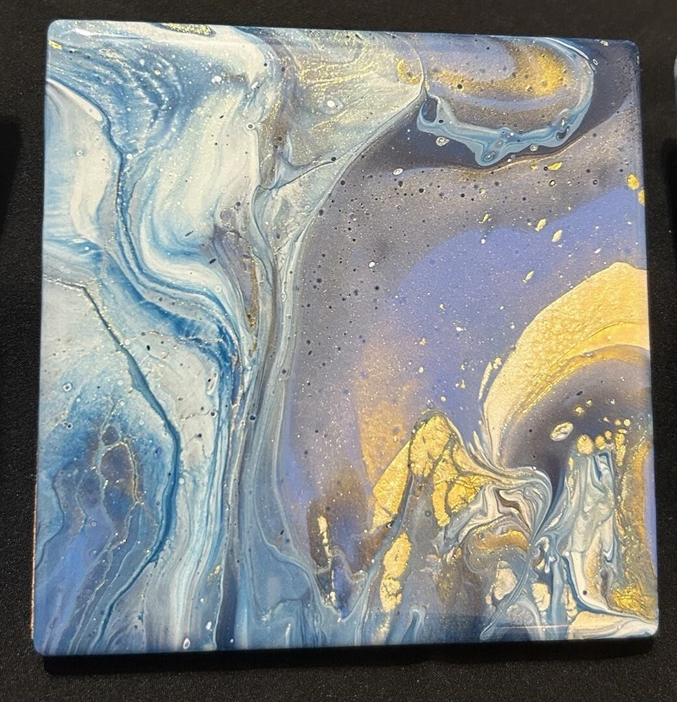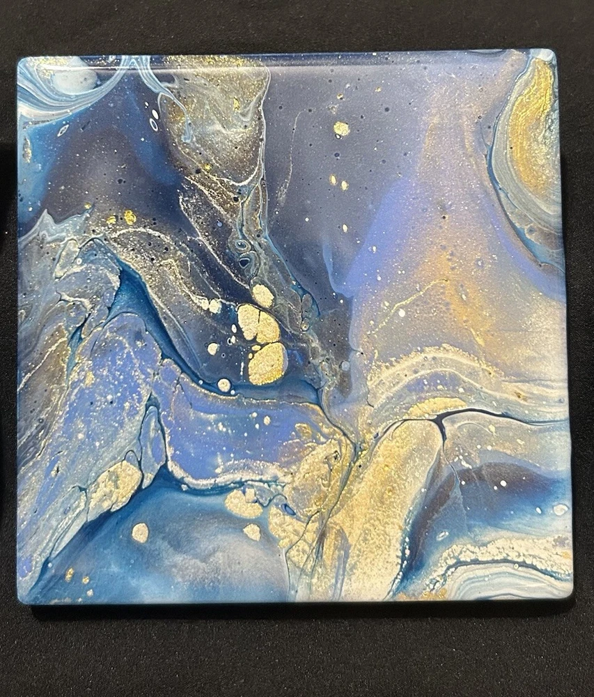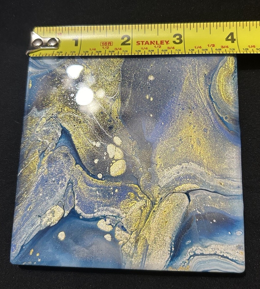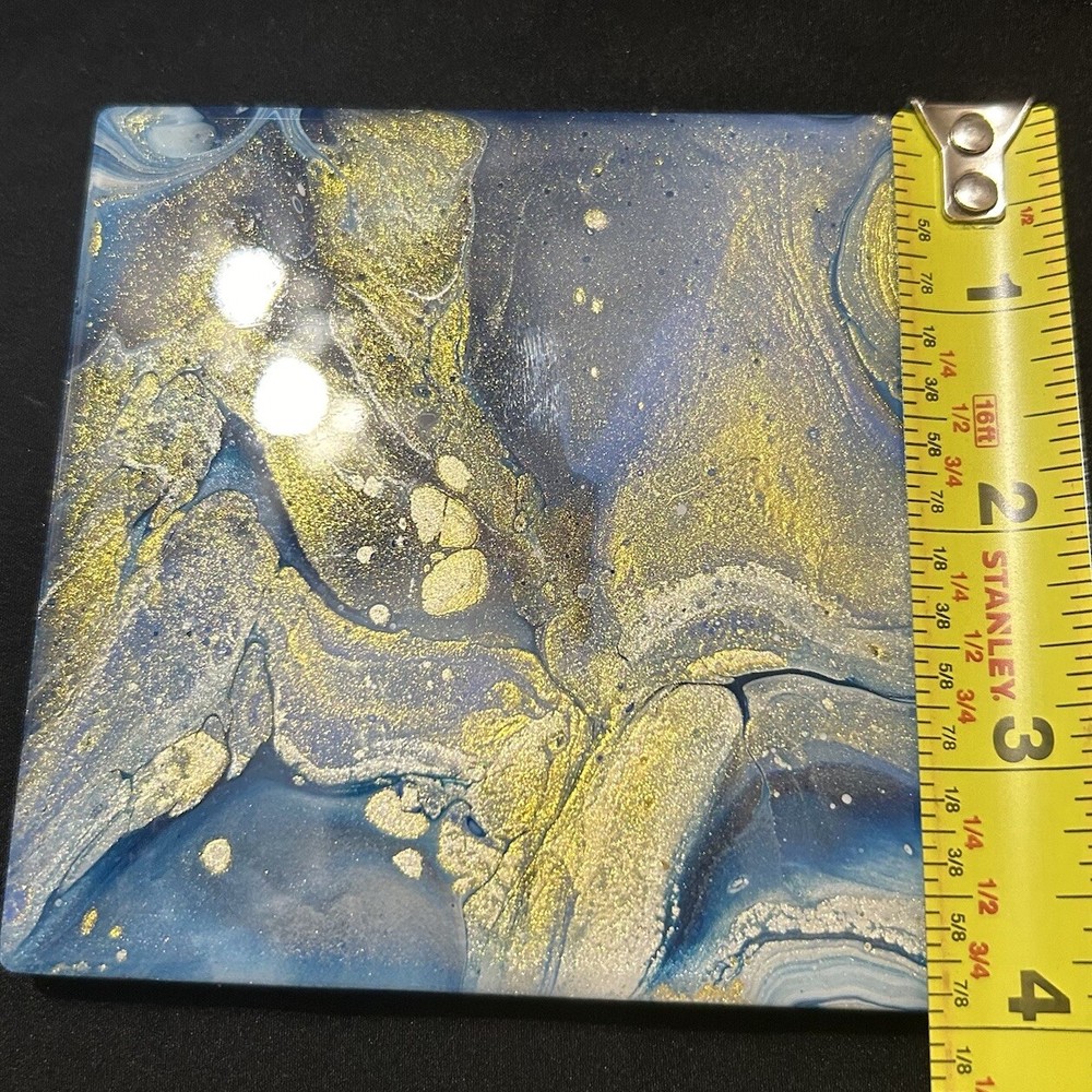 4 Cosmic Swirls Coasters 4” Blue Golden Hand Crafter Resin By Linda Burcel Water Good used condition. Minimal signs of wear and tear. Please study pictures carefully before purchasing Feel free to ask any questions. Thank you for visiting our store! 10