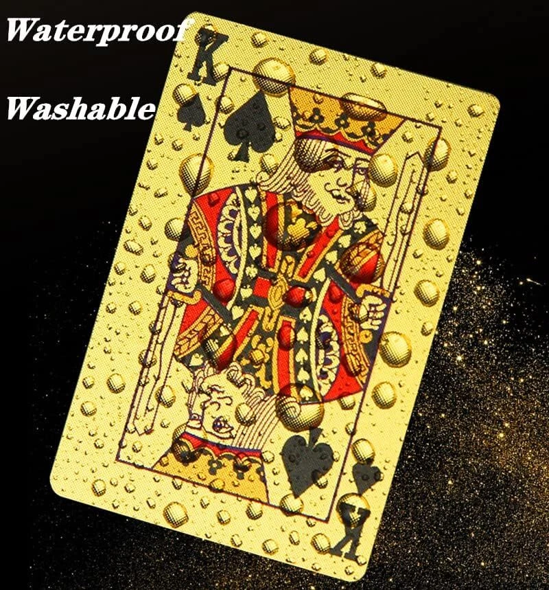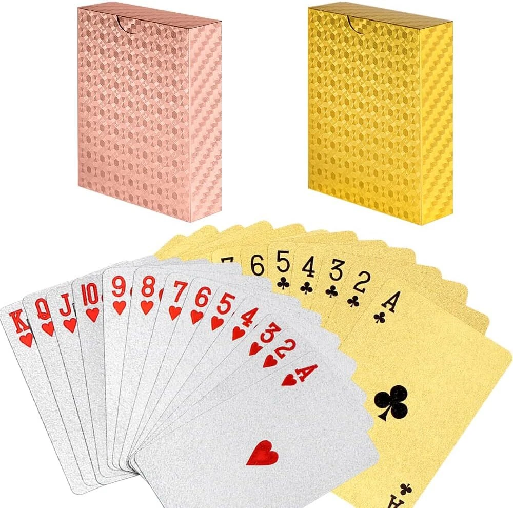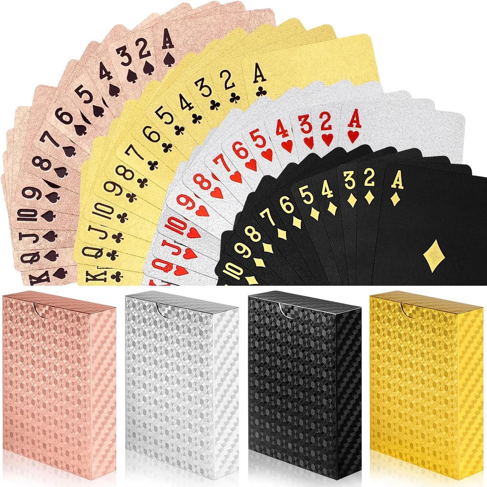 Material: These playing cards are made of sturdy plastic material, smooth surface, wrinkle-free, comfortable feel, can be used for multiple times. Exquisite Design: The playing cards is designed with foil, makes the card gloss and elegant, looks more luxurious, can bring you a comfortable playing experience. Waterproof & Washable: Made of waterproof material, feel free to take them under water to wash them, no worry for any stain, does not affect reuse. Easy to Shuffle: Each waterproof plastic card measures approx. 3.4 x 2.2 inch/ 8.7 x 5.7 cm, a proper size that fits most people's hand size, good flexibility makes them be easy to shuffle. Have Fun: You can play these cards with your friends family on Children's day, Christmas day, birthday, bar, new year party, family gathering party. It will bring you a lot of fun when playing and create a more relaxed and lively party atmosphere. Features: Easy to Shuffle: Each waterproof plastic card measures approx. 3.4 x 2.2 inch/ 8.7 x 5.7 cm, a proper size that fits most people's hand size, good flexibility makes them be easy to shuffle. Quality Material: These playing cards are made of sturdy plastic material, smooth surface, wrinkle-free, comfortable feel, can be used for multiple times. Have Fun: You can play these cards with your friends family on Children's day, Christmas day, birthday, bar, new year party, family gathering party. It will bring you a lot of fun when playing and create a more relaxed and lively party atmosphere. Specifications: Material: plastic Color: gold, silver, black, rose gold Size: 3.4 x 2.2 inch/ 8.7 x 5.7 cm Quantity: 4 pack Package includes: 4 X Plastic Poker Cards