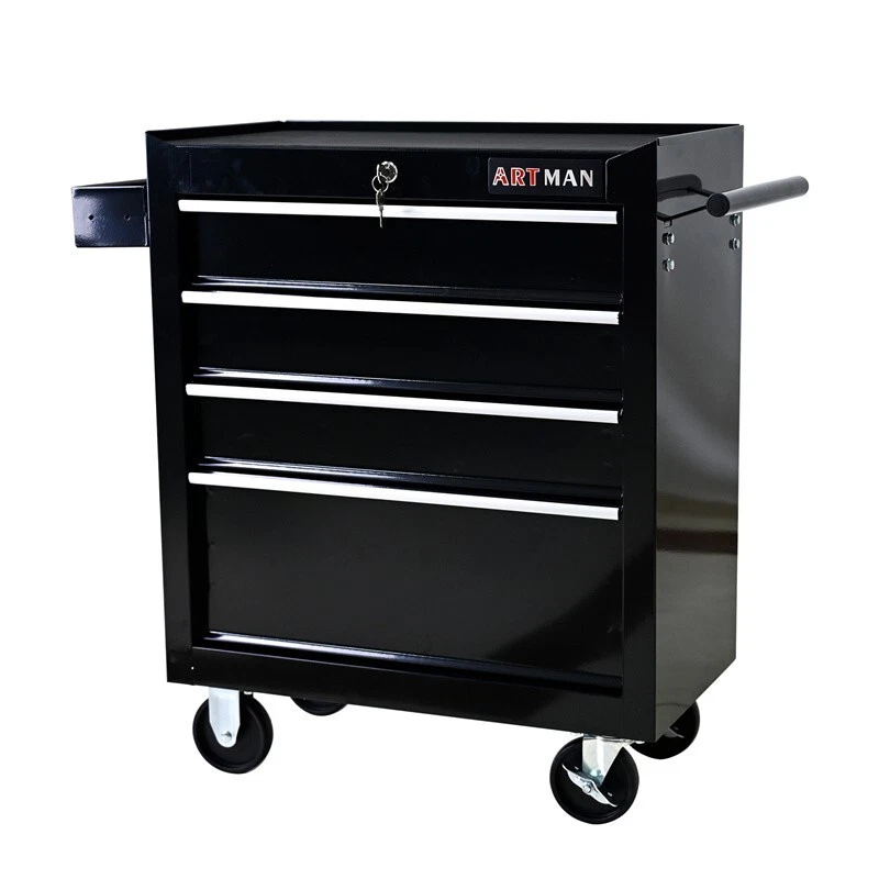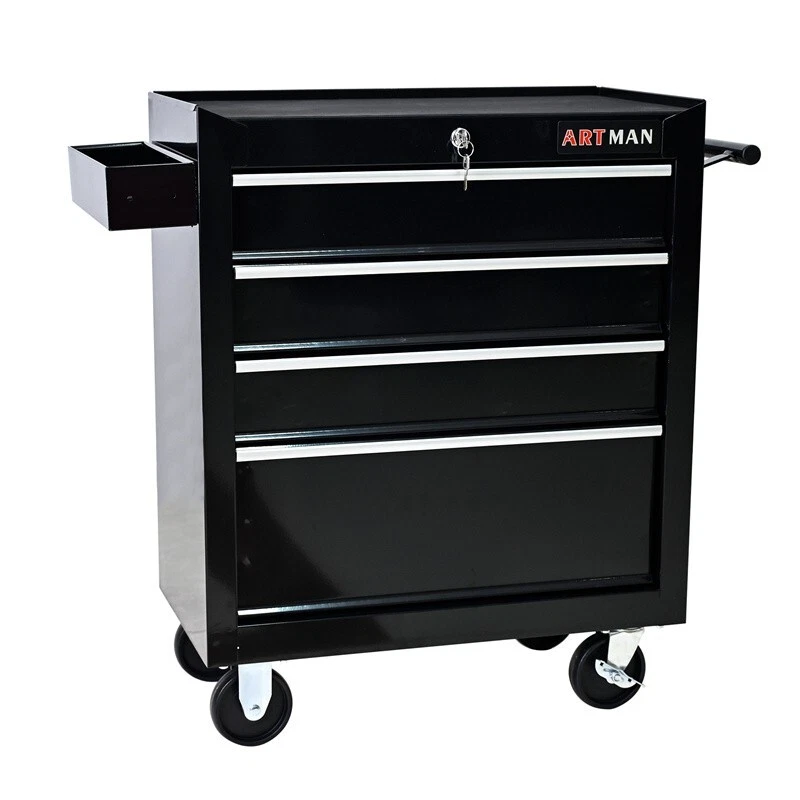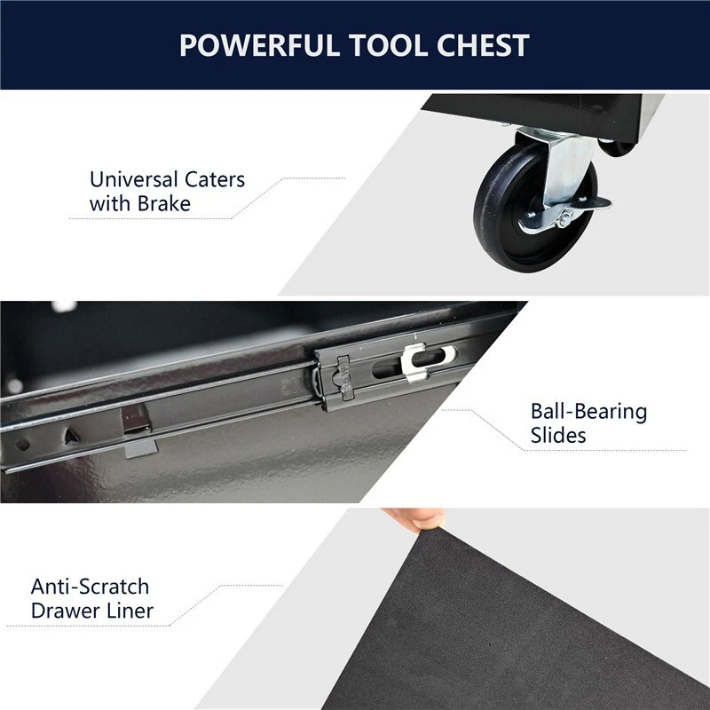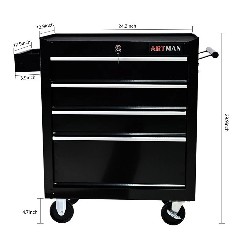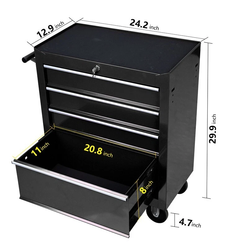Features and Details: 6 Drawers multifunctional tool cart with wheels The tool box is also lockable and can be used as a removable, attachable and mobile case The opening and closing of the drawers of the tool cabinet is very gentle thanks to the ball-bearing drawers The robust and powder-coated steel construction is used for high wear resistance. This assembly trolley has 4 steering wheels, 2 of which with parking brakes, so you can move the trolley freely in the garage, but also stop in one place Specification: Color: Black Material : Cold Rolled Steel Size: 24.25" × 12.99" × 29.33" Surface Finish : Powder Coating Powder Coating : 4" Casters (2PCS with brake and 2PCS without brake) Weight (lbs.): 48.50