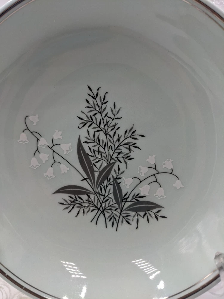 These bowls are a very pale blue-green color with a design of lily-of-the-valley and platinum trim. The bowls have a diameter of about 5.5 inches and are about 1.25 inches high. I am a careful and thorough packer, but for some of the items I sell, I’m not able to use combined shipping because of their size or propensity to break if put into a box with other items. If you purchase more than one item from my store and ask for combined shipping, I will do my best to accommodate your request. I will accept any reasonable offer so please feel free to send your offer. T hank you for visiting my store. I hope to see you again soon!