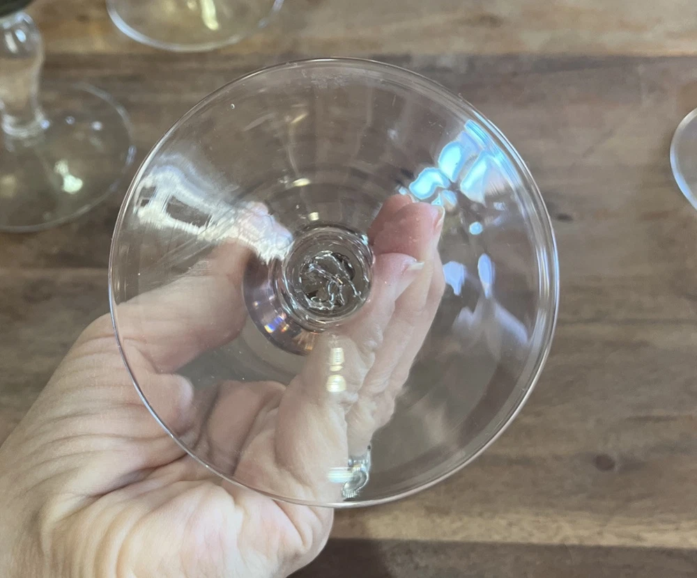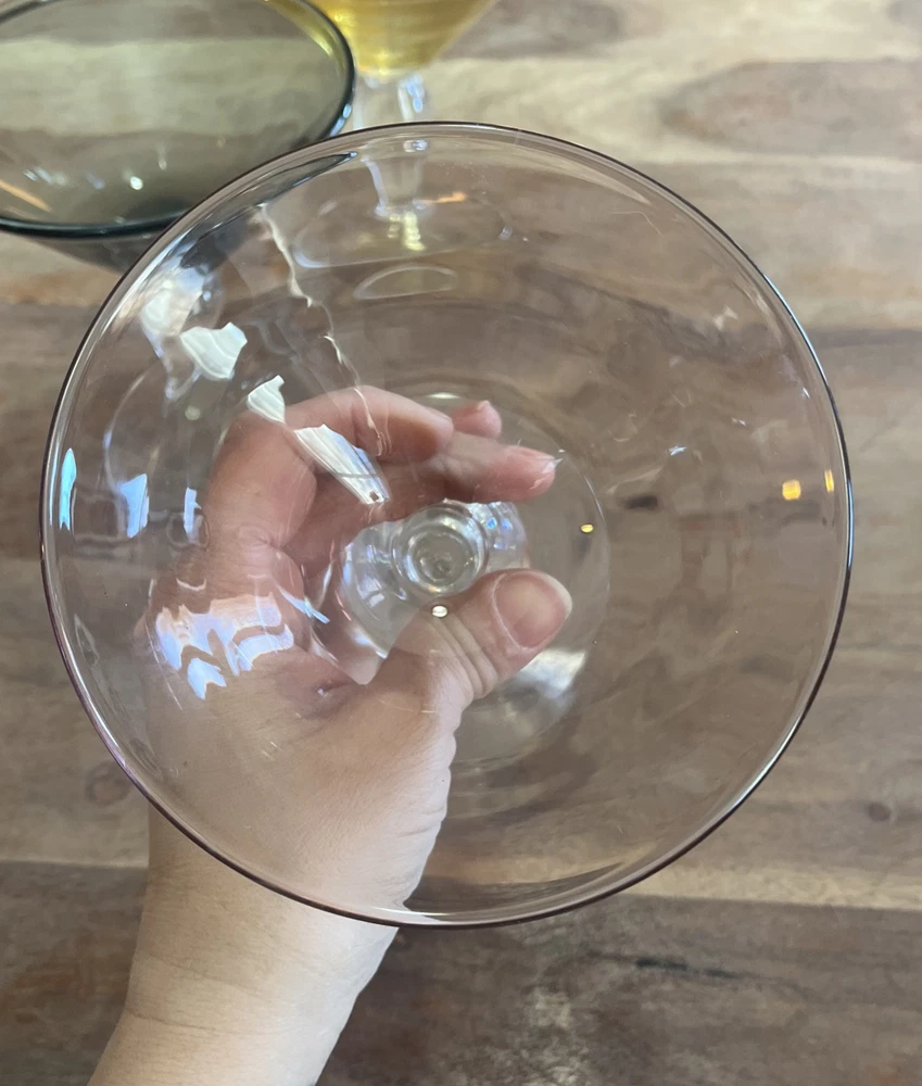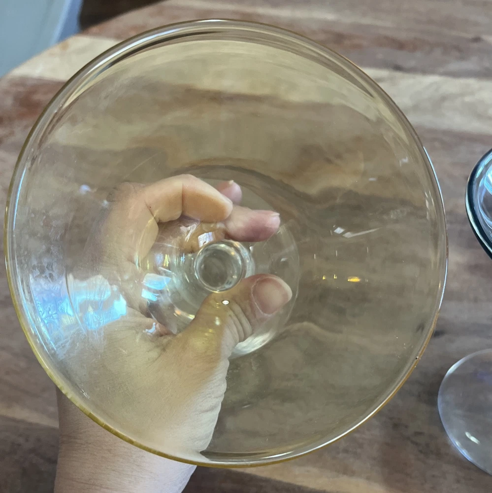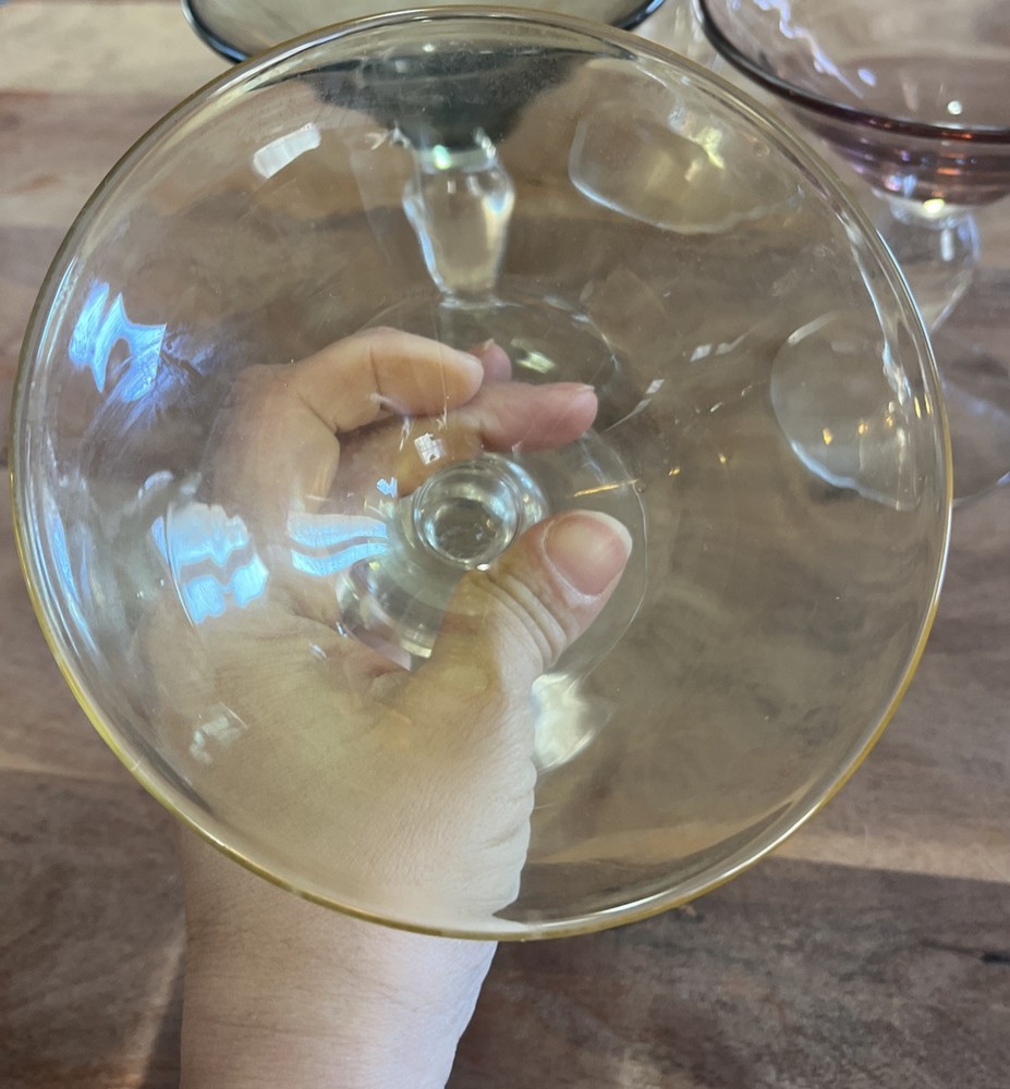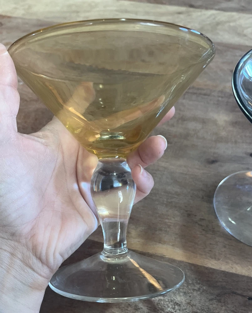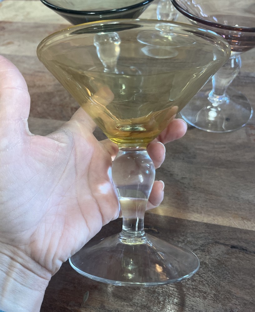 This set of four vintage martini glasses is a must-have for any collector or enthusiast. Each glass features unique hand-blown design, with three glasses in bright yellow and one in deep purple. The glasses are 5.5 inches tall and 5 inches in diameter, perfect for any cocktail. The brand of these glasses is White, and they are made using hand-blown glass production technique. These glasses are perfect for any occasion, and your guests will be impressed with their unique design.