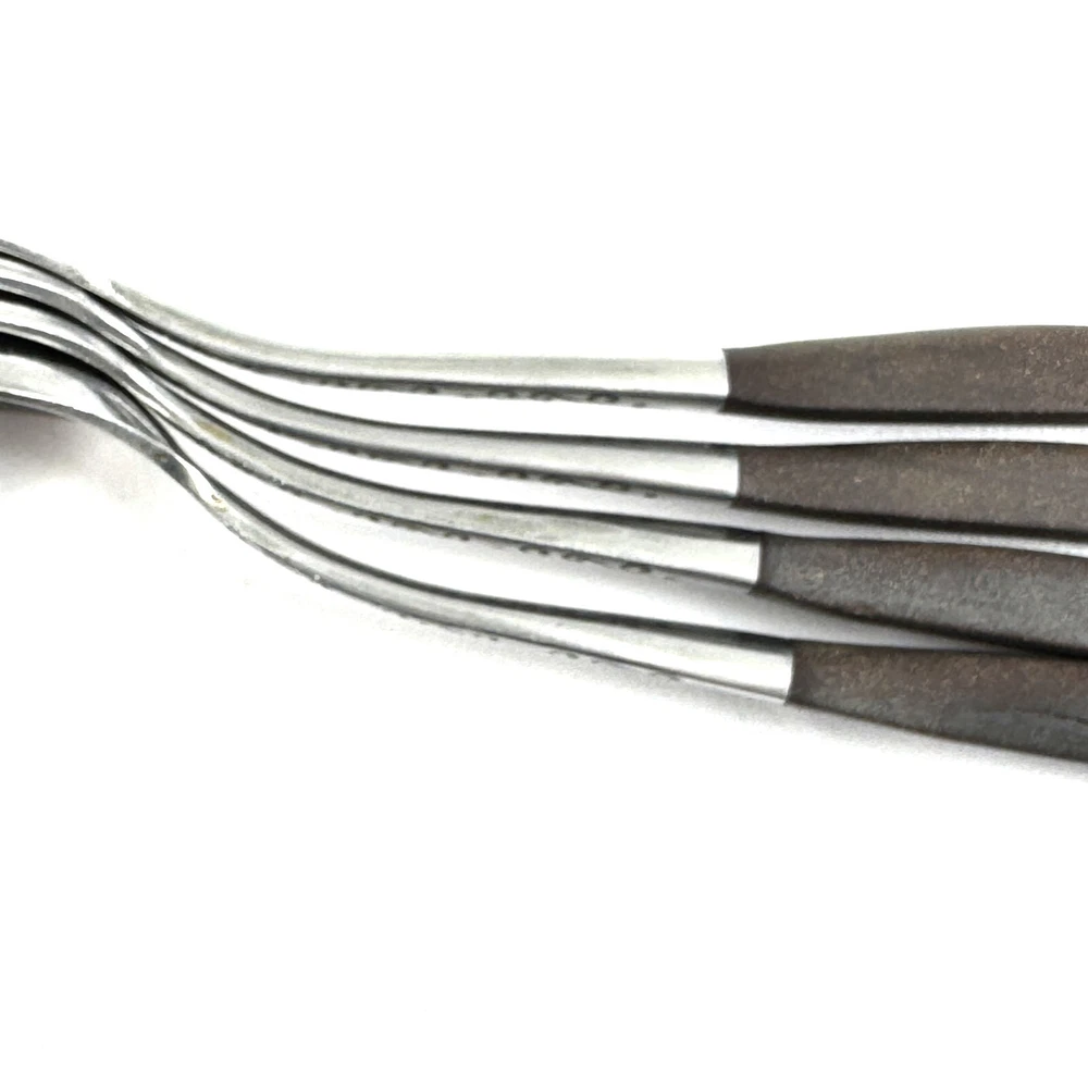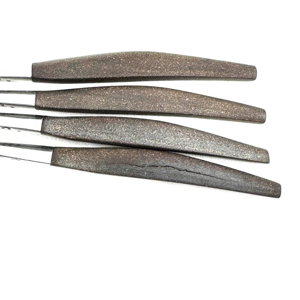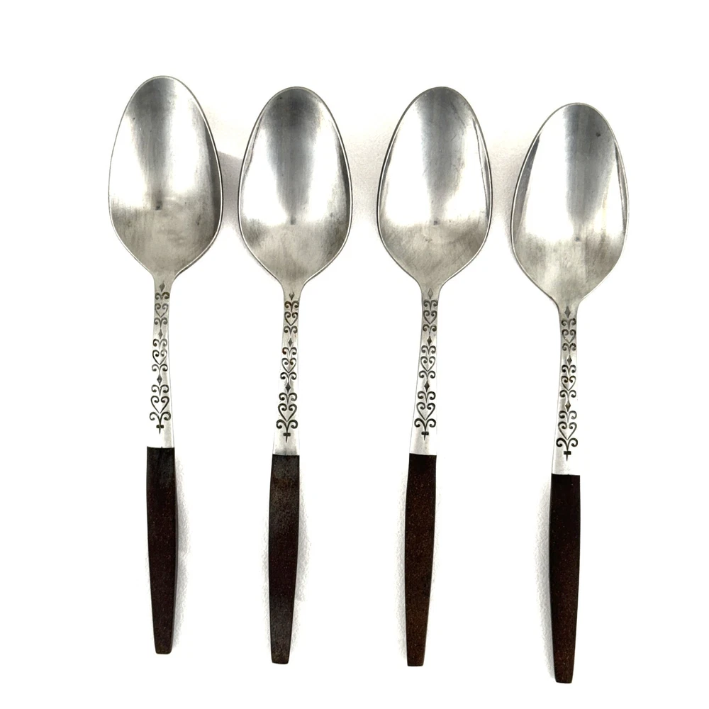 Offering a lot of 4 Interpur INR2 oval soup spoons 7.75” long, mid-century modern style, a discontinued pattern made in Japan. The brown synthetic handles are sturdy and have cracks. The stainless steel is in good condition, no chips, dents, or disposal damage. There are surface scratches and wear consistent with normal use. Please view the photos for details and condition. Measurements and photo colors are approximate. For extra protection your items will be packed in plastic sleeves and shipped in a box. For combined shipping, request an invoice before paying. Shipping is your choice of USPS Ground Advantage or USPS Flat Rate Priority at the rate determined by eBay. Terms of Sale: Photos are of the actual item you will receive and is sold "as is". Placing an order is your agreement that you know what you are buying, have viewed the photos and find the condition acceptable. If you have any questions or concerns about your order, contact me through eBay Messages. Please inspect your item upon arrival and contact me if there are any problems so we may work out a solution, before you leave feedback or request a refund . No returns please.