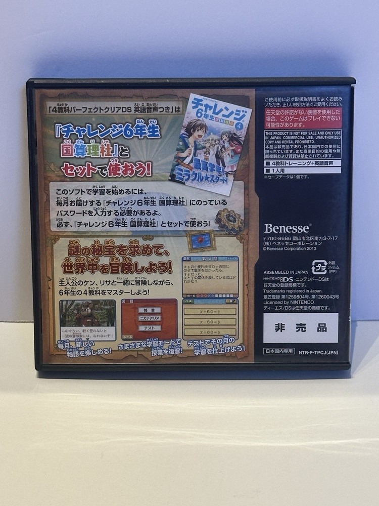 The product is a Nintendo DS game titled "4 Kyouka Perfect Clear DS: Eigo Onsei Tsuki" published by Nintendo. It is a Japanese version (NTSC-J) of the game that has been tested and is compatible with US consoles. The game comes as a cartridge only, without any additional accessories included. This product is offered by a US seller, making it convenient for gamers in the United States to enjoy the unique gameplay and challenges offered by this title.
