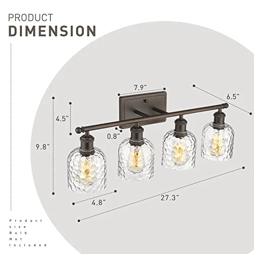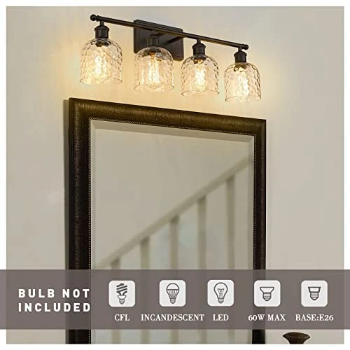 Menu 1. We require immediate payment. 2. We currently accept payment via eBay managed payments only. 3. Once payment is cleared, we will dispatch your shipment within 1-3 business days. Please refer to the "Shipping" tab for more information regarding shipping speed to your destination. 4 Light Fixtures for Bathroom Above Mirror, Vintage Vanity Lighting Fixtures, Oil Rubbed Bronze Finish with Clear Hammered Glass, ZJF63B-4W ORB Product description 【FARMHOUSE & INDUSTRIAL DESIGN】: The 4-light vanity lights over mirror feature a clear hammered glass shade and oil-rubbed bronze finish, reflecting the vintage minimalist design that is suitable for most homes and providing perfect lighting for any space. 【UP/DOWN EASY INSTALLATION】: Hard wired. This farmhouse mirror light can be mounted facing upward or downward to suit your needs. Includes all mounting hardware for quick and easy installation. 【ETL LISTED & WARRANTY】: ETL listed for your safety. It is backed by a 1-year manufacturer's warranty. This oil rubbed bronze bathroom light fixture is ideal for the bathroom, bedroom, dressing room, powder room, headboard, vanity table, makeup dressing table, mirror cabinets, hallway, etc. 【BULB REQUIREMENTS】: Requires 4 x E26 base 60W bulb (incandescent, LED, or CFL). Bulb sold separately. 【24/7 QUALITY SERVICE】: We offer a 30-day money-back for any reason. If you encounter any quality or installation issues, such as a broken glass shade, need replacement parts or help with installation, please don't hesitate to contact us for easy and fast customer service. PLEASE MESSAGE US IF YOU HAVE ANY OTHER QUESTIONS, AND MANY THANKS FOR READING ALL OF THIS. Copyright ©#. All Rights Reserved.