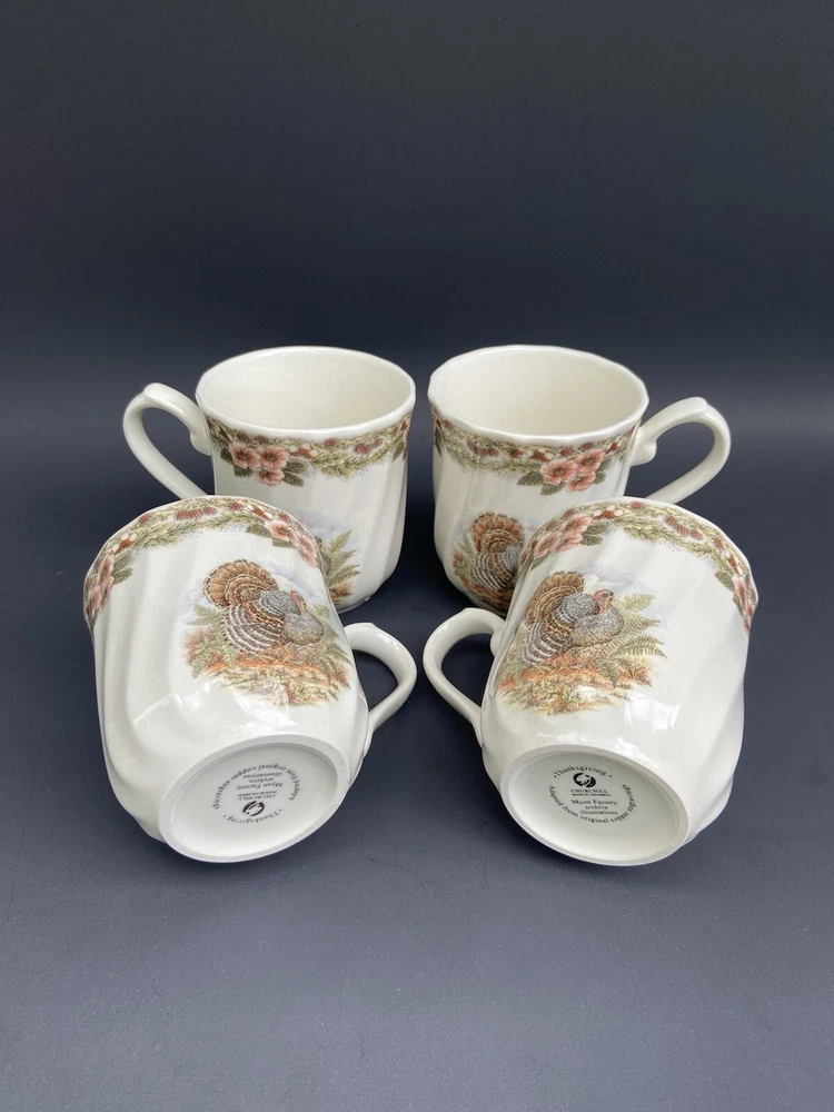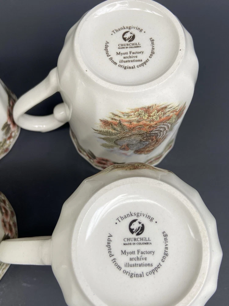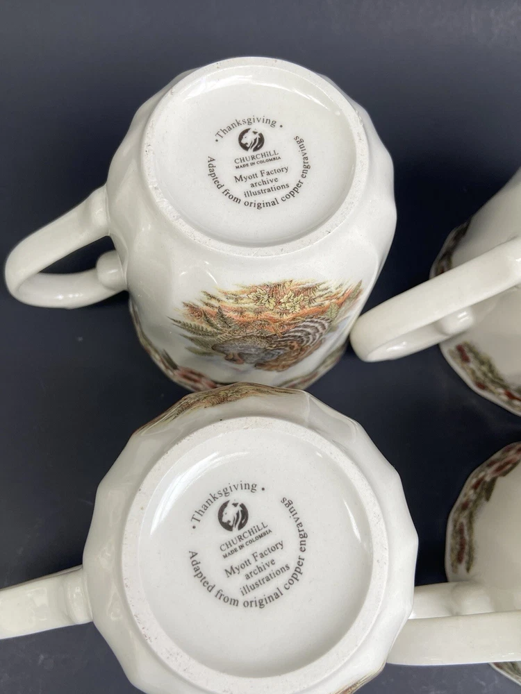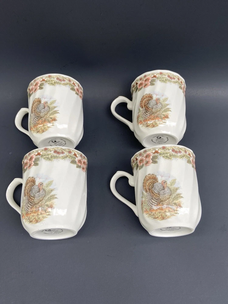4 Churchill Myott Thanksgiving Tea/Coffee Mugs Turkey Floral Swirls NEW. Approximately diameter of 3.25 inches wide, height 3.75 inches tall and capacity of approximately 10 US fluid ounces. All are unused, glossy and no signs of wear; no surface scratches. No chips, no crazing, no cracks nor chips noted. All of the pictures were taken in natural daylight to capture the closest actual shade of color; however and in person, the mugs might be slightly brighter or darker than the photos due to camera’s autofocusing features. The set weighs approximately 2 pounds and 2 ounces without packaging material. Will package with great care and thank you kindly for your consideration. REASONABLE SHIPPING: Calculated shipping: Weight and distance based shipping via USPS Ground Advantage domestically USA from South Florida. USPS Ground Advantage is lowest shipping cost. Estimated delivery of 2-8 business days. Shipping costs is based on item(s) weight including packaging materials and the distance from the seller’s zip code to the buyer’s zip code. Buyers whose shipping address/zip code is in the East coast of USA tend to have higher shipping costs as distant is longer from seller’s South Florida zip code. Ships globally via Ebay International Shipping Delivery.