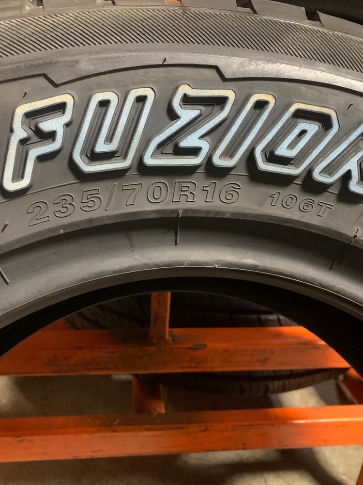 Four (4) New 235/70R16 106T Fuzion SUV All Season Tires Free Shipping These tires are new, not blems, and have never been mounted. Please check fitment before you bid, and email with any questions. These tires are 2021 production. If this concerns you at all, please do not purchase these tires. We do not accept returns based on the age of the tires. By making a purchase, the buyer agrees to the production year listed in the item description. 1x = 4 tires Free shipping for 4 tires in the 48 Continental US States Only!
