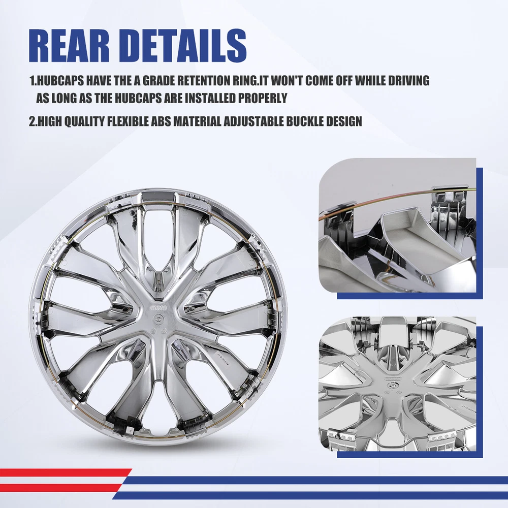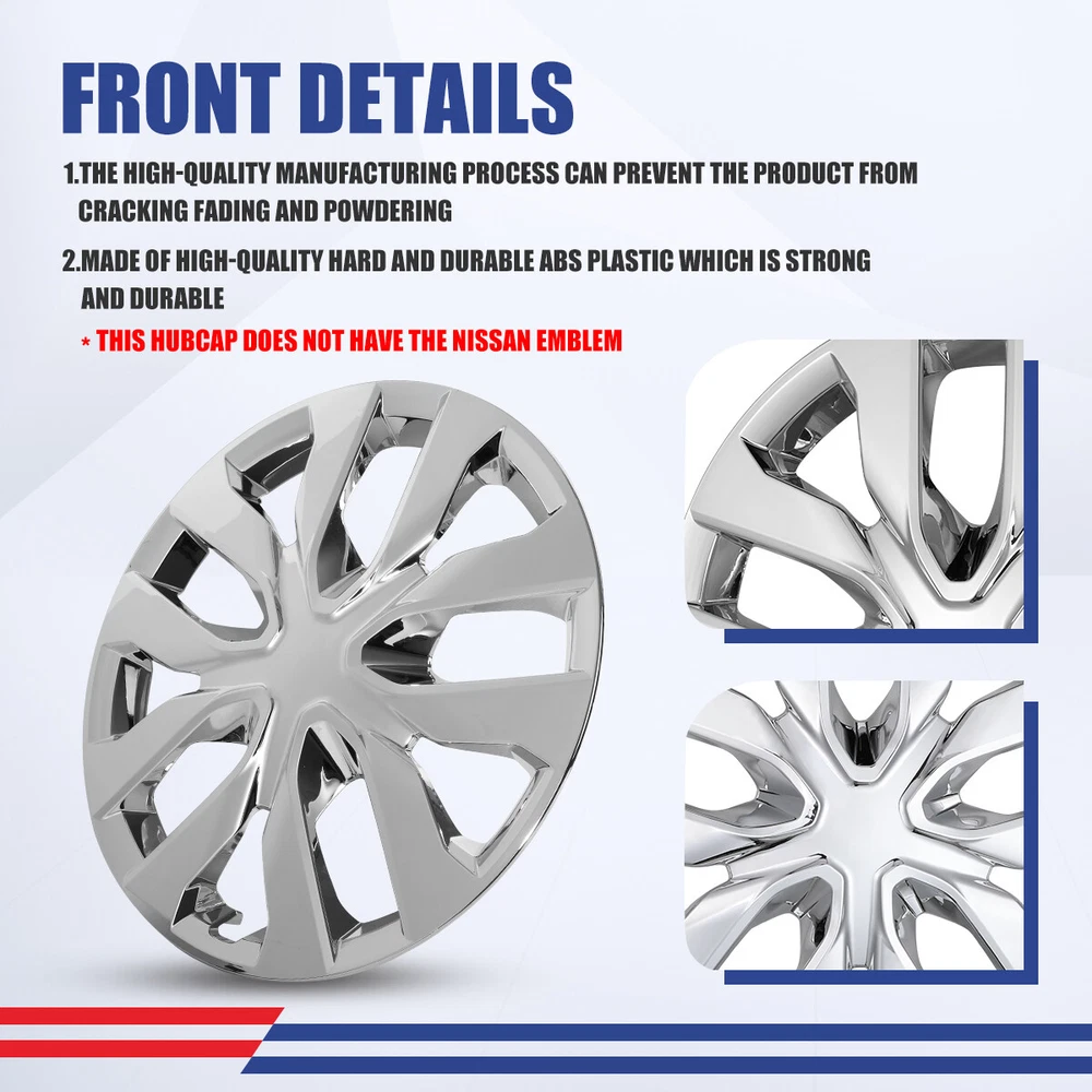 4 PCS 17" Hub Caps for Nissan Rogue 2014-2020 Snap On Wheel Rim Covers Chrome Specification: Type: Wheel Hub Caps Color: Chrome. Compatible Wheel Diameter: 17 inch Features:Car Wash Safe, Easy to Install, No Tools Required Material: Plastic, ABS. Wheel Type: Steel Placement on Vehicle: Front, Left, Rear, Right Installation Type: Snap-On Features: Fit For 2014-2020 NISSAN ROGUE - Design for 17" wheel hubs. Please know that and check your wheel before purchase to ensure fitment. Protect Your Wheels - Keep your vehicle looking sleek and new with these universal-fit hubcaps that offer reliable protection against scratches, dings, and other types of damage. Easy to Install - Designed to fit most standard wheel size, these hubcaps can be quickly and easily snap on your wheels without the need for special tools, making them a great choice for busy vehicle owners. Durable - Made from high-quality ABS materials, these hubcaps are built to withstand the rigors of daily use, keep your vehicle looking great for years. Stylish - Upgrade the look of your car or truck with these sleek hubcaps to enhance the appearance of your vehicle. Fitment: For 2014-2020 NISSAN ROGUE Package Includes: 4PCS Hubcaps. Payment Delivery details Terms of sales About us Contact us Payment π€ We accept PayPal (Recommended), credit card, VISA, Google Pay & Discover etc. π€ Please submit your payment within 7 days after your purchase. π€ If not, eBay will automatically open an Unpaid Item Dispute on our behalf if the item(s) are not paid within 7 days. Delivery details π€ Please double check your delivery address and contact information. π€ All items will be shipped within 1 business days after payment received. π€ Tracking numbers will be easily accessible ASAP they are created and processed. Terms of sales π€ Free 60 days Return, we will cover the return post fee. π€ If a defective product was received, please do not hesitate to message us via eBay message. π€ We will response in 24 hours in business to resolve the problem π€ We stand behind our products. Items can be returned for exchange or full refund within 60 days from the date you receive. About us π€ Winjet has a huge warehouse and office located in the United States. π€ All US domestic 48 states customers are able to benefit from the FREE SHIPPING services. π€ Our experienced, professional customer service representatives offers prompt and courteous service. π€ Best quality products, outstanding services and professional experience keep our customers. Contact us π€ Please feel free to contact us if you have any problems. π€ Emails will be replied within 24 hours in working days. π€ After hours emails will be replied on the next business day. Brand WINJET Color Chrome Type Hub Cap Placement on Vehicle Left, Right, Front, Rear Manufacturer Part Number 5137 Material Plastic, ABS Superseded Part Number STEEL WHEEL:40300-4BA0B, 2014-2020 NISSAN ROGUE Wheel, HUBCAPS: 40315-4BA0B, 2014-2020 NISSAN ROGUE Wheel Cover Bundle Listing No Vintage Part No Modified Item No Interchange Part Number 17 inch replacement hubcaps fit Rogue R17 steel wheels Manufacturer Warranty 1 Year OE/OEM Part Number STEEL WHEEL:40300-4BA0B, HUBCAPS: 40315-4BA0B Number in Pack 4 Country/Region of Manufacture United States Universal Fitment No Finish Glossy, Matte, Rust Preventative Compatible Wheel Diameter 17 in Performance Part No Features Flexible, Lightweight, Easy to Install