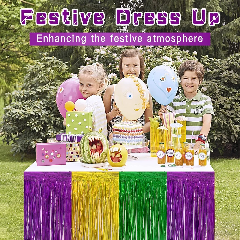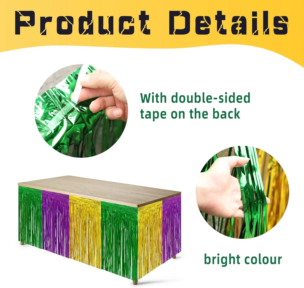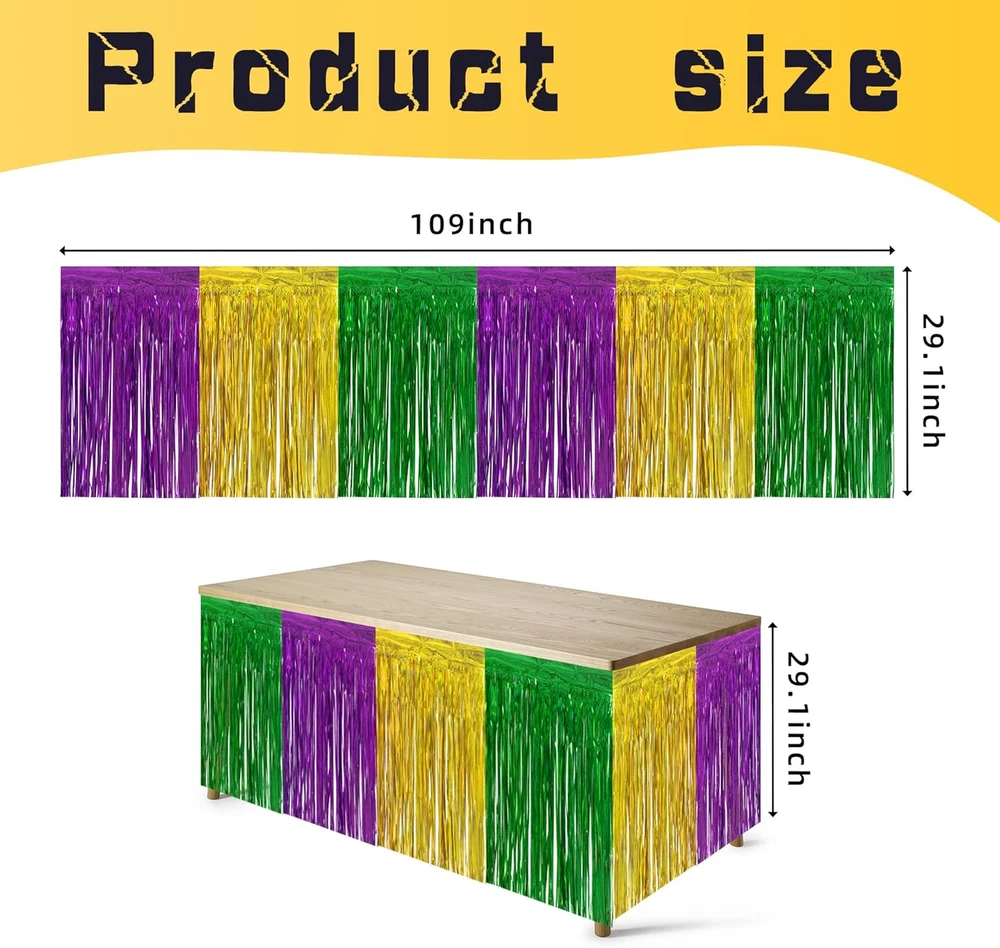 Store New Arrivals Add to Favorite View Feedback Contact Fast deliveries to the customer's home Quality customer service John Make the customers happy! 4 PCS Mardi Gras Party Table Skirt-29 X 109 Inch Mardi Gras Metallic Fringe Table Skirts-Purple Gold Green Tinsel Foil Fringe Decoration for Mardi Gras Holiday New Orleans Masquerade Party Description Package includes: You will get 4 PCS Mardi Gras table skirt,each one is about 29 x 109 Inches.You can cut the size you want according to the decoration requirements.Suitable size and vibrant colors ,perfect for your Mardi Gras party venue decoration. Creative design:These table skirts use the classic gold, purple and green color combination, with bright colors The self-adhesive design is adopted, which is convenient for pasting and not easy to fall off. Add more color to your masquerade party. Durable material:These metallic fringe table skirts are made of high-quality metallic foil,bright color, reliable to use.When the wind blows,it will swing with the wind,in line with the theme of Mardi Gras. Easy to use: The top of each metal tassel table skirt is equipped with self-adhesive tape, which can be easily pasted on the table or wall by simply tearing the tape,you can easily hang them wherever you want to decorate and attract more attention. Wide Applications:the Mardi Gras metallic fringe table skirts are very suitable for carnival parties, masquerade balls, Hawaiian parties, weddings, etc. Perfect party table decoration. Product Description Item Weight 12.3 ounces Batteries required No Country of Origin China Color 4pcs Package Dimensions 9.13 x 7.91 x 0.67 inches ABOUT US We offer the best prices around on high quality products. Our E-store includes media such as books, movies, music and games while offering electronics, toys, sporting apparel, clothing, tools, general home, garden items and more. SHIPPING We are always working hard to ensure your package arrives as soon as possible. Please understand that some factors like weather, high postal traffic, and the performance of shipping companies are outside of our control. We offer free shipping to the lower 48 states and ship within 2 business days of payment, usually sooner. We do not accept P.O. Boxes. Please provide a physical address. For shipping outside of the continental USA, we only use eBay's Global Shipping Program. The item is shipped to KY and then sent to the rest of the world. International customers are responsible for all duties and taxes. Continue to 'check out' to calculate costs for shipping the item to your country. Messages regarding eBay's Global Shipping Program MUST be directed at eBay EXCLUSIVELY. RETURNS We offer a 30-Day Return Policy on items in which you are not completely satisfied with. You have the option of a full-refund or an exchange of the item. No returns are available on items shipped outside of the USA PAYMENT We accept PayPal. CONTACT US This page content is yet to come Please ad us to your favorite seller and visit again later Thank You CUSTOMER SATISFACTION We try our very best to make sure every customer is completely satisfied. If there's a problem, message us! We're happy to help. WE ACCEPT