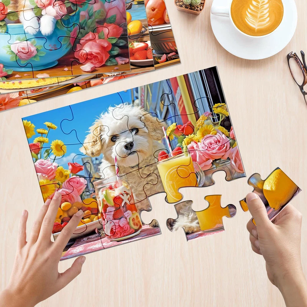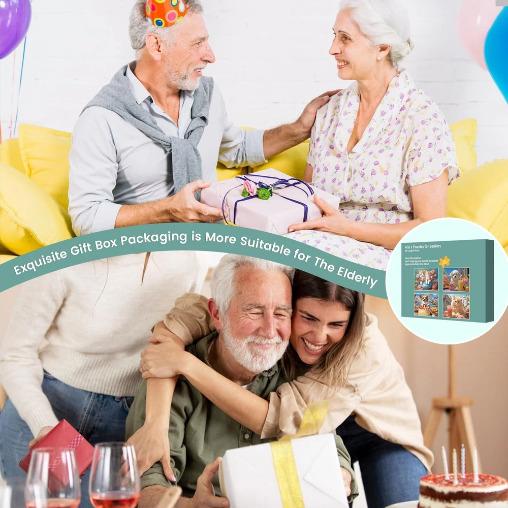 DEMENTIA PUZZLES FOR SENIORS SET INCLUDES: 4-piece puzzle of 16 pieces each. Puzzles measure approximately 11.8 x 8.7 x 0.1 inches and include 4 x puzzles, 4 x 1:1 instructional originals, 4 x folio bags, and a box. Designed to provide the best combination of challenge, interest and engagement for people living with dementia and Alzheimer's. COGNITIVE GAMES FOR ELDERLY: Highly saturated colors stimulate vision and improve visual perception in older adults, making it a great source of entertainment for seniors and can create lasting memories and strengthening your bond. MULTI-SENSORY EXPERIENCE: Our large piece puzzles have a unique texture and an extra-thick 0.1 in design, while providing a firm grip that won't fall off. This design is particularly beneficial for older individuals with dexterity challenges. ECO-FRIENDLY AND DURABLE: We strongly believe in protecting the world we love. That's why our puzzles are made from thick, sturdy recycled paper that is not only easy to clean and use multiple times, but also protects our environment. PERFECT GIFT: Looking for gifts for seniors? Our jigsaw puzzles make thoughtful gifts for seniors, whether they have dementia or are looking for a fun and rewarding pastime. (Product packaging does not contain the words "dementia" or "Alzheimer's disease")