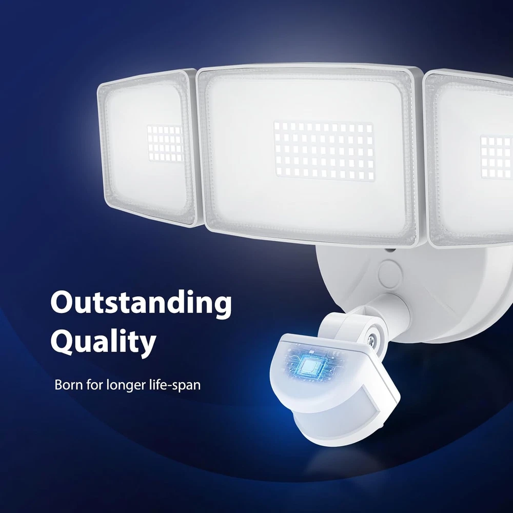BRIGHT SECURITY: Onforu 65 W LED motion sensor lights deliver up to 6500 lumens of brightness to illuminate a large outdoor area automatically AUTOMATED LIGHTING: The PIR motion sensor detects movement within a 180° area up to 72 feet away, activating the lights for 10-600 seconds to deter intruders WEATHERPROOF DESIGN: With an IP65 waterproof rating, these flood lights withstand rain, snow, and outdoor elements to provide reliable lighting year-round LONG-LASTING LEDS: High-quality 6500 Kelvin white LEDs provide energy-efficient lighting with a lifespan of over 30,000 hours to save on replacement and electricity costs EASY TO INSTALL: Easily hardwired to the outside of your home for around-the-clock power and peace of mind Product Description 1 Energy Saving 2 Reliable Design 3 Motion Detector