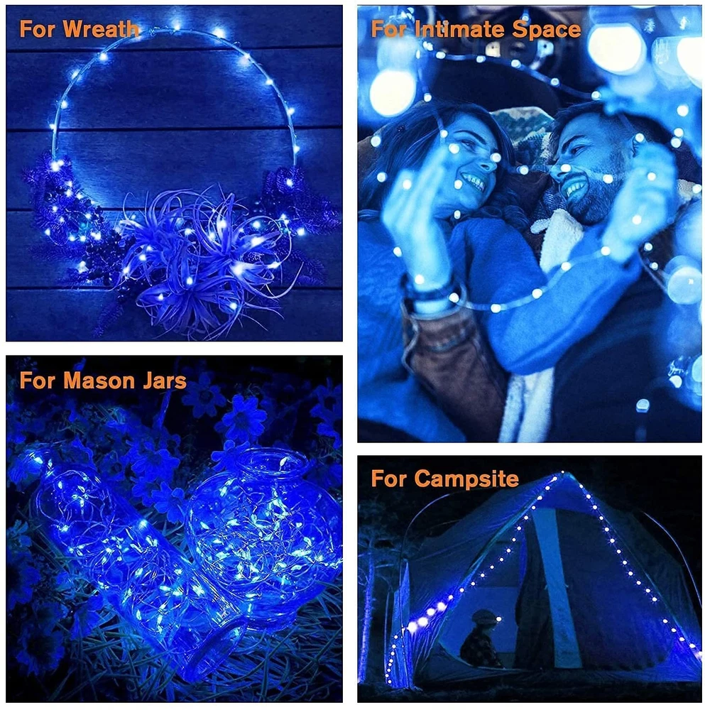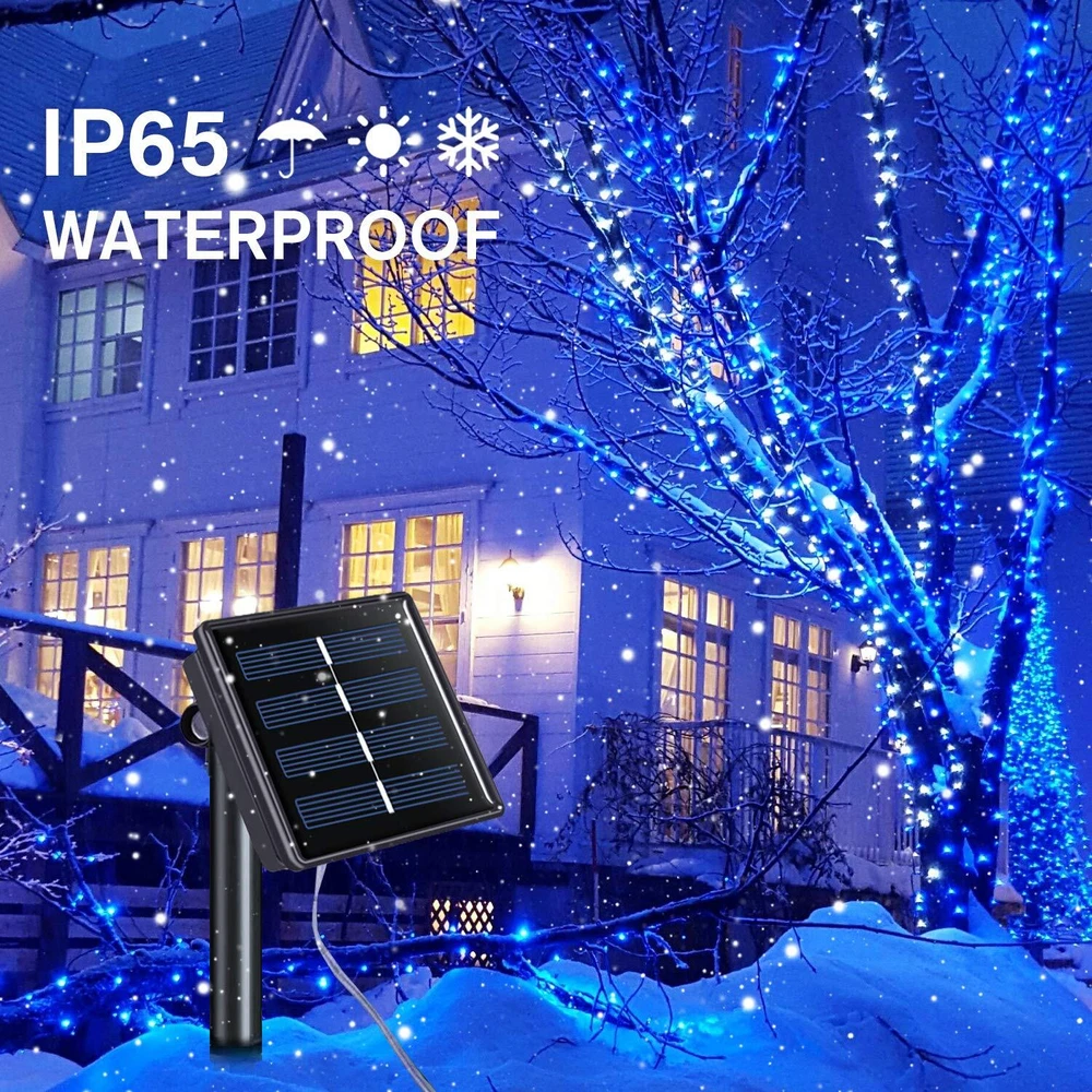 solar fairy lights 8 Impressive Lighting Modes Solar Christmas Lights: There are 8 different settings on the back of the solar panel to creates a dreamy feeling and your garden looks like a enchant fairy land at night. Blue solar christmas lights are an amazing addition to your yard, create a pleasant mood for events, parties or weddings! New Update Solar Powered Fairy Lights: Equipped with upgraded solar panel and built-in rechargeable battery, blue solar fairy lights are with up to 20.5% of energy conversion rate, which keeps christmas string lights for 10 to 12 hours after 6 hours direct sunlight charge. Outdoor solar fairy lights automatically turn on at dusk and off at dawn. Brilliant Outdoor Christmas Decor: 100 LED starry-style solar string lights with blue light accent your space with a unique, inviting glow. 33ft length is perfect to put around a garden or porch railing.Blue solar string lights the finishing touch for a back yard bbq, party, wreath, fence, patio, pools, bush, Christmas, indoor, outdoor. In the dark, the wire fades to invisible, leaving only the fairy lights, create a classy and romantic atmosphere. Flexibility & Waterproof Blue Solar Lights: You can shape flexible silver wire into a heart, wrap around tree trunks or gazebos, making twinkling bonsai/plants arrangement, added a touch of whimsy to garden. Be your designer and light up your home decoration. Both the silver wire and the solar panel of the solar copper lights are IP44 Waterproof, they are still shining bright in heavy rain and snow. What You Get: 4*100 LED blue solar fairy lights, 4*stake, 4*stand, quick and friendly customer service.Give your surrounding a whole new look with our solar lights,a hedge with several sparkling blue twinkle lights will surely attract all the eyes of passers-by,and your garden will stand out.