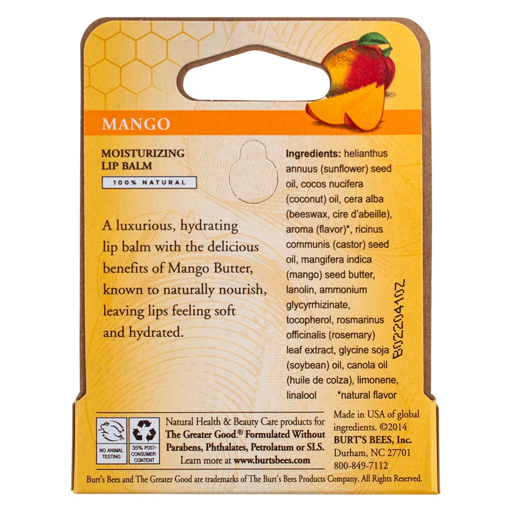 Product Description A paradise for your lips. Burt's Bees Mango Lip Balm is made with Mango Butter, a naturally nourishing balm that smoothes dry lips. Hydrate you lips with this tropical twist on moisture. - Nourishes with Mango Butter - Sweet tropical flavor - 100% natural - Nourishes with Beeswax and Coconut Oil - No Parabens, Phthalates, Petrolatum or SLS Ingredients helianthus annuus (sunflower) seed oil, cocos nucifera (coconut) oil, cera alba (beeswax, cire d'abeille), aroma (flavor)*, ricinus communis (castor) seed oil, mangifera indica (mango) seed butterllanolin, ammonium glycyrrhizinate, tocopherol, rosmarinus officinalis (rosemary) leaf extract, glycine soja (soybean) oil, canola oil (huile de colza), limonene, linalool. *natural flavor. Product Description A paradise for your lips. Burt's Bees Mango Lip Balm is made with Mango Butter, a naturally nourishing balm that smoothes dry lips. Hydrate you lips with this tropical twist on moisture. - Nourishes with Mango Butter - Sweet tropical flavor - 100% natural - Nourishes with Beeswax and Coconut Oil - No Parabens, Phthalates, Petrolatum or SLS Ingredients helianthus annuus (sunflower) seed oil, cocos nucifera (coconut) oil, cera alba (beeswax, cire d'abeille), aroma (flavor)*, ricinus communis (castor) seed oil, mangifera indica (mango) seed butterllanolin, ammonium glycyrrhizinate, tocopherol, rosmarinus officinalis (rosemary) leaf extract, glycine soja (soybean) oil, canola oil (huile de colza), limonene, linalool. *natural flavor. Suggested Use Apply balm liberally to lips as often as needed. Disclaimer The product descriptions and instructions provided by vitabox.com are for informational purposes only and are qualified in their entirety by the information available from manufacturers of the products. You should carefully read all product packaging, and contact the manufacturer with any questions before using a product. While we endeavor to ensure that product descriptions are current, manufacturers sometimes change their products. We are not liable for inaccuracies or misstatements about products. We do not provide medical advice or recommendations. You should not use the information provided by vitabox.com for diagnosing or treating a health problem or disease. If you have or suspect that you have a medical problem, immediately contact your health care provider. Information and statements regarding dietary supplements have not been evaluated by the Food and Drug Administration or any other government agency and are not intended to diagnose, treat, cure, or prevent any disease.