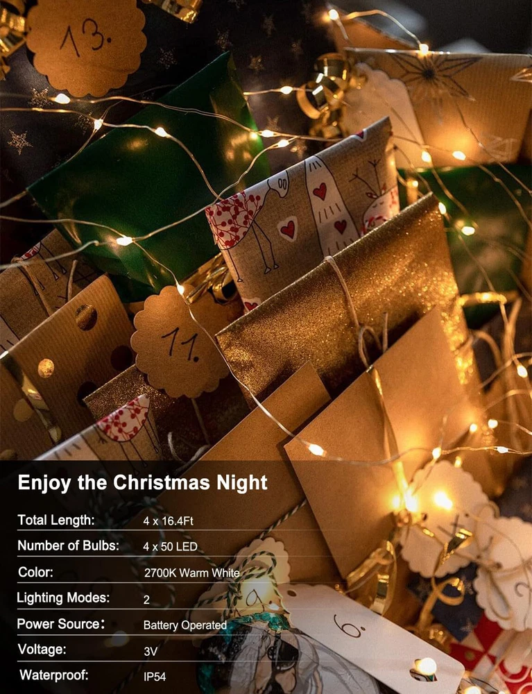 Value Pack: This pack includes 4 sets of 16.4ft fairy string lights, giving you plenty of length to decorate larger spaces or multiple areas. Plus, the value pack means you can save money while still getting high-quality, beautiful fairy lights. Long-Lasting LED Lights: The 50 LED lights are designed to last longer than traditional bulbs, so you can enjoy your twinkling lights for longer without having to replace them. Lead wire: 0.5m/1.64ft, enough to hide the battery compartment. Convenient Battery Operation: No need to worry about finding a nearby outlet or tripping over cords. These twinkle lights are 3xAA battery-operated (Not included), allowing you to place them anywhere without the hassle of cords or wires. Durable and Flexible Wire: The silver copper wire is both durable and flexible, making it easy to bend and shape to fit your decorating needs. Plus, it's thin enough to be discreet and blend in seamlessly with your decor. Versatile Decoration: Add a pop of color and sparkle to any space with these warm white/cool white/multicolor fairy lights. Perfect for indoor and outdoor use, they're great for decorating bedrooms, dorms, weddings, parties, and yard