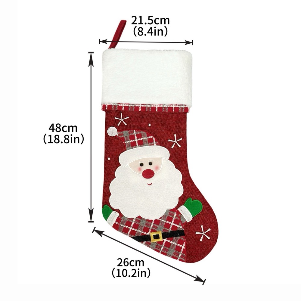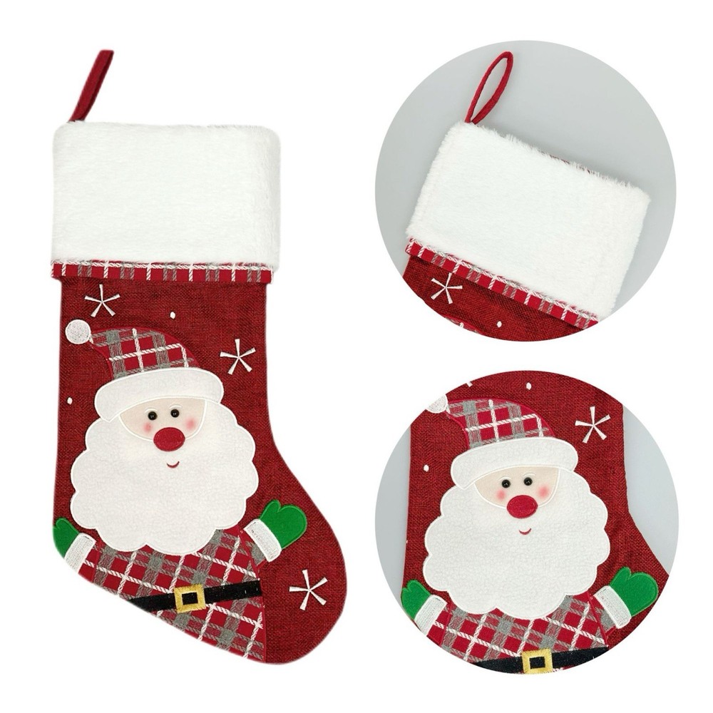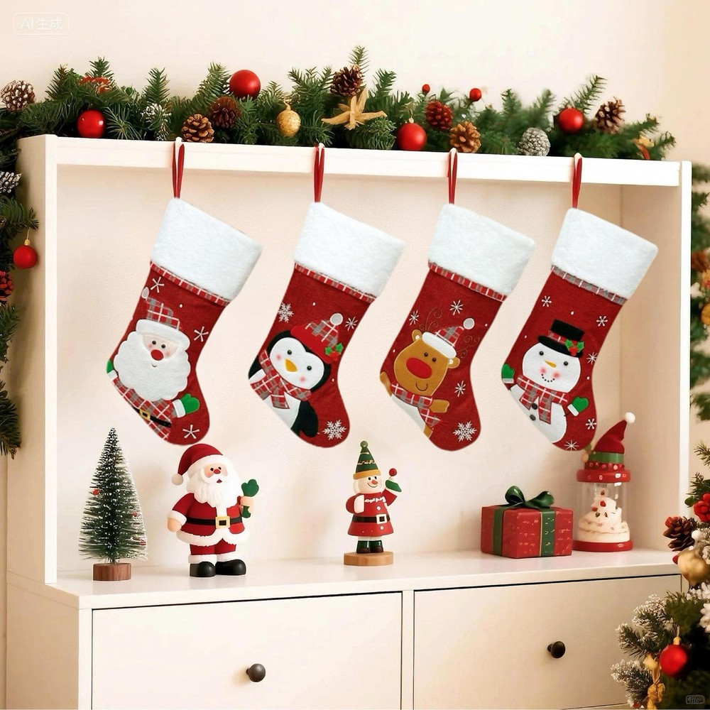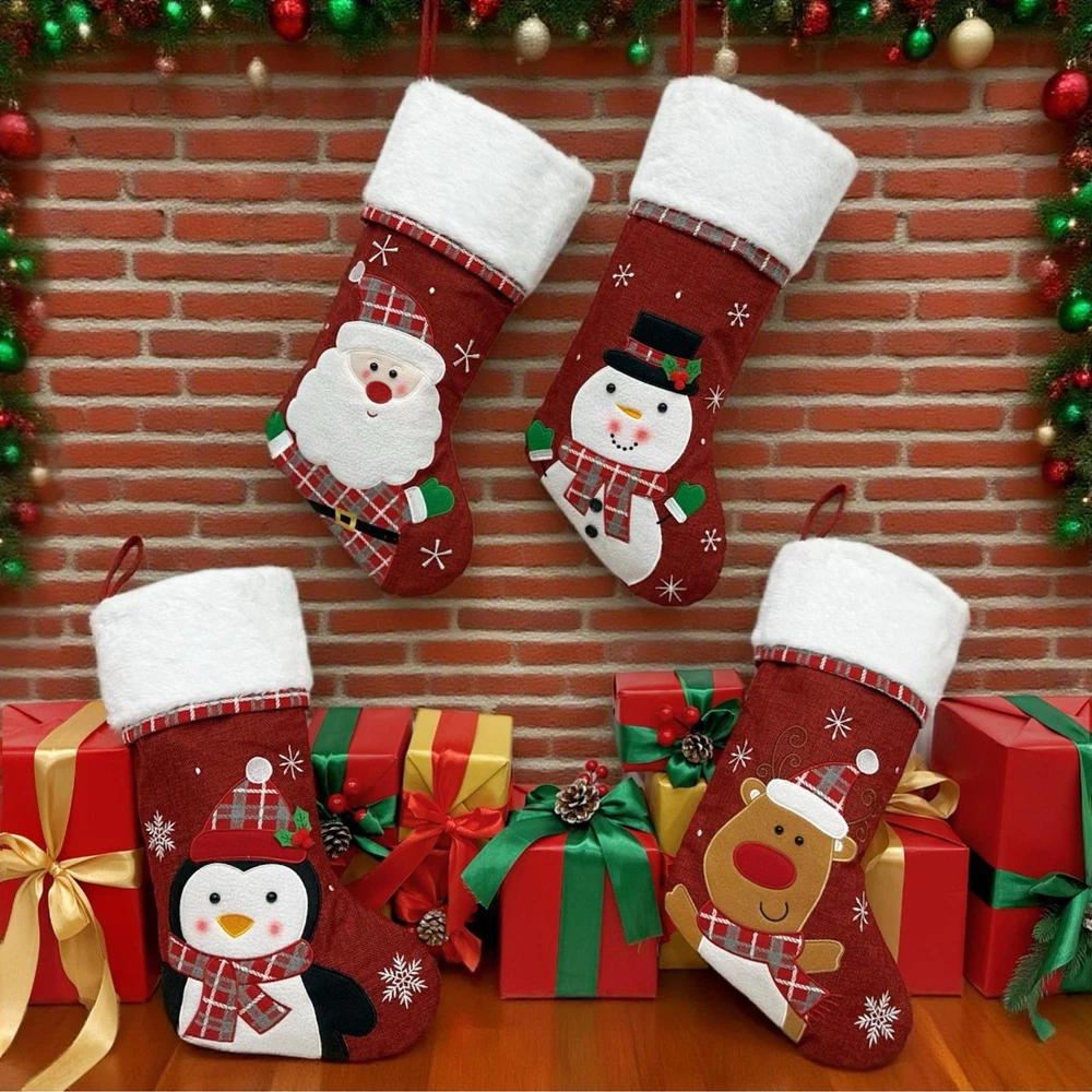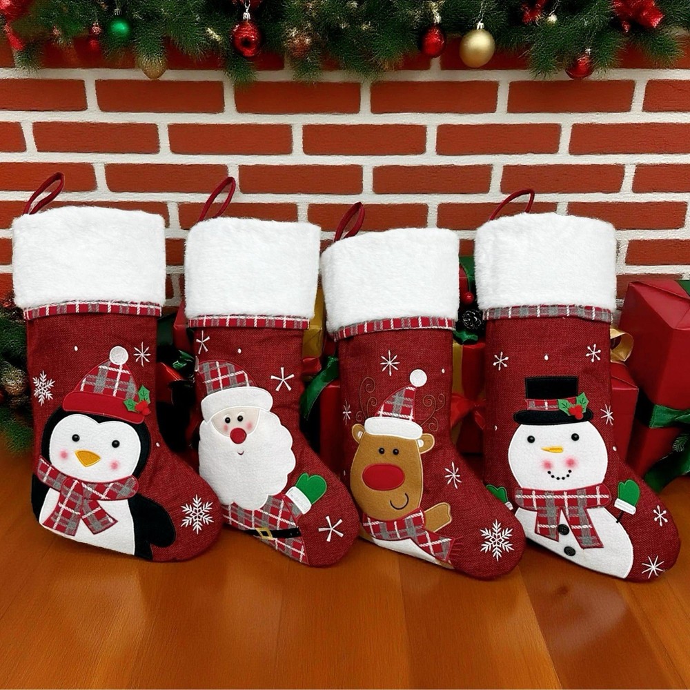 This 4-pack set of embroidered Christmas stockings is perfect for decorating your home and preparing holiday gifts. Each stocking features a unique festive character β Santa Claus, Penguin, Reindeer, and Snowman. Made with soft felt, detailed embroidery, and bright Christmas colors, they add a warm holiday atmosphere to any room. Ideal for fireplaces, walls, doors, classrooms, offices, Christmas trees, and gift giving.