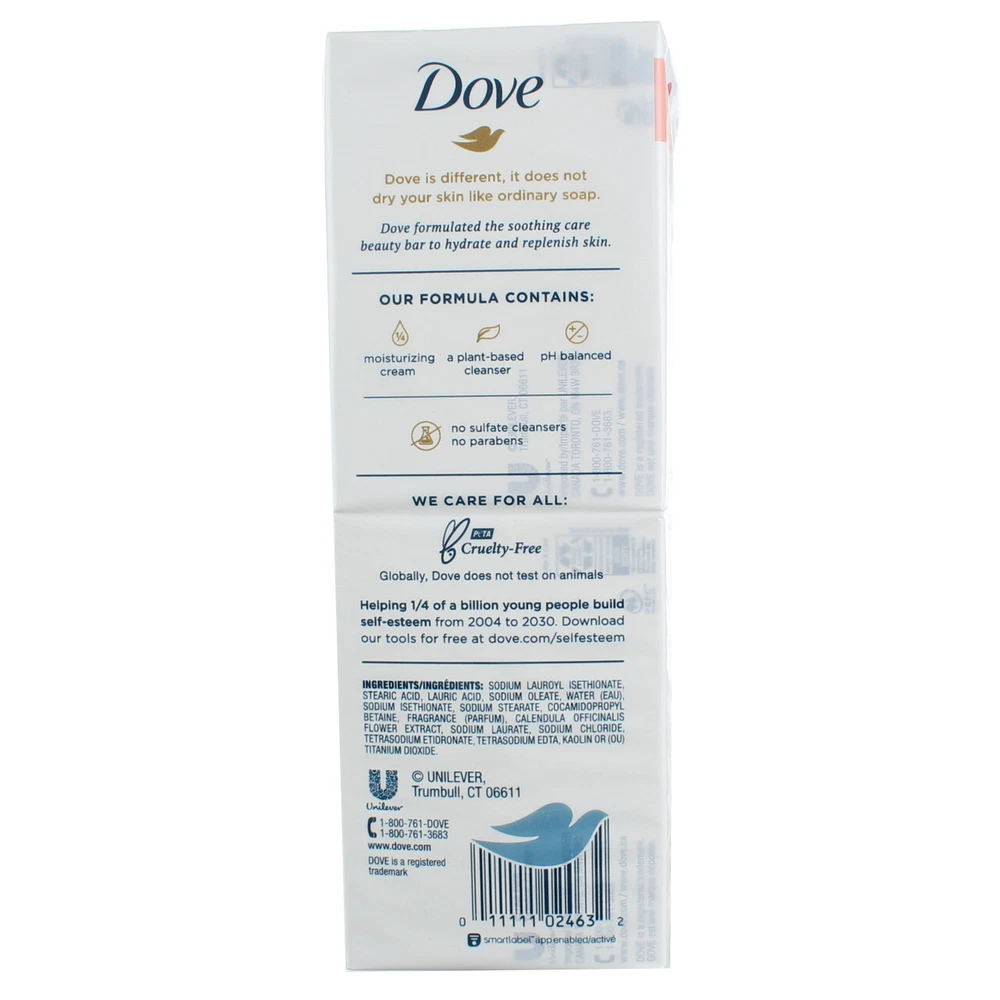 Product Description Dove is proven on sensitive skin. This cleanser provides the cleansing efficacy and care you need and is gentle on your body, face, and hands. It won't dry out your skin like ordinary soap. In fact, regular bar soap can cause the skin to feel dry and tight. But Dove is different! It’s the combination of 100% gentle cleansers and moisturizing ingredients that help to nourish and care for your whole body. You can feel confident that this beauty bar soap for sensitive skin won't dry skin or clog pores and is suitable for the whole family. That’s because Dove isn’t a soap; it’s a Beauty Bar. Start your day with Dove-soft skin. At Dove, our vision is of a world where beauty is a source of confidence and not anxiety. Dove Soothing Care Moisturizing Beauty Bar 3.75 oz 6 Bars - GENTLE ON SENSITIVE SKIN: Effectively hydrate and replenish your skin and wash away bacteria with Dove Soothing Care beauty bar. With its hypoallergenic formula, it gently cleanses for softer skin - HYPOALLERGENIC FORMULA: Dove Soothing Care Beauty Bar soap for sensitive skin is made with calendula oil, and has no sulfate cleansers or parabens - #1 DERMATOLOGIST RECOMMENDED: Formulated with 100% gentle cleansers and ¼ moisturizing cream, Dove Soothing Care Beauty Bar is proven to nourish and care for sensitive skin - MILD AND MOISTURIZING: Help maintain your skin’s natural moisture barrier and hydration with this skincare beauty bar, which is gentle enough for your face, moisturizing enough for the whole body - GENTLE CLEANSING: Lather in the luxurious feel of this beauty bar that won’t dry skin like ordinary bath soap or bar soap can. The cleansing efficacy and care you need, all in one product Ingredients Ingredients Sodium Lauroyl Isethionate, Stearic Acid, Lauric Acid, Sodium Oleate, Water (Eau), Sodium Isethionate, Sodium Stearate, Cocamidopropyl Betaine, Fragrance (Parfum), Calendula Officinalis Flower Extract, Sodium Laurate, Sodium Chloride, Tetrasodium Etidronate, Tetrasodium EDTA, Kaolin or (ou) Titanium Dioxide Product Description Dove is proven on sensitive skin. This cleanser provides the cleansing efficacy and care you need and is gentle on your body, face, and hands. It won't dry out your skin like ordinary soap. In fact, regular bar soap can cause the skin to feel dry and tight. But Dove is different! It‚Äôs the combination of 100% gentle cleansers and moisturizing ingredients that help to nourish and care for your whole body. You can feel confident that this beauty bar soap for sensitive skin won't dry skin or clog pores and is suitable for the whole family. That‚Äôs because Dove isn‚Äôt a soap; it‚Äôs a Beauty Bar. Start your day with Dove-soft skin. At Dove, our vision is of a world where beauty is a source of confidence and not anxiety. Dove Soothing Care Moisturizing Beauty Bar 3.75 oz 6 Bars - GENTLE ON SENSITIVE SKIN: Effectively hydrate and replenish your skin and wash away bacteria with Dove Soothing Care beauty bar. With its hypoallergenic formula, it gently cleanses for softer skin - HYPOALLERGENIC FORMULA: Dove Soothing Care Beauty Bar soap for sensitive skin is made with calendula oil, and has no sulfate cleansers or parabens - #1 DERMATOLOGIST RECOMMENDED: Formulated with 100% gentle cleansers and ¬º moisturizing cream, Dove Soothing Care Beauty Bar is proven to nourish and care for sensitive skin - MILD AND MOISTURIZING: Help maintain your skin‚Äôs natural moisture barrier and hydration with this skincare beauty bar, which is gentle enough for your face, moisturizing enough for the whole body - GENTLE CLEANSING: Lather in the luxurious feel of this beauty bar that won‚Äôt dry skin like ordinary bath soap or bar soap can. The cleansing efficacy and care you need, all in one product Ingredients Ingredients Sodium Lauroyl Isethionate, Stearic Acid, Lauric Acid, Sodium Oleate, Water (Eau), Sodium Isethionate, Sodium Stearate, Cocamidopropyl Betaine, Fragrance (Parfum), Calendula Officinalis Flower Extract, Sodium Laurate, Sodium Chloride, Tetrasodium Etidronate, Tetrasodium EDTA, Kaolin or (ou) Titanium Dioxide Suggested Use Read complete instructions before use Disclaimer The product descriptions and instructions provided by vitabox.com are for informational purposes only and are qualified in their entirety by the information available from manufacturers of the products. You should carefully read all product packaging, and contact the manufacturer with any questions before using a product. While we endeavor to ensure that product descriptions are current, manufacturers sometimes change their products. We are not liable for inaccuracies or misstatements about products. We do not provide medical advice or recommendations. You should not use the information provided by vitabox.com for diagnosing or treating a health problem or disease. If you have or suspect that you have a medical problem, immediately contact your health care provider. Information and statements regarding dietary supplements have not been evaluated by the Food and Drug Administration or any other government agency and are not intended to diagnose, treat, cure, or prevent any disease.