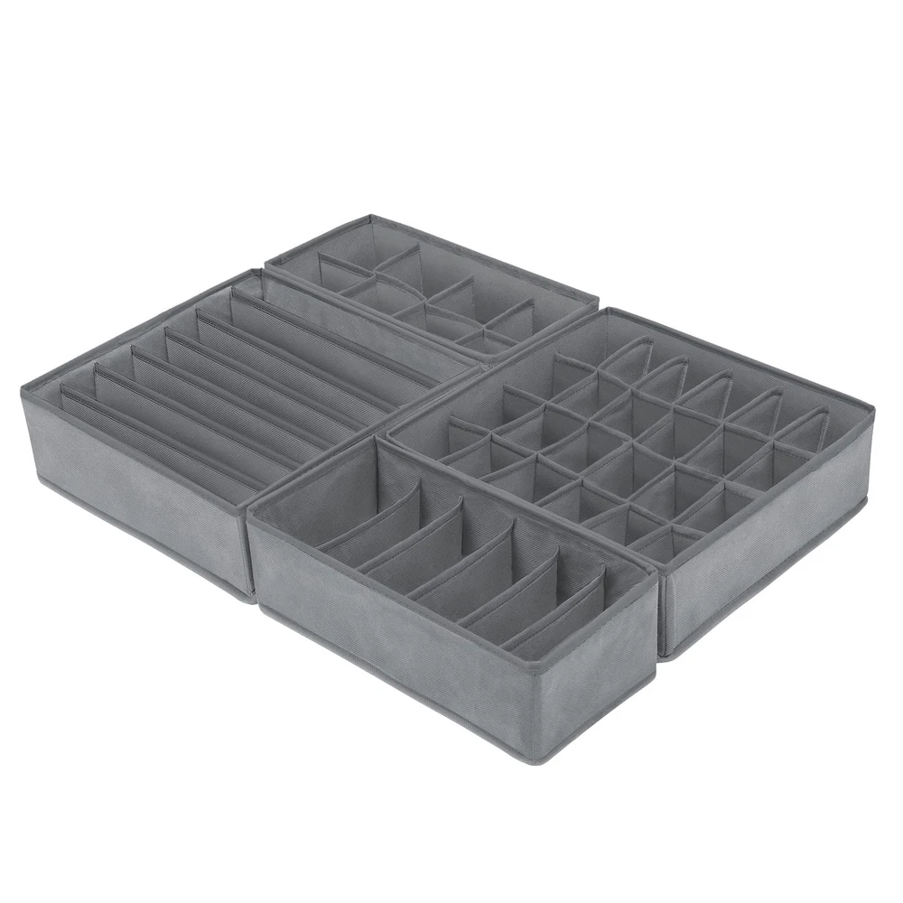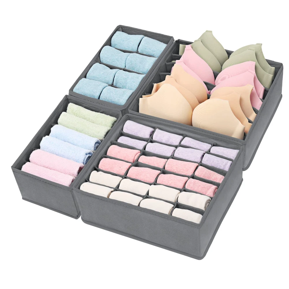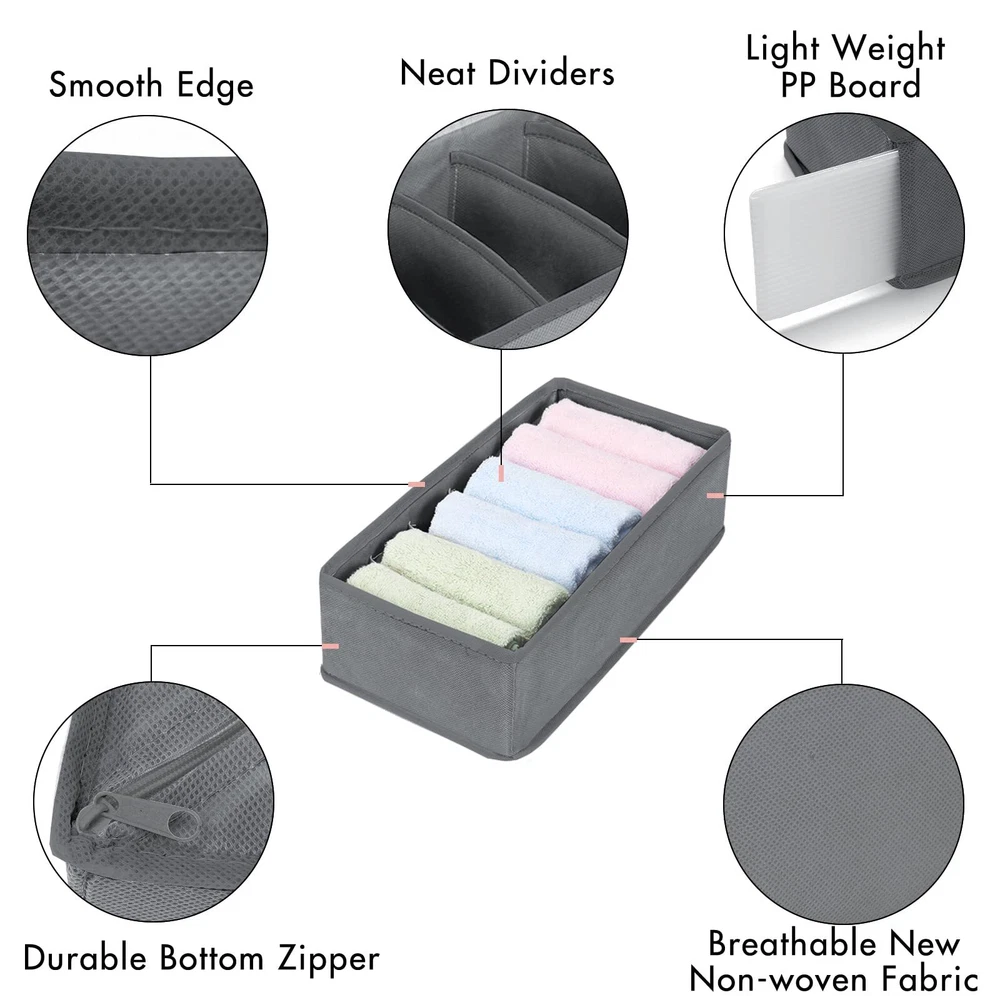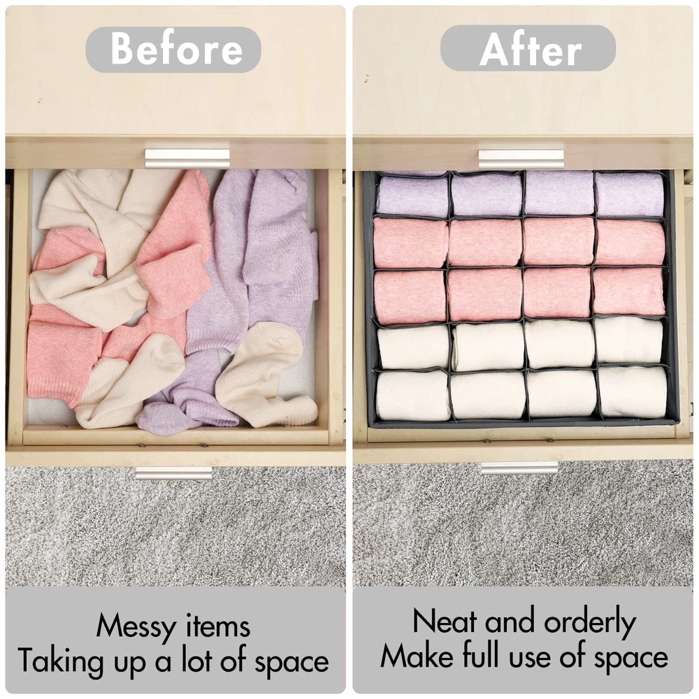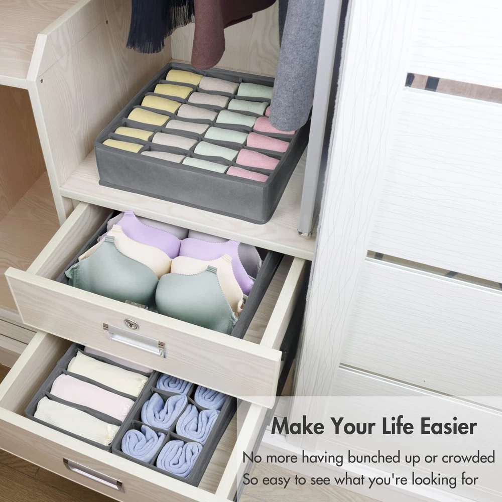 Are you tired of searching underwear, bras, lingerie, panties, briefs, socks, ties, scarves,belts ,shirt, T-shirt etc when you want to wear ? Are your messy clothes occupied a huge chunk of the space ,and let's you feeling headache? Did you know getting rid of these clothes would eliminate 20% of the housework in the average home? If yes, then our Clothes Drawer Organizer can provide a simple and cost-effcient way to take your clothes storage from mess to neat, and help you develop a good habit of organizing things, making your house tidy and clean. Organize your storage, Organize your life. Specificatons: Material: Set of 4 Underwear and Bras Drawer Organizers is Made of non-woven fabric, which is durable and breathable, lining panels are made from cardboard. Dimension: 6 cell bins : 12.99"*6.30"*3.93" 7&24 cell bins: 12.59"*12.59"*3.93" 8 cell bins: 11.42"*6.30"*3.93" Humanized Design: Our bedroom drawer organizer with Various Storage Space: 6 cell ( lingerie,scarves, belts), 8 cell (underwear, briefs, ties), 7 cell (bras,camisoles, tights), 24 cell (socks, pantyhose,silk stockings). , the way are built can accommodate a variety of items in a neat fashion Easy to Assemble & Storage: All you do is take the underwear drawer organizer out of the box, unfold the sock underwear organizer, and do the zipper on the bottom,then insert a cardboard piece into the bottom.Easy to and space-saving when not in use . Muti Purpose : Foldable closet underwear organizer Can be used for a variety of underwear, bras, lingerie, panties, briefs, socks, ties, scarves,belts ,shirt, T-shirt, undergarments, and personal items. Package : Set of 4 bra organizers and storage in OPP bag Note: Do not storing wet clothes Do not force loaded too much or too heavy items 【Make Your Life Easier 】 Good for organizing your underwear, bras, lingerie, panties, briefs, socks, ties, scarves,belts etc. Easy to find which you want to wear and never need to ransack all of your clothes, reduce 30% of time for dressing . 【Durable and Premium Quality】Our underwear drawer organizer is made of NEW long-lasting non-woven fabric, which is durable and breathable, No smells, will not be easy to tear. It can be easily cleaned with a damp cloth for years of use. Safe to baby's clothes . 【Various Storage Space 】6 cell ( lingerie,scarves, belts), 8 cell (underwear, briefs, ties), 7 cell (bras,camisoles, tights), 24 cell (socks, pantyhose,silk stockings). 【Easy to Assemble and Collapsible】All you do is take them out of the box, unfold them, and do the zipper on the bottom. Provides a attractive, lightweight solution and easy carrying to many personal storage needs. Magically folds up into a compact size when not in use, easy to . 【Customer satisfaction】We promise a 90-Day product exchange and 30-day money back! If you are not 100% satisfied, us directly (EVEN IF after the return window) and we will provide you with a no-questions-asked or .