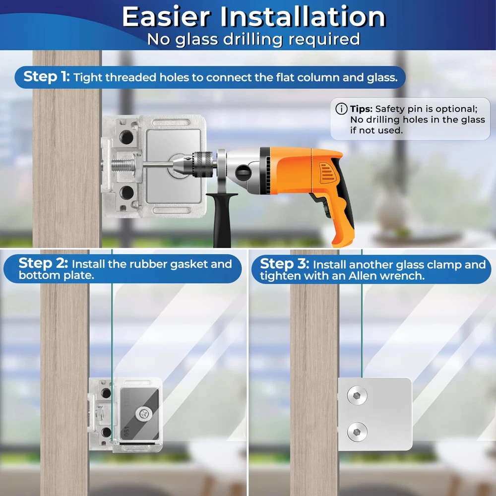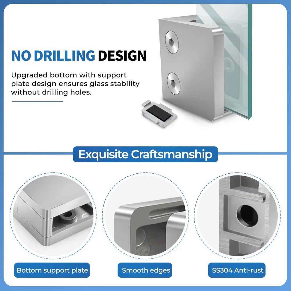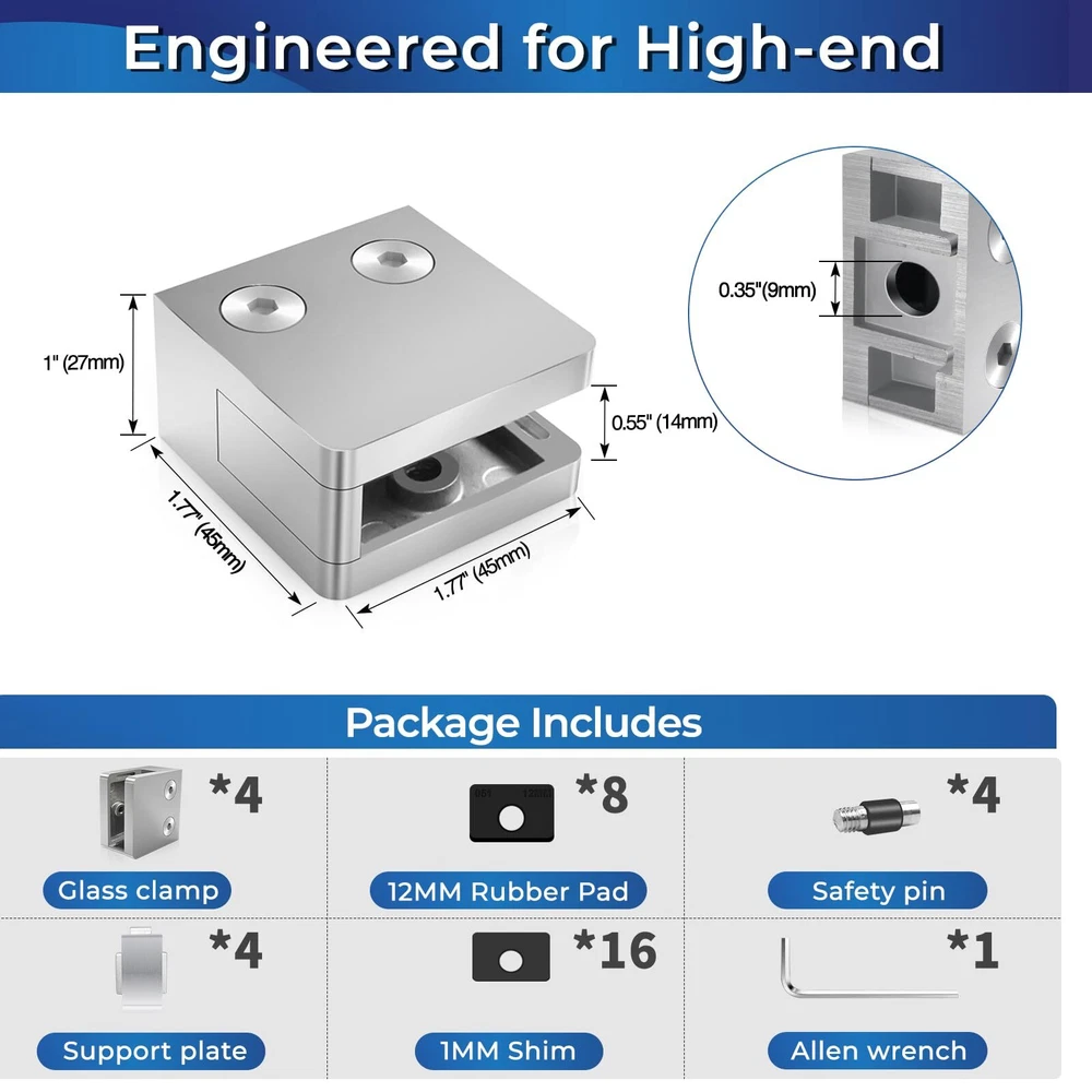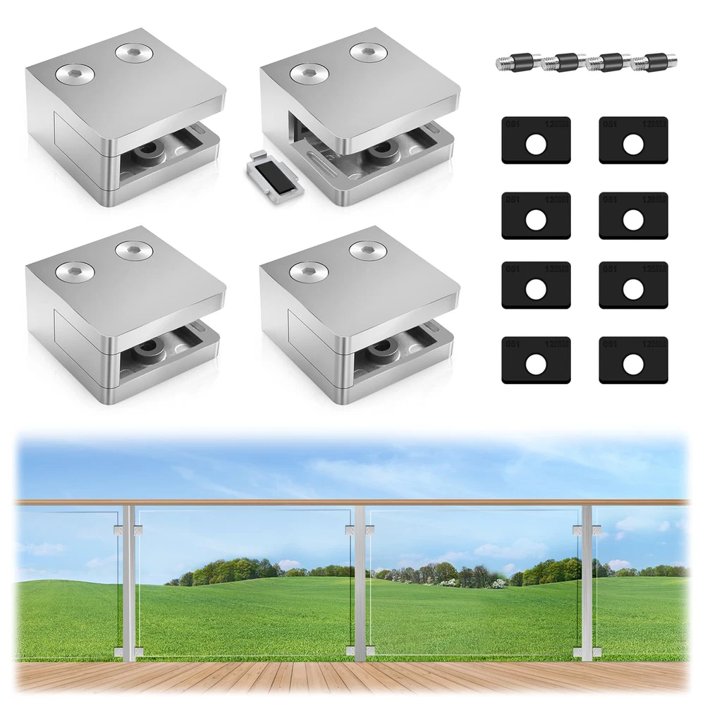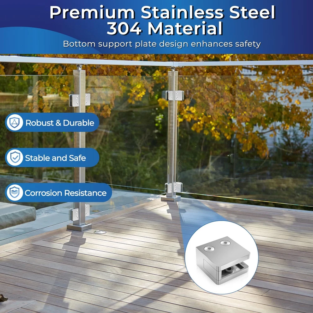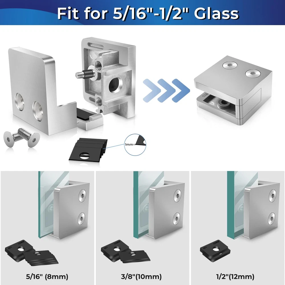 4 Pack Glass Clamp with Removable Bottom Support Plate, Heavy Duty 45x45mm Square Glass Railing Clamp with Rubber Gaskets for Glass Thickness 8mm-12mm, Stainless Steel 304 Flat Glass Clamp 4 Pack Glass Clamp with Removable Bottom Support Plate, Heavy Duty 45x45mm Square Glass Railing Clamp with Rubber Gaskets for Glass Thickness 8mm-12mm, Stainless Steel 304 Flat Glass Clamp Description Premium Brushed Stainless Steel Glass Clamp - Glass Brackets for Securing Bottom Panels of Glass, Sturdy and Rust-Resistant Product Features: -Size: 45mm x 45mm x 27mm (1.77" x 1.77" x 1") - Bottom with support plate design, no need to drill holes - Premium Stainless Steel: Crafted from robust stainless steel 304 material, ensuring long-lasting use - Secure Grip: These glass clips provide a firm hold on glass panels, ensuring maximum stability - Rust-Resistant Finish: The brushed finish looks sleek and resists rust and corrosion - Versatile Application: Ideal for both indoor and outdoor use, perfect for securing glass panels in any setting - Easy Installation: Includes all necessary hardware for quick and easy installation, saving time and effort Product List: 4 x Glass Clamp 4 x Bottom Support Plates 8 x 12MM Rubber Gaskets 16 x 1MM Rubber Gaskets 4 x Safety Pin 1 x Allen Wrench Key Features No Drill in Glass: This glass clamp features a reinforced base plate, offering stronger support for glass panels. The included safety pin provides flexibility, allowing you to choose whether to install it based on your needs. The stainless steel clamp securely holds the glass without drilling, making it versatile for various applications. Perfect Fit for Glass Thickness: Measuring 45mm x 45mm, this brushed glass clamp comes with 12mm and 1mm rubber gaskets, ideal for 8mm to 12mm thick glass. It ensures a secure and compatible fit with different glass sizes, providing a reliable hold for residential and commercial projects. High Load Capacity & Simple Installation: This glass clamp features strong load-bearing capacity and is designed for easy installation. There are two installation options: with a bottom support plate for mounting underneath the glass or without the plate for side installation. This allows you to securely install the glass without drilling, making the process smooth and effortless. Premium Material: Our railing glass clamp is crafted from robust 304 stainless steel. Its corrosion-resistant properties ensure long-lasting performance indoors and outdoors. The rubber gasket offers excellent heat, water, and abrasion resistance, making it reusable and reliable. Sleek & Stylish Brushed Finish: The flat glass clamp has an elegant brushed finish that complements various design styles in railings and handrails. Its sleek, modern design enhances visual appeal, seamlessly blending with contemporary architectural settings for a sophisticated look. Return Information ⦿ Items can be returned within 30 days. Please contact us through eBay messaging for return instructions. ⦿ We ensure 100% satisfaction. If you're not satisfied, we will resolve any issues promptly. ⦿ Free shipping and returns with a 30-day money-back guarantee. ⦿ Please contact us for the return shipping address. Shipping Details ⦿ We ship to the address listed on eBay. Please ensure it is correct. ⦿ Standard delivery time is 3-5 business days. ⦿ We use reputable shipping services like UPS, FedEx, and USPS. ⦿ Currently, we ship only within the 48 contiguous states of the USA. ⦿ For any shipping concerns, feel free to contact us. Customer Support ⦿ For any inquiries, please contact us via eBay messaging. We usually respond within 24 hours. ⦿ We prioritize customer satisfaction above all else. ⦿ Reach out to us with any issues before leaving feedback, and we will do our best to resolve them. About Us We are committed to offering high-quality products at competitive prices, ensuring that our customers receive the best value. Our team strives to provide exceptional customer service and a seamless shopping experience. With years of experience, we have built strong relationships with suppliers, enabling us to offer a wide range of products. We constantly seek to improve our product selection and services to exceed customer expectations. Our mission is to ensure 100% customer satisfaction. We address all concerns promptly and effectively. Thank you for choosing our store, and we look forward to serving you again.