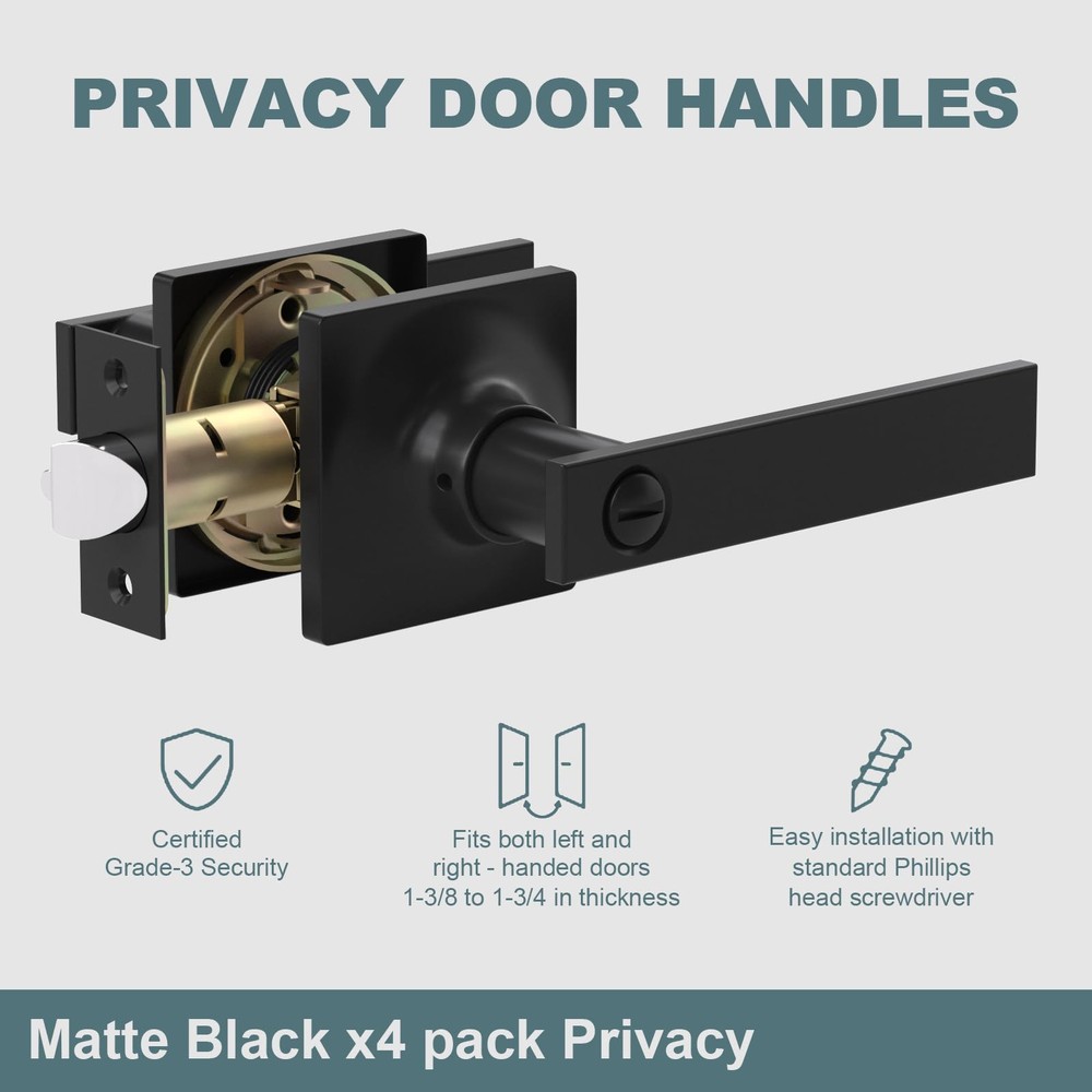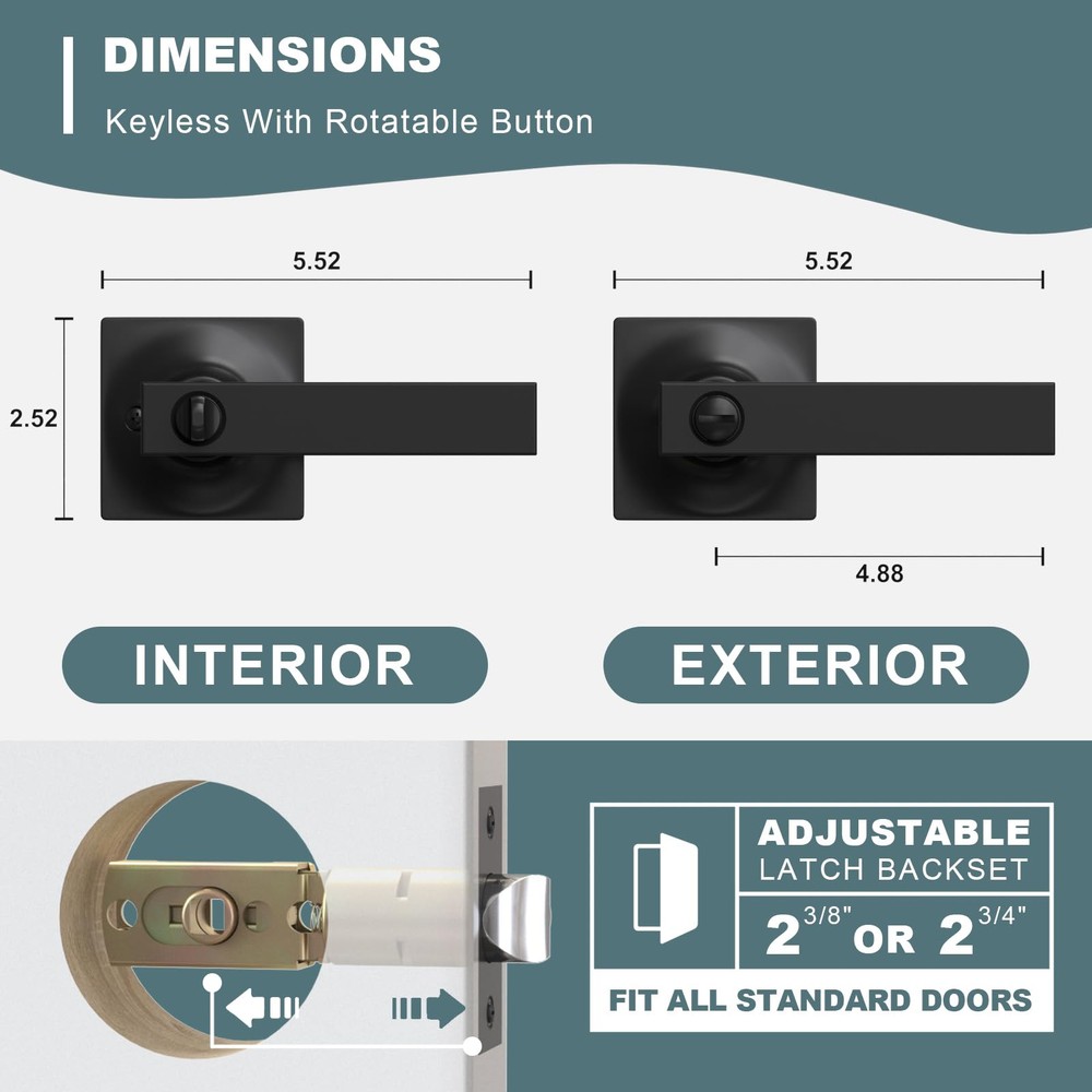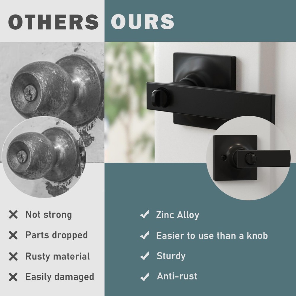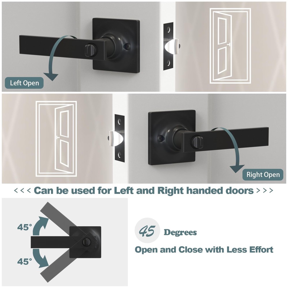 PRIVACY FUNCTION DOOR HANDLES INTERIOR: Equipped with a keyless button lock, these door locks for bedrooms protect the privacy of spaces like bedrooms and bathrooms. In emergencies, they can be opened from the outside using a flat tool, ensuring safety EASY-TO-INSTALL DOOR HANDLE SET: Includes clear instructions and an installation video for quick setup. Features an adjustable latch for backsets of 2-3/8 in (60 mm) or 2-3/4 in (70 mm) and fits door thicknesses from 1-3/8 in (35 mm) to 1-3/4 in (45 mm) VERSATILE APPLICATION DOOR KNOB WITH LOCK: Ideal for left-handed or right-handed doors in bedrooms, bathrooms, living rooms, or offices. The modern design complements various interior styles, meeting both functional and aesthetic needs DURABLE AND STURDY CONSTRUCTION: Crafted from premium zinc alloy with a heavy-duty design, these privacy door handle offer Grade 3 certification for long-lasting durability and reliable performance AFTER-SALES SUPPORT: Backed by a 24-month warranty, our customer service team is ready to assist with any issues related to installation or the product itself, ensuring a worry-free purchase experience