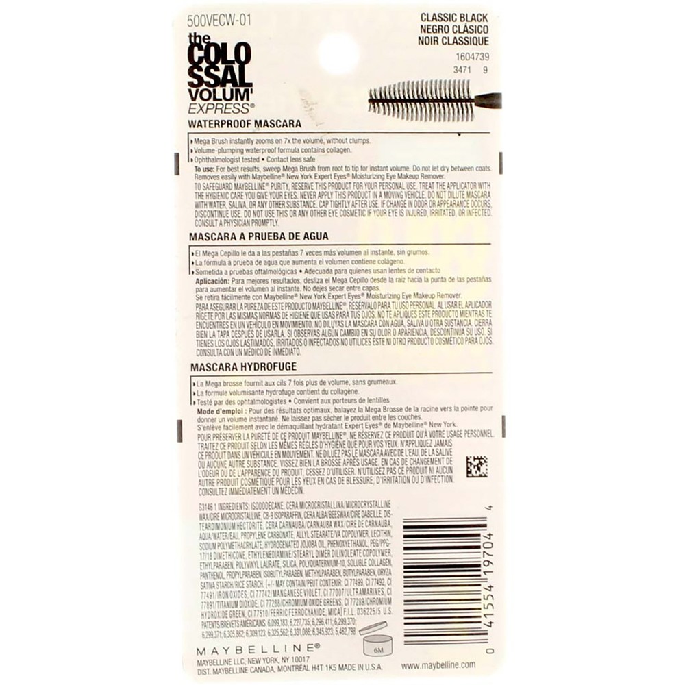 Product Description Colossal lashes in just one go! Give your eyelashes the volume they deserve with Maybelline New York’s Volum' Express The Colossal Waterproof Mascara. With collagen infused in the volume-plumping formula, the Mega Brush instantly achieves 9 times the volume in just one coat, all without any clumps. The mascara’s lightweight formula will help your eyelashes reach the dramatic volume you desire. The waterproof formula has been ophthalmologist tested and is safe for contact lens wearers. Available in 2 highly pigmented shades: Glam Black & Classic Black. Volume-plumping formula infused with collagen guarantees a no-clump volumized look and was ophtalmologist tested Volum' Express The Colossal Volumizing Mascara features the Mega Brush to instantly achieve 9 times the volume Washable lengthening and volumizing mascara is designed to give you the dramatic eye makeup look you dream of Volum' Express The Colossal Washable Mascara is available in 2 super-saturated shades- Glam Black and Classic Black Volum' Express The Colossal Washable Mascara is absolutely suitable for all contact lens wearers to use Ingredients G3133 1 Ingredients: Aqua / Water / Eau Paraffin Potassium Cetyl Phosphate Cera Alba / Beeswax / Cire Dabeille Copernicia Cerifera Cera / Carnauba Wax / Cire De Carnauba Acacia Senegal / Acacia Senegal Gum Glycerin Cetyl Alcohol Hydroxyethylcellulose Phenoxyethanol Peg/Ppg-17/18 Dimethicone Steareth-20 Phenyl Ethyl Alcohol Silica Sodium Polymethacrylate Hydrogenated Jojoba Oil Hydrogenated Palm Oil Simethicone Disodium Edta Polyquaternium-10 Panthenol Soluble Collagen [+/- May Contain / Peut Contenir Ci 77491, Ci 77492, Ci 77499 / Iron Oxides Ci 77007 / Ultramarines Ci 77742 / Manganese Violet Ci 75470 / Carmine Ci 77891 / Titanium Dioxide Mica Ci 77288 / Chromium Oxide Greens Ci 77510 / Ferric Ferrocyanide ] F.I.L. D165827/1. Instructions Sweep the Mega Brush from the root to tip of lashes to create instant volume Do not let lengthening mascara dry in between coats Easily remove lengthening mascara with Maybelline Expert Eyes 100% Oil-Free Eye Makeup Remover Product Description Colossal lashes in just one go! Give your eyelashes the volume they deserve with Maybelline New York‚Äôs Volum' Express The Colossal Waterproof Mascara. With collagen infused in the volume-plumping formula, the Mega Brush instantly achieves 9 times the volume in just one coat, all without any clumps. The mascara‚Äôs lightweight formula will help your eyelashes reach the dramatic volume you desire. The waterproof formula has been ophthalmologist tested and is safe for contact lens wearers. Available in 2 highly pigmented shades: Glam Black & Classic Black. Volume-plumping formula infused with collagen guarantees a no-clump volumized look and was ophtalmologist tested Volum' Express The Colossal Volumizing Mascara features the Mega Brush to instantly achieve 9 times the volume Washable lengthening and volumizing mascara is designed to give you the dramatic eye makeup look you dream of Volum' Express The Colossal Washable Mascara is available in 2 super-saturated shades- Glam Black and Classic Black Volum' Express The Colossal Washable Mascara is absolutely suitable for all contact lens wearers to use Ingredients G3133 1 Ingredients: Aqua / Water / Eau Paraffin Potassium Cetyl Phosphate Cera Alba / Beeswax / Cire Dabeille Copernicia Cerifera Cera / Carnauba Wax / Cire De Carnauba Acacia Senegal / Acacia Senegal Gum Glycerin Cetyl Alcohol Hydroxyethylcellulose Phenoxyethanol Peg/Ppg-17/18 Dimethicone Steareth-20 Phenyl Ethyl Alcohol Silica Sodium Polymethacrylate Hydrogenated Jojoba Oil Hydrogenated Palm Oil Simethicone Disodium Edta Polyquaternium-10 Panthenol Soluble Collagen [+/- May Contain / Peut Contenir Ci 77491, Ci 77492, Ci 77499 / Iron Oxides Ci 77007 / Ultramarines Ci 77742 / Manganese Violet Ci 75470 / Carmine Ci 77891 / Titanium Dioxide Mica Ci 77288 / Chromium Oxide Greens Ci 77510 / Ferric Ferrocyanide ] F.I.L. D165827/1. Instructions Sweep the Mega Brush from the root to tip of lashes to create instant volume Do not let lengthening mascara dry in between coats Easily remove lengthening mascara with Maybelline Expert Eyes 100% Oil-Free Eye Makeup Remover Warnings Safety Warning: To safeguard purity, reserve this product for your personal use. Treat the applicator with the hygienic care you give your eyes. Never apply this product in a moving vehicle. Do not dilute with water, saliva, or any other substance. Cap tightly after use. If a change in odor or appearance occurs, discontinue use. Do not use this or any other cosmetic if your eye is injured, irritated, or infected. Consult a physician promptly. Disclaimer The product descriptions and instructions provided by vitabox.com are for informational purposes only and are qualified in their entirety by the information available from manufacturers of the products. You should carefully read all product packaging, and contact the manufacturer with any questions before using a product. While we endeavor to ensure that product descriptions are current, manufacturers sometimes change their products. We are not liable for inaccuracies or misstatements about products. We do not provide medical advice or recommendations. You should not use the information provided by vitabox.com for diagnosing or treating a health problem or disease. If you have or suspect that you have a medical problem, immediately contact your health care provider. Information and statements regarding dietary supplements have not been evaluated by the Food and Drug Administration or any other government agency and are not intended to diagnose, treat, cure, or prevent any disease.
