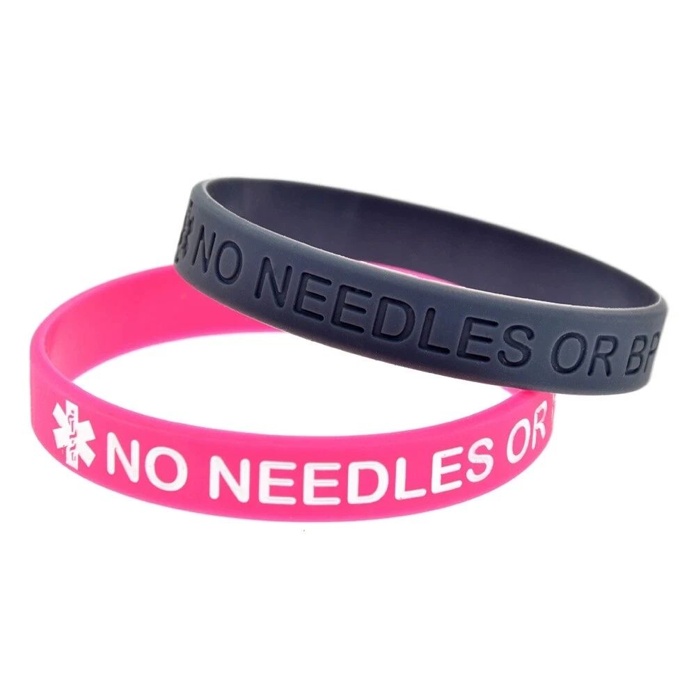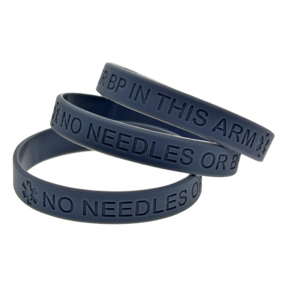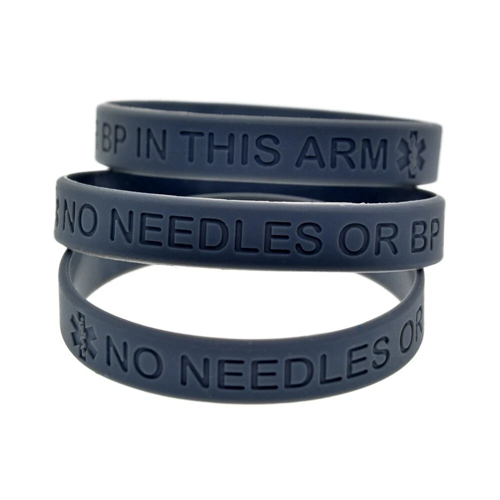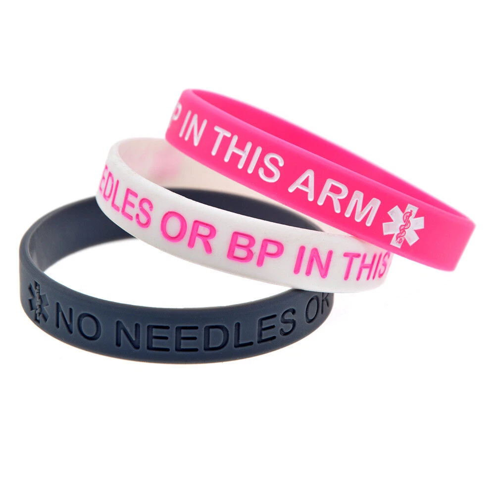 4 Pack Medical Alert No Needles or BP in This Arm Awareness Silicone Bracelets Choose your favourite color from the drop down menu Quantity advertised is for 4 bracelets Adult Approximate Size: 202mm*12mm(8"*0.5") Please order without any hesitation! You can even keep a spare one in your pocket or bag. Note: Due to the difference between different monitors, the picture may not reflect the actual color of the item. Your understanding will be highly appreciated. Package Included: 4 x Medical Alert Bracelets Make sure you're covered in an emergency Wear a medical wristband! Wear this band and protect yourself or buy it for a loved one Be safe in the knowledge that you or your loved one can get immediate and appropriate treatment should something happen. Make sure you wear your medical wristband at all times. You can keep it on even while you bathe as these are waterproof. If you are interested in more products, please kindly have a look at our eBay shop. Thank You for shopping with us and we hope to see you soon! Payment Delivery details Terms of sales About us Contact us Payment We accept PayPal , Payoneer, VISA, Bank Wire Transfer, etc. We only ship to confirmed eBay addresses . Your eBay address MUST MATCH your Shipping address. Delivery details 1. All items will be shipped within 24 - 48 hours after full payment is received. ( excludes weekends and holidays ) 2. United States Delivery time to below: - SpeedPAK Shipping -------------------------------- 7 - 12 business days 3. Global Delivery time to below: - China Shipping -------------------------------- 15 - 30 business days 4. If you have not received your shipment within Delivery Estimate , please feel free to contact us. We will track the shipment and get back to you as soon as possible with a reply. Our goal is customer satisfaction! Terms of sales About Import Tax: 1. Import duties, taxes and charges are not included in the item price or shipping charges. These charges are the buyer's responsibility. 2. Please check with your country's customs office to determine what these additional costs will be prior to bidding/buying. 3. Some countries' customs may charge taxes for importing good from another country such as Import Duty, Value Added Tax, a Purchase Tax, Customs clearance fees etc. 4. Buyers as importer are responsible for paying such costs. Buyers can not request to cancel the auction or request for refund or resend under this situation. About us Please contact us via eBay Message if you have NOT received item after 30 days , we will check it with post office, and then resend or refund any missing items. If you receive a wrong item or a dead-on-arrival (DOA) item, pls contact us asap for a resend or refund. Contact us If you have any question, pls don't hesitate to email us: Our working time is 9:00-18:00 [Beijing Time] ( Except Weekends ). During that period of time, we will reply to you as quickly as possible. We greatly appreciate your Positive Feedback . Pls do NOT leave negative feedback without asking for help. Our aim is to provide Top Level Customer Service, so we will try our best to solve any problems. Emails received on weekends would be responsed on Monday.