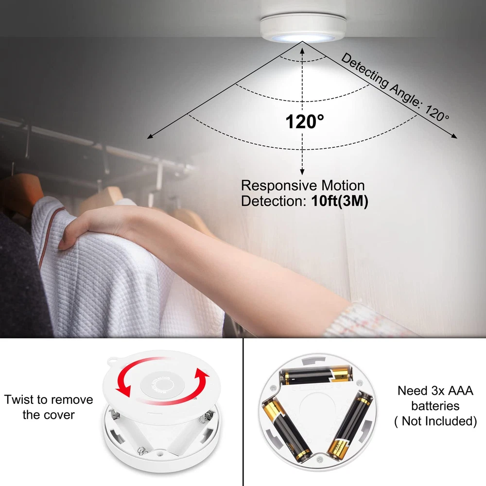 Higher Automatic Sensor: Use advanced PIR technology, our night light can auto-on within 10 feet, auto-off after 20 seconds of no motion detected helps prolong battery life. It will turn on only when it is dark and when motion is detected Battery Operated: Powered by 3PCS AAA batteries (Not Included) for cordless installation, to provide you with illumination in areas that have limited or no access to electricity. Note: Batteries that are qualified through the national testing authority are recommended Super Bright and Energy Efficient: Up to 35 lumens output, 6 pcs super bright SMD 2835 LEDs, bright enough to make sure you never stumble in the dark. Automatically powers off after 20 seconds of inactivity, saves lots of money for you directly Durable Design and Easy Installation: Besides of built-in magnet, also we add super-strong 3M double sides adhesive tape specially, so no need to worry about the cabinet light falling at all, you could choose to stick it anywhere, or you could use screws to fix it (screws are included), enjoy the best way you like Please note this motion sensor light can only be turned on in darkness environment. It won't turn on if enough light has been detected by the light sensor. Please Do Not install this light in high temperature place or somewhere with dust, otherwise, the adhesive strip will be affected, and then the light will slide easily!
