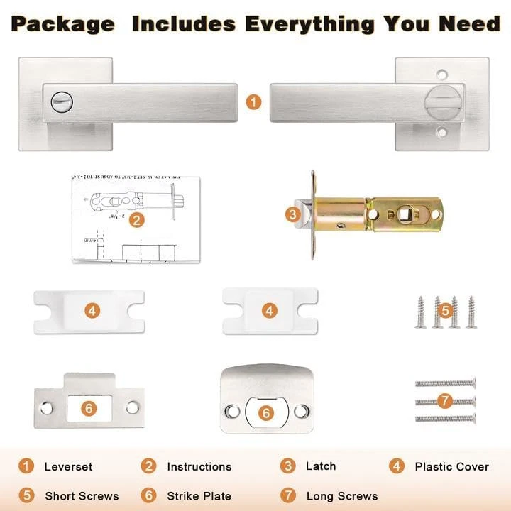 【Improve Your Home】: These square door lock meant to create an elegant effect to give your home the perfect finishing touch. Upgrade handle with provides a comfortable grip but a decorations to be used to enhance the beauty of your home. In contrast to other metal door handles, these handles provide a comfortable touch, which more suitable for colder or wetter conditions 【Upgrade Version】: Compared with other door locks, this privacy door handle help you to open and close your doors with less effort and freed your hands for other tasks. Upgraded internal structure not only strengthens the stability, but also prolongs the service life of the door handles 【Keyless Privacy Feature】: Privacy door Lever without keys could be locked and opened by a thumb-turn button from inside and a coin or slotted screwdriver could be a emergency tool to open and lock it from outside. This privacy door lever is best used for the room of privacy function needs, like bedroom, bathroom, guest room or office meeting room, where the easy locking & opening needs from inside is needed 【Easy to Install】: This interior privacy door Knobs come with all accessories to help you complete installation and upgrade existing interior in less time with only a screwdriver and no need for professional door fitters. It fits both right and left handed doors, which help you to make a simple installation without reversible the hand levers 【Adjustable Latch】: This privacy door locks comes with an adjustable latch 2-3/8" or 2-3/4"(60mm or 70mm) to fit all standard doors from 1-3/8" to 1-3/4" (35mm-45mm) thick. Lever Length: 4.88" (124mm), Rosette Diameter: 2.56" (65mm). The latch plate is square, and can't be removable