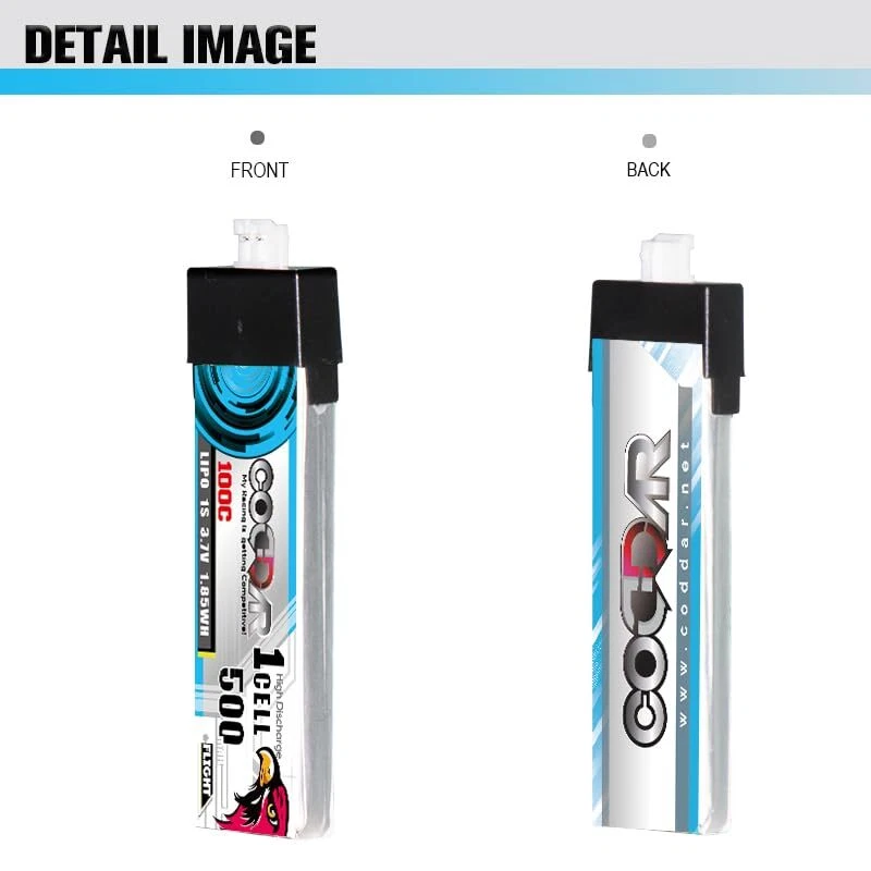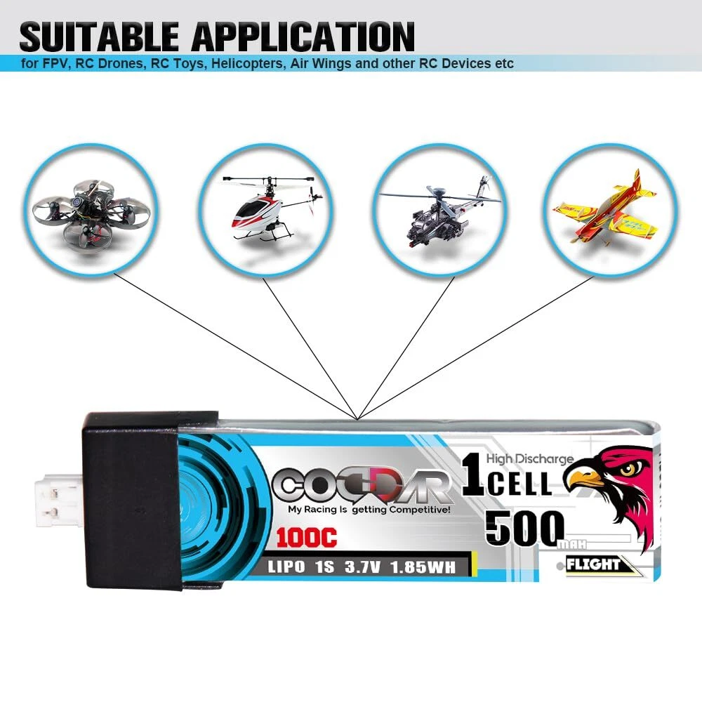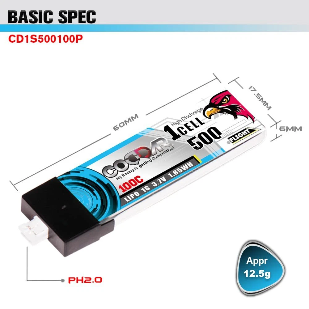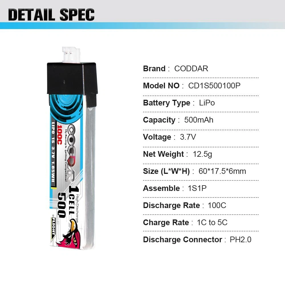 About CODDARCODDAR's main goal is R&D (Research and development), manufacturing and production of high-quality battery products. We are an independent company and offer a global service with technical support and products tailor-made to suit the needs of the radio control market.Product SpecificationsPart#: CD1S500100PProduct Type: LiPo BatteryNominal Capacity: 500mAhNominal Voltage: 3.7V (1S)Net Weight: 12.5g (+/-1g)Discharge Rate: 100CDimension: 60(L)*17(W)*6(H)mmDischarge Connector: PH2.0 with Plastic HeadStandard Charging Current: 1CRapid Charging Current: 3C to 5CCharge Cut-off Voltage: 4.20V per cellDischarge Cut-off Voltage: 3.0V per cellPackage Contents4x battery 1x instruction sheet. Suitable ApplicationsIt is suitable for 75mm FPV Drone, Emax Tinyhawk S, NanoHawk, EZ Pilot , Happymodel Mobula6 Mobula7 Snapper, GEPRC Cinewhoop, Indoor FPV Kit, Spare RC Parts, RC Toy, Airplane, Racing FPV, Brushless Drones, Quads, Quadcopter, Helicopter or other RC devices etcPlease us if you are unsure if the battery suit for your device, we will reply you within 24 business hours.Warnings! Safely discharge and discard of battery if physically damagedStore in a fireproof container away from flammable materialsDo not exceed the charge or discharge rating of the batteryDo not charge unattended or near flammable materialsOnly use chargers designed for LiPo batteries Specifications: 500mAh 1S 3.7V 100C LiPo with Genuine Amass PH2.0 with Plastic Head, Dimension 60(L)*17.5(W)*6(H)mm, Appr. Weight 12.5g Performance: LiPo have an awesome discharge performance, manufactured with Top-raw materials to ensure even delivery of power with minimal voltage sag under heavy loads Quality Control: each battery well control the test before ship to warehouse to ensure you will get the best quality products Suitable Devices: 75mm FPV Drone, Emax Tinyhawk S, NanoHawk, EZ Pilot , Happymodel Mobula6 Mobula7 Snapper, GEPRC Cinewhoop, Indoor FPV Kit, Spare RC Parts, RC Toy, Airplane, Racing FPV, Brushless Drones, Quads, Quadcopter, Helicopter etc. or other RC devices, you could us if unsure