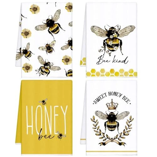 Features: Kitchen gifts: These farmhouse tea towels are thoughtful gifts for your family, friends and cooking enthusiasts at housewarming parties, birthday parties, Thanksgiving, Christmas and other occasions. Practical cleaning functions: The bee bathroom hand towels are very suitable for cleaning dishes, counters, drying dishes, TV sets, furniture and tiles, which will be good home and kitchen helpers. Specifications: Material: polyester Color: as pictures shown Size: about 40 x 60 cm/ 16 x 24 inches Package includes: 4 x Bee and flower dish towels Notes: Manual measurement, please allow slight errors on size. The color may exist slight differences due to different screen display. Various Styles: you will receive 4 different styles of dish towels, enough to meet your daily replacement and different washing and drying needs, and it is also a good idea to share with your family and friends Cute Bee Designs: each bee and flower tea towel comes with an innovative design pattern, the main black, white and yellow color mix is full of farmhouse sense, and lovely bee patterns will add more fun to your kitchen decor Use for a Long Period: these cute towels are made from reliable polyester, and do not scratch your hands or skin, which are tasteless, resistant to wear and tear, and do not fade or break easily, making them proper for a long term use; If you feel that the softness is not enough, you can use it after wetting Versatile Occasions: these lovely hand towels can be applied in a variety of places, such as kitchens, restaurants, hotels, offices, gyms, markets, cafes, sweet shops, shops, bathrooms, canteen and other occasions, and they can be easily hung with the hook design Considerate Size: bee and flower holiday tea towels are about 40 x 60 cm/ 16 x 24 inches, they are of a reasonable size and are easy to carry and store, can be put in a drawer or cabinet when not in use without taking up too much space, to keep the kitchen clean