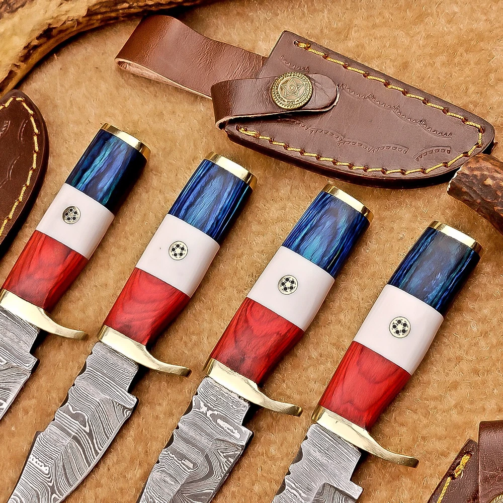 LOT OF 4 PCS! Handmade Damascus Hunting Knives – Multicolor Wood Handles Specifications: Overall Length: 6.00" Blade Thickness: ~4 mm Blade Material: Damascus Steel Handle Material: Multicolor wood and camel bone with mosaic pin with hand casted brass bolster. Includes: Leather sheaths Blade Craftsmanship: Blades are made from 1095 & 15N20 High Carbon Tool Steel with over 256 layers and a hardness of 58-60 HRC for durability and sharpness. Spine of the blade tang has excellent fire work Care Instructions: Sharpen with a Diamond Wet Stone at a 20-degree angle. Clean with soap and water, dry thoroughly, and apply gun oil. Store away from the sheath to prevent rust. Important Notes for Buyers: Verify your country’s import regulations before purchase. Customs duties, if any, are the buyer’s responsibility. Shipping & Returns: Free shipping included. 14-day return policy applies. Contact Us: Message us anytime. We respond within 24 hours.