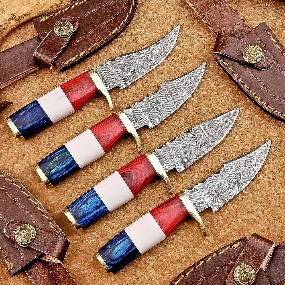 LOT OF 4 PCS! Handmade Damascus Hunting Knives – Multicolor Wood Handles Specifications: Overall Length: 6.00" Blade Thickness: ~4 mm Blade Material: Damascus Steel Handle Material: Multicolor wood and camel bone with mosaic pin with hand casted brass bolster. Includes: Leather sheaths Blade Craftsmanship: Blades are made from 1095 & 15N20 High Carbon Tool Steel with over 256 layers and a hardness of 58-60 HRC for durability and sharpness. Spine of the blade tang has excellent fire work Care Instructions: Sharpen with a Diamond Wet Stone at a 20-degree angle. Clean with soap and water, dry thoroughly, and apply gun oil. Store away from the sheath to prevent rust. Important Notes for Buyers: Verify your country’s import regulations before purchase. Customs duties, if any, are the buyer’s responsibility. Shipping & Returns: Free shipping included. 14-day return policy applies. Contact Us: Message us anytime. We respond within 24 hours.