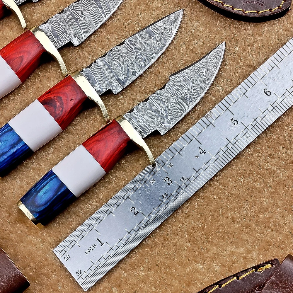 LOT OF 4 PCS! Handmade Damascus Hunting Knives – Multicolor Wood Handles Specifications: Overall Length: 6.5" Blade Thickness: ~4 mm Blade Material: Damascus Steel Handle Material: Multicolor wood and camel bone with mosaic pin with hand casted brass bolster. Includes: Leather sheaths Blade Craftsmanship: Blades are made from 1095 & 15N20 High Carbon Tool Steel with over 256 layers and a hardness of 58-60 HRC for durability and sharpness. Spine of the blade tang has excellent fire work Care Instructions: Sharpen with a Diamond Wet Stone at a 20-degree angle. Clean with soap and water, dry thoroughly, and apply gun oil. Store away from the sheath to prevent rust. Important Notes for Buyers: Verify your country’s import regulations before purchase. Customs duties, if any, are the buyer’s responsibility. Shipping & Returns: Free shipping included. 14-day return policy applies. Contact Us: Message us anytime. We respond within 24 hours.