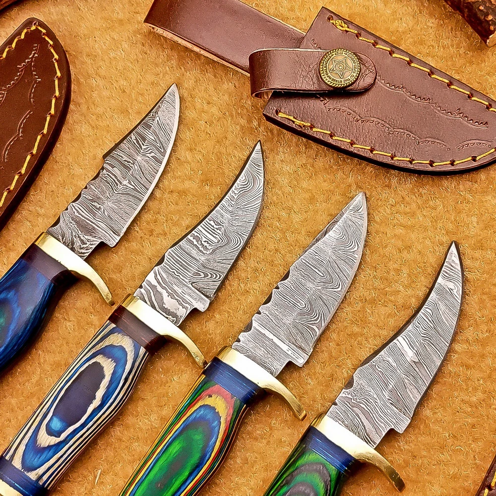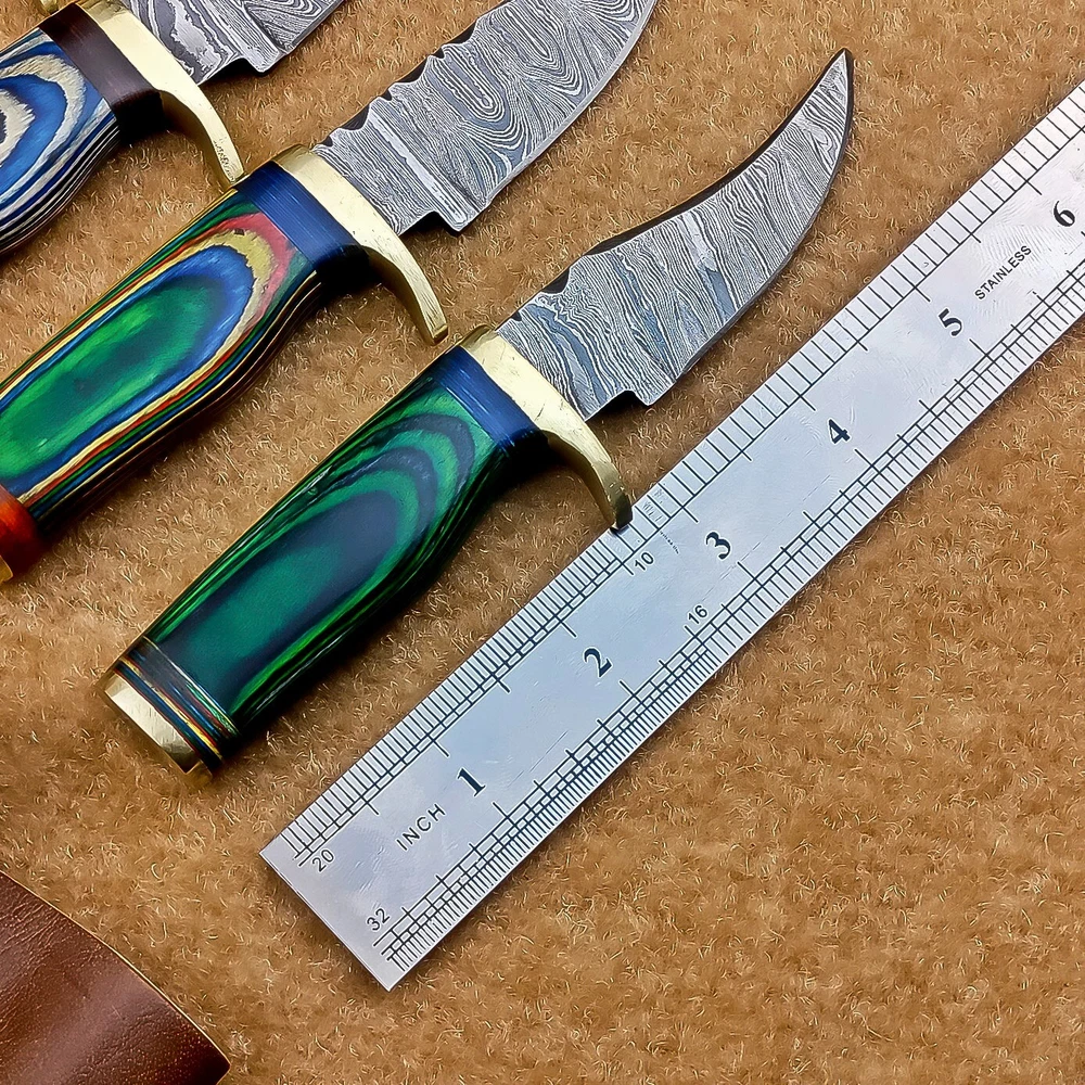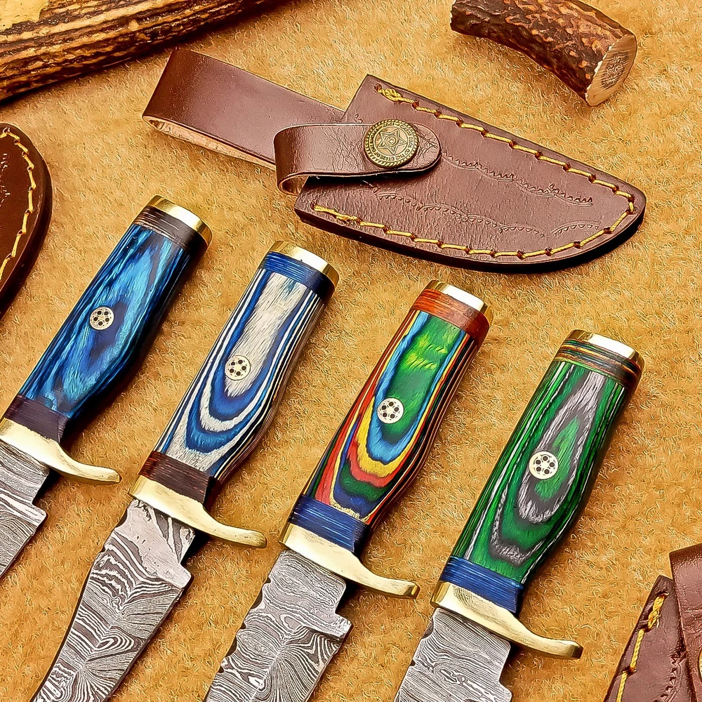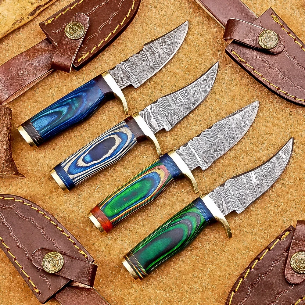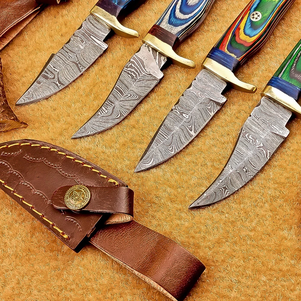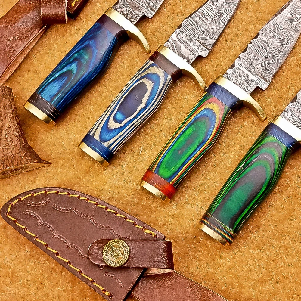 LOT OF 4 PCS! Handmade Damascus Hunting Knives – Multicolor Wood Handles Specifications: Overall Length: 6.00" Blade Thickness: ~4 mm Blade Material: Damascus Steel Handle Material: Multicolor wood with mosaic pins & hand casted brass bolster. Includes: Leather sheaths Blade Craftsmanship: Blades are made from 1095 & 15N20 High Carbon Tool Steel with over 256 layers and a hardness of 58-60 HRC for durability and sharpness. Spine of the blade tang has Excellent fire work Care Instructions: Sharpen with a Diamond Wet Stone at a 20-degree angle. Clean with soap and water, dry thoroughly, and apply gun oil. Store away from the sheath to prevent rust. Important Notes for Buyers: Verify your country’s import regulations before purchase. Customs duties, if any, are the buyer’s responsibility. Shipping & Returns: Free shipping included. 14-day return policy applies. Contact Us: Message us anytime. We respond within 24 hours.