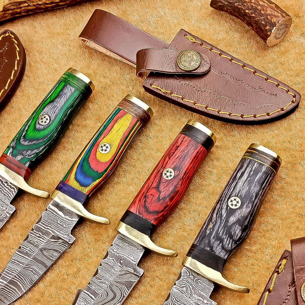 LOT OF 4 PCS! Handmade Damascus Hunting Knives – Multicolor Wood Handles Specifications: Overall Length: 6.00" Blade Thickness: ~4 mm Blade Material: Damascus Steel Handle Material: Multicolor wood with mosaic pins & hand casted brass bolster. Includes: Leather sheaths Blade Craftsmanship: Blades are made from 1095 & 15N20 High Carbon Tool Steel with over 256 layers and a hardness of 58-60 HRC for durability and sharpness. Spine of the blade tang has Excellent fire work Care Instructions: Sharpen with a Diamond Wet Stone at a 20-degree angle. Clean with soap and water, dry thoroughly, and apply gun oil. Store away from the sheath to prevent rust. Important Notes for Buyers: Verify your country’s import regulations before purchase. Customs duties, if any, are the buyer’s responsibility. Shipping & Returns: Free shipping included. 14-day return policy applies. Contact Us: Message us anytime. We respond within 24 hours.